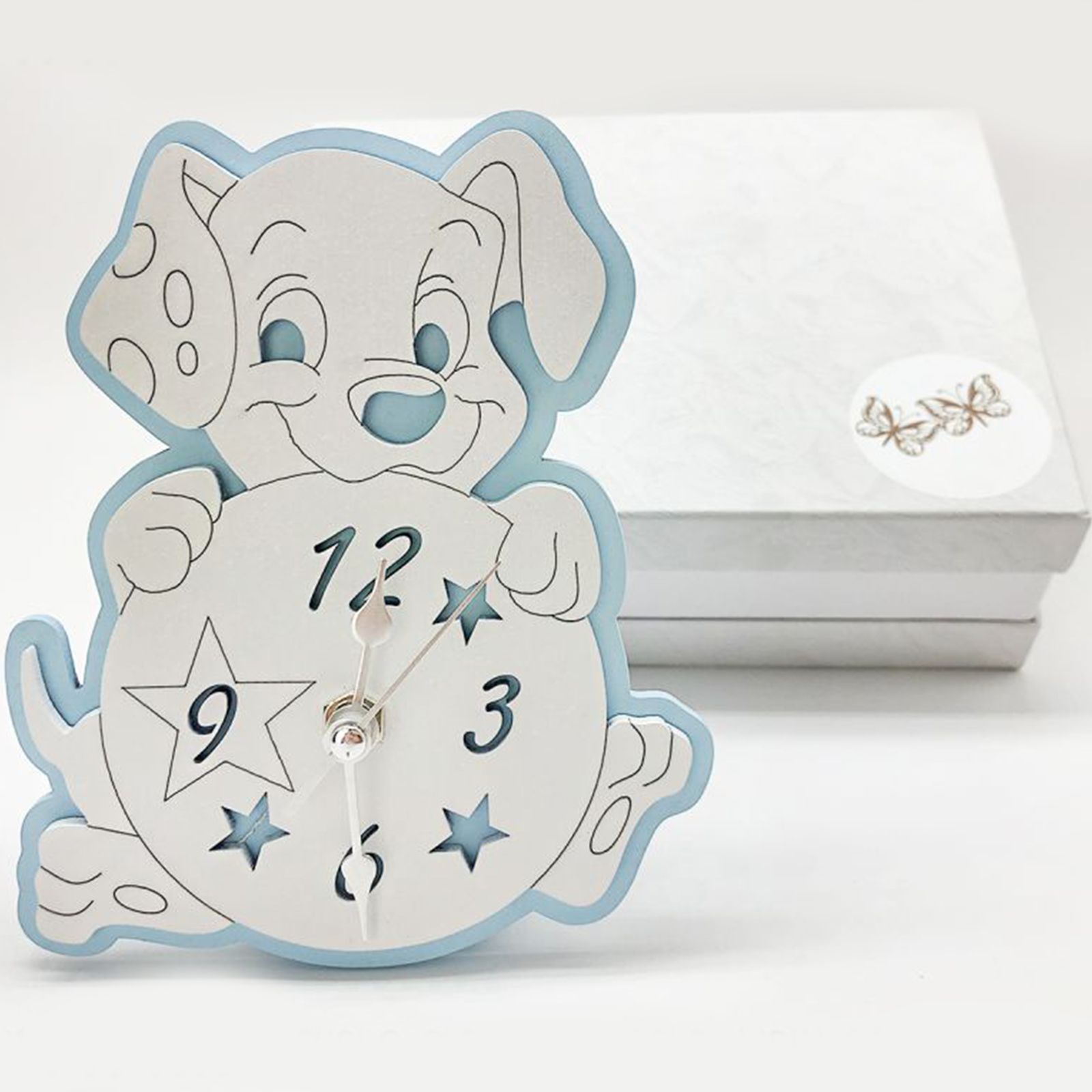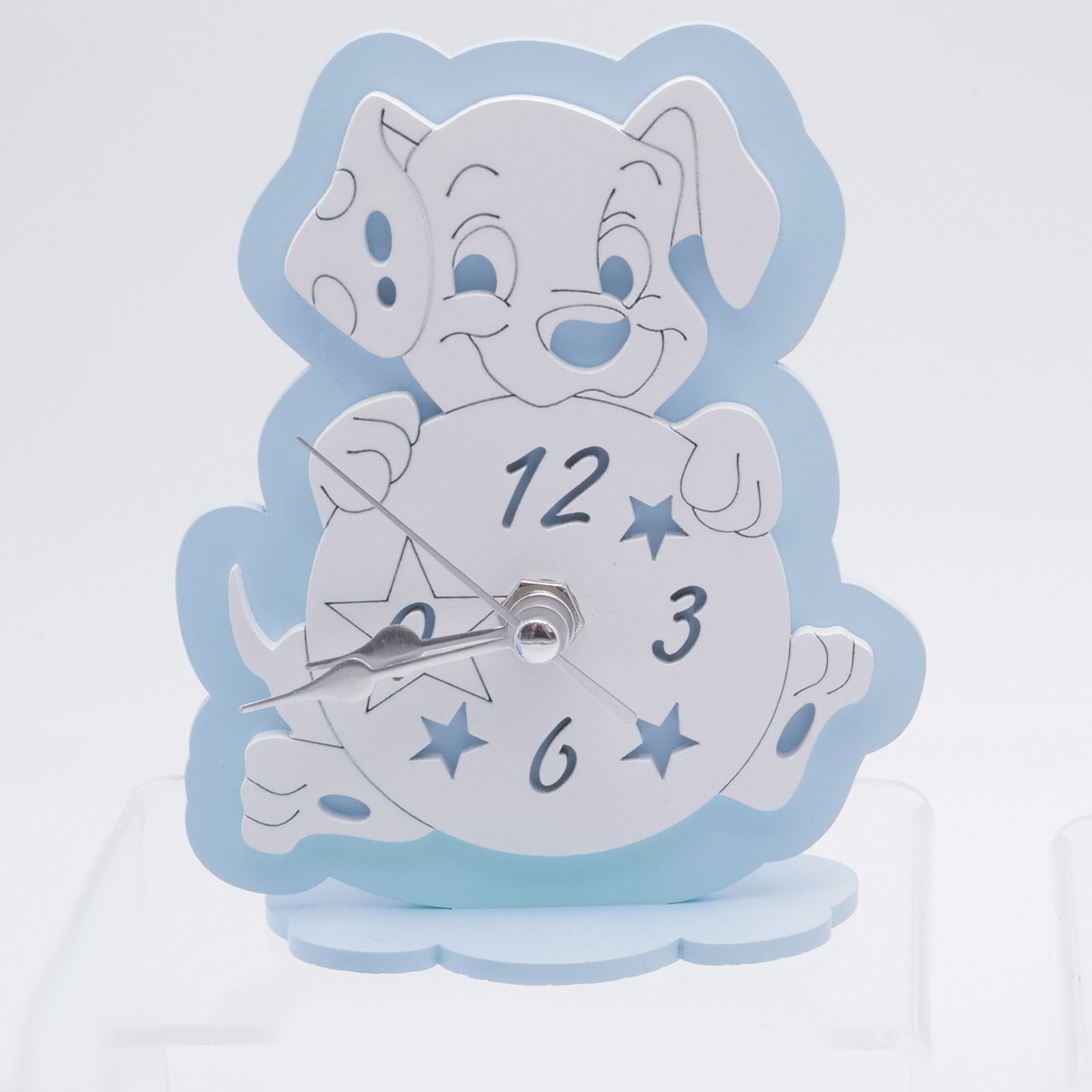 Orologio in legno azzurro e bianco raffigurante un simpatico cagnolino, che richiama il famoso dalmata del cartoon Disney La carica dei 101. Raffigurato in posizione seduta, con una sfera tra le zampe, che rappresenta il quadrante dell'orologio, decorato con stelline e numeri incisi.