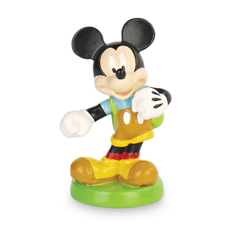 Piccole statuine Mickey Mouse Disney: Topolino è raffigurato su una base verde, sorridente, con zaino in spalla, pronto per una gita/escursione/avventura. Statuette Topolino ideali per realizzare bomboniere battesimo Disney economiche o per bomboniere compleanno 1 anno bambino.