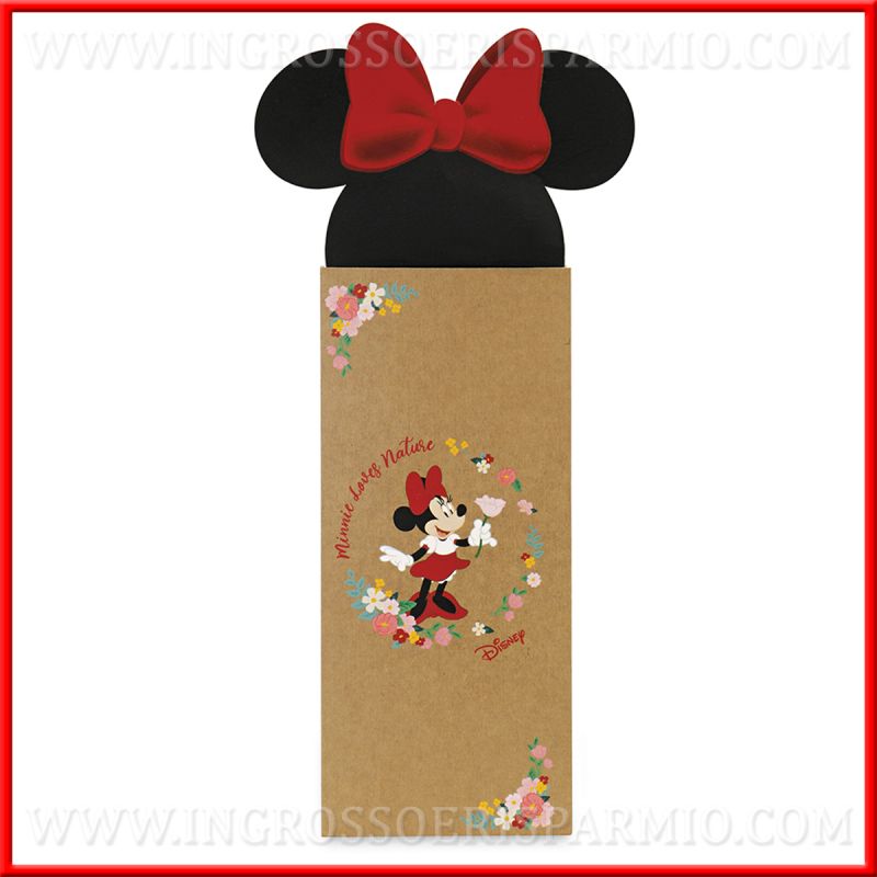 Portachiavi Disney 3 ciondoli, in metallo, con soggetto principale ciondolo Minnie, elegante e graziosa, con una rosa in mano e un tappeto di fiori alla base. Gli altri due ciondoli pendenti dall'anello portachiavi sono una borsetta rosa ed un'etichetta in tessuto rosa con la scritta "Minnie♥Nature".