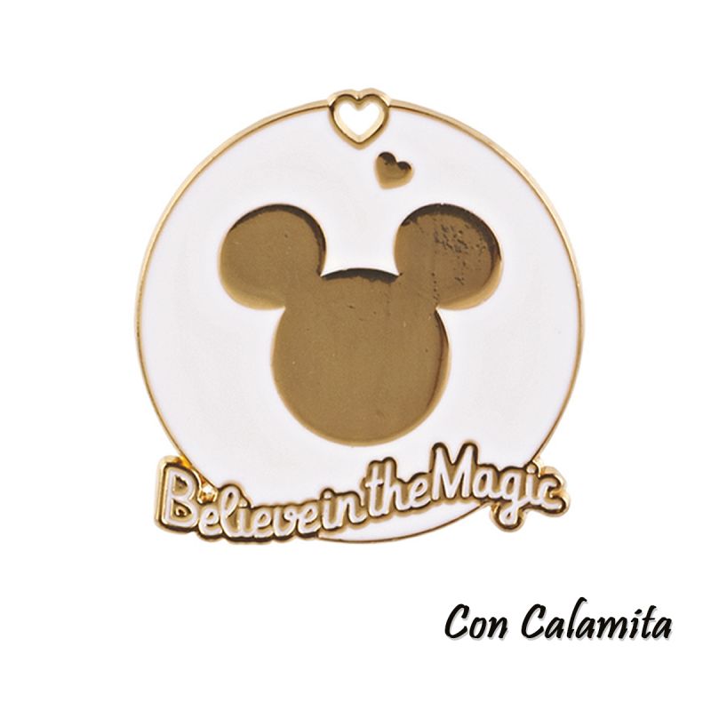 Calamita Topolino realizzata in metallo bianco e oro, di forma rotonda, con raffigurazione centrale della sagoma di Mickey Mouse e scritta "Belive in the Magic" (credere nella magia). Magneti Disney perfetti non solo per eventi di bambini, ma anche per ragazzi e adulti (come bomboniere compleanno, 18 anni) con la passione per il magico mondo Disney.