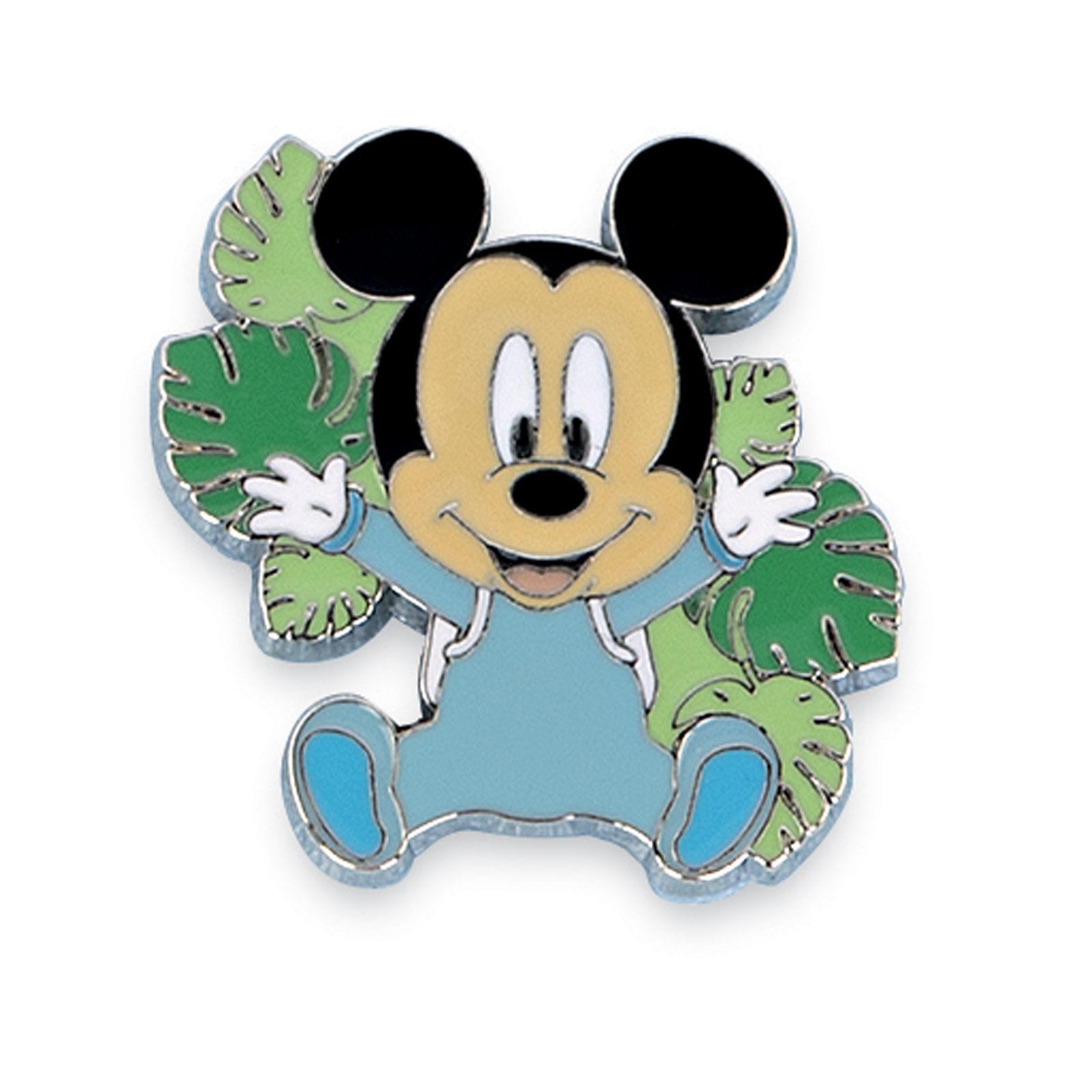Simpatiche calamite a forma di baby Mickey Mouse con tutina celeste circondato da foglie di diversi colori.