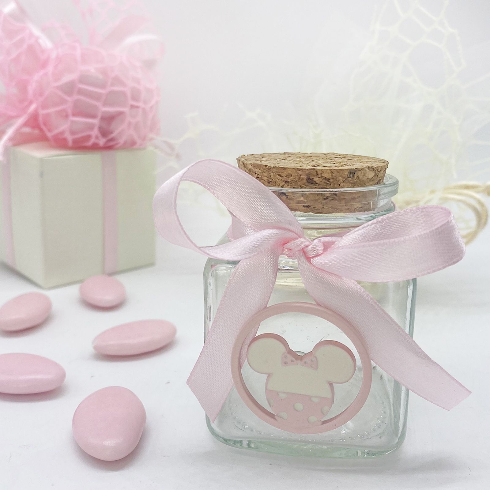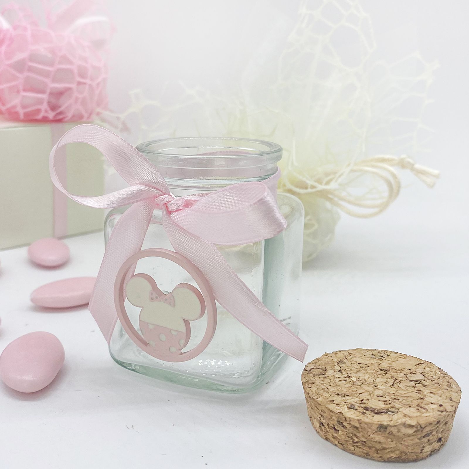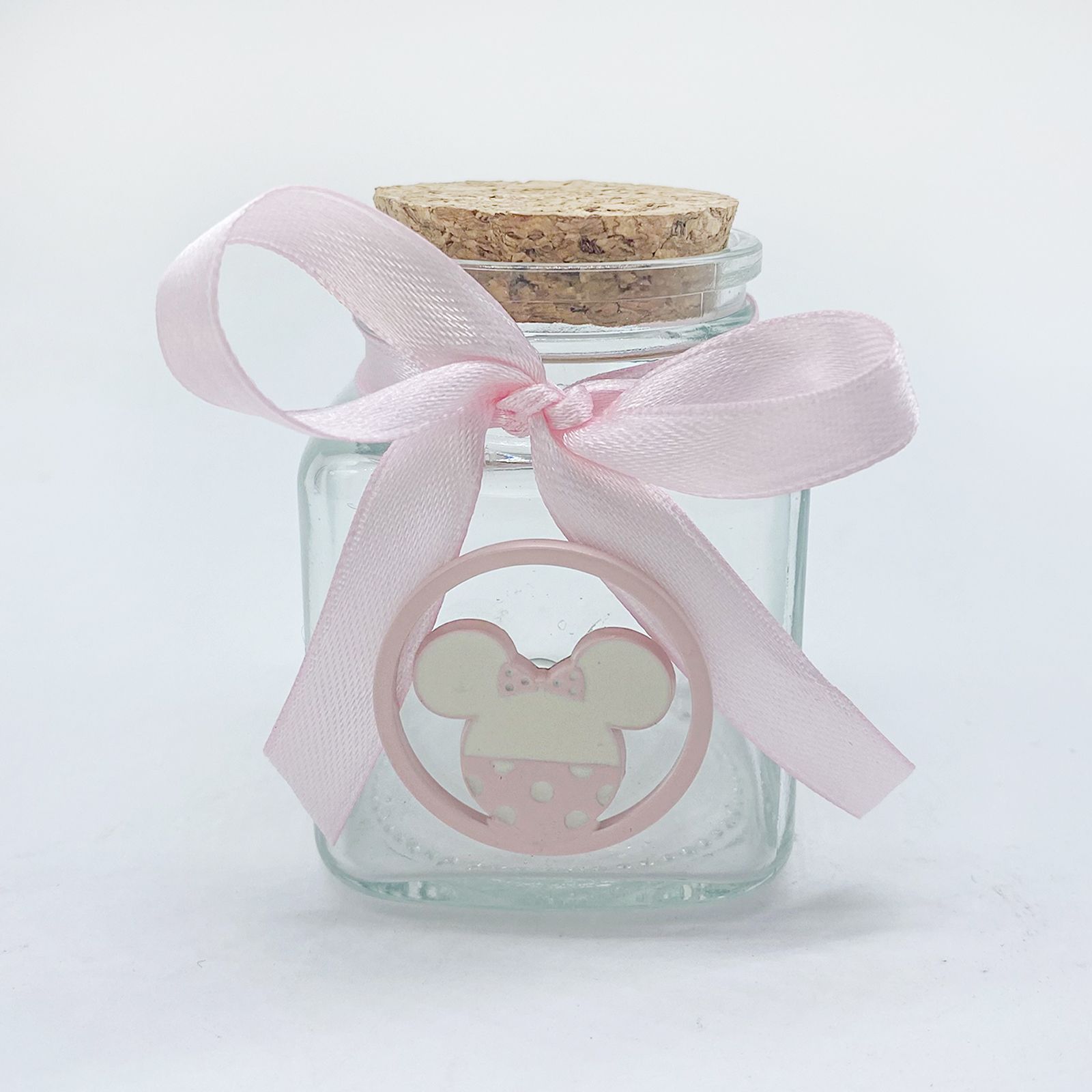 Questo barattolo vasetto in vetro, con tappo ermetico di sughero, è una creazione delicata che incarna la magia Disney in ogni dettaglio. La sua forma offre uno spazio ideale per contenere spezie, confetti o altri piccoli tesori. La decorazione in metallo sulla parte frontale rappresenta la sagoma di Minnie Mouse, con colori rosa chiaro e bianco che si sposano perfettamente con l'atmosfera del battesimo.