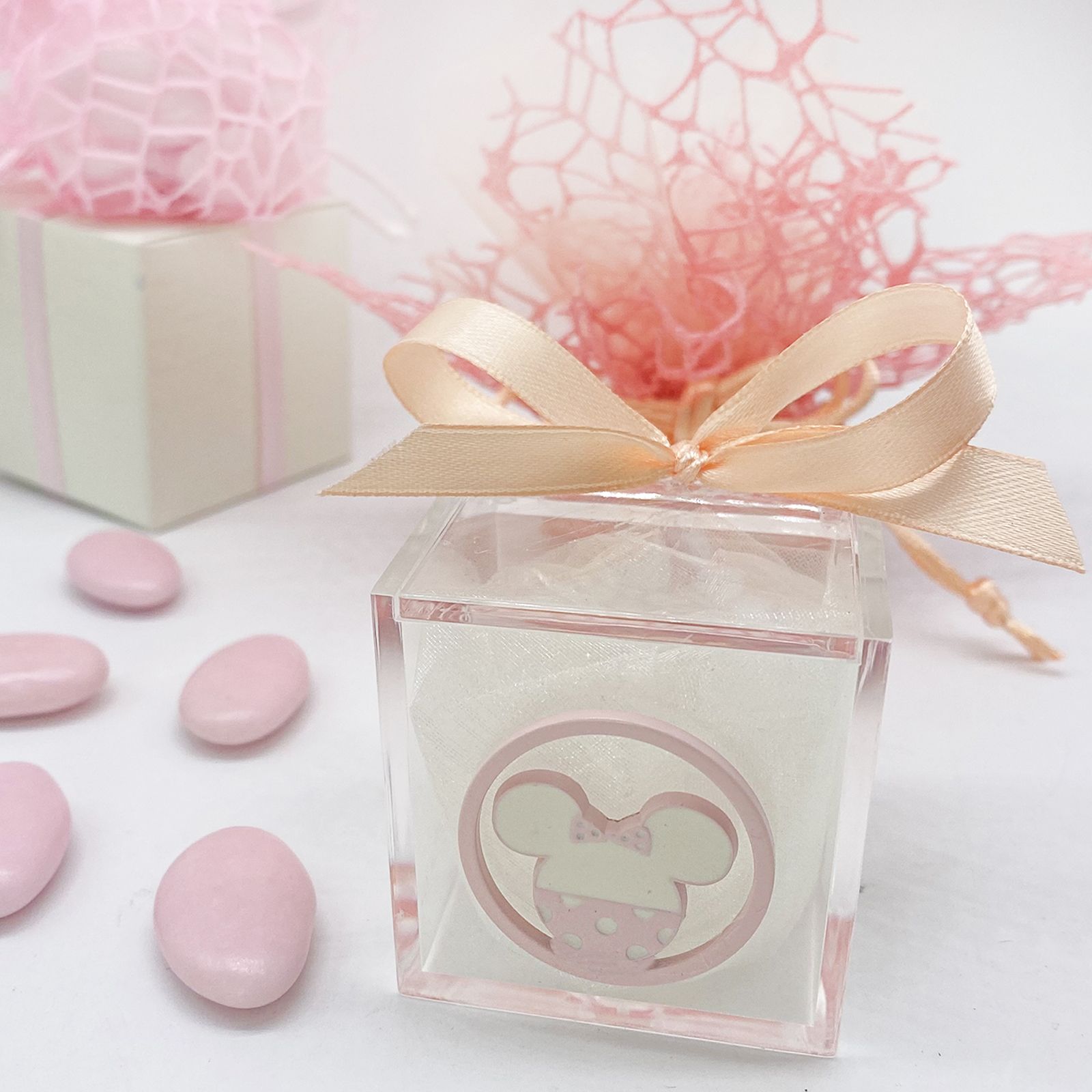 Esalta il tuo evento speciale con le nostre scatole in plexiglass a forma di cubo, un'elegante e dolce scelta per le bomboniere di battesimo.