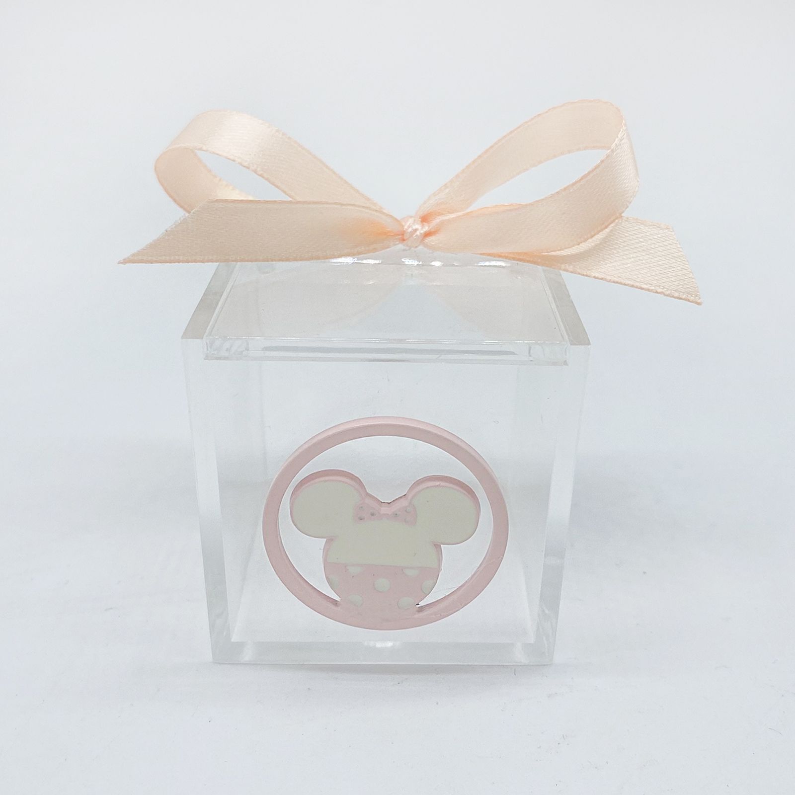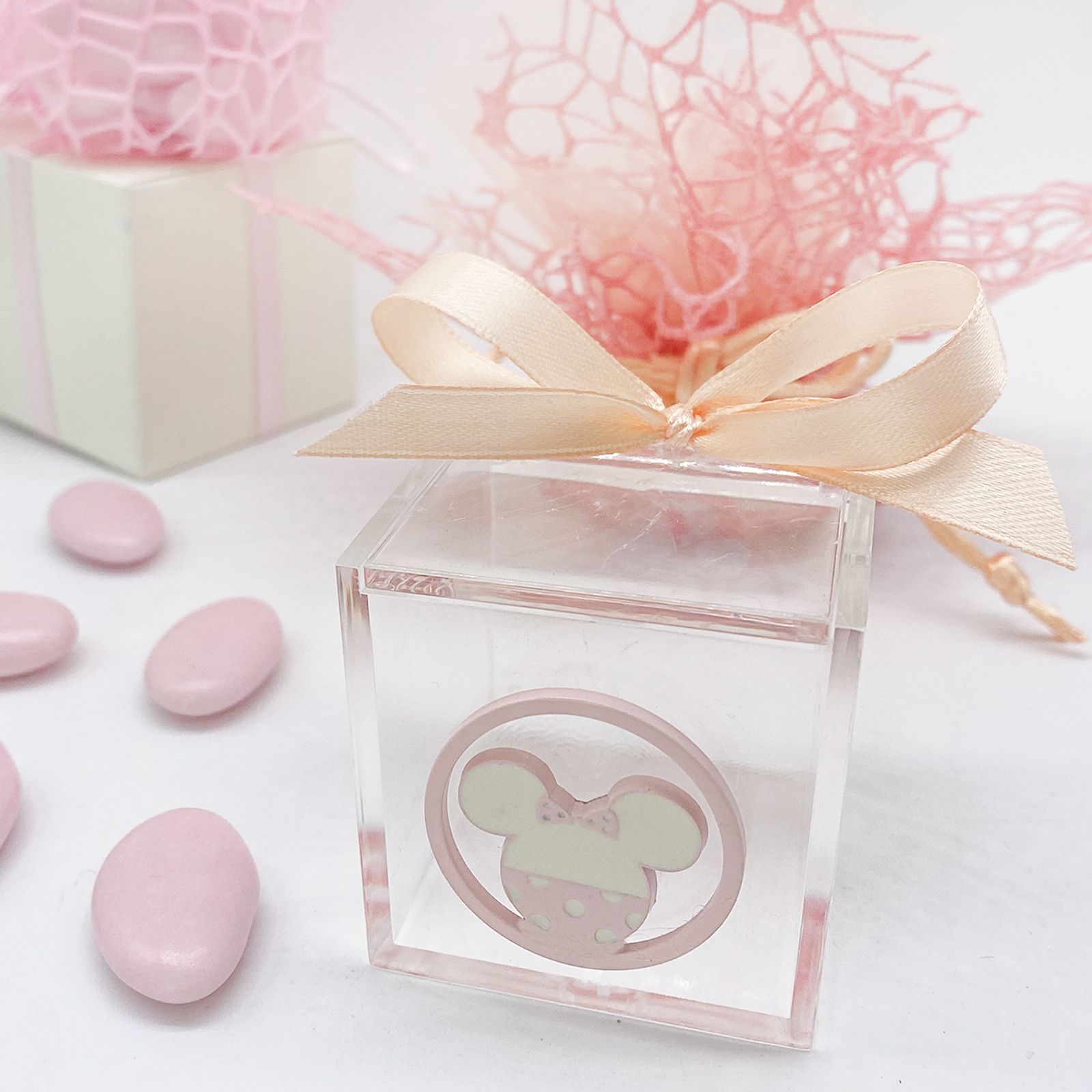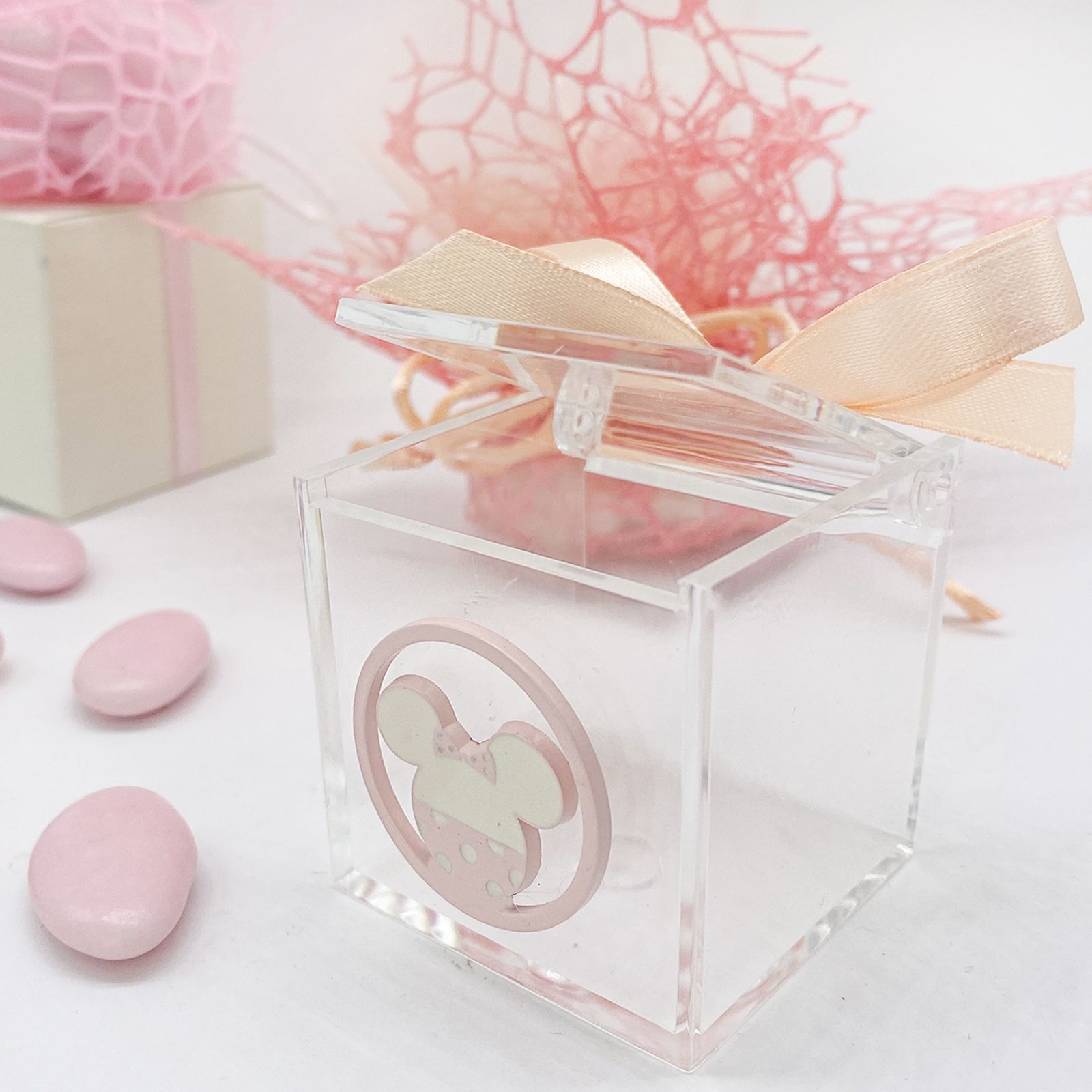 Queste scatole trasparenti, dall'armonioso design classico e moderno, sono ideali come portaconfetti, segnaposto, o pensierini. Ogni scatola è valorizzata da un ciondolo in metallo rosa e bianco, rotondo, raffigurante la tenera testa di Topolino, l'amatissimo personaggio Disney. Realizzate con plexiglass di alta qualità, queste scatole a forma di cubo sono un tocco di grazia per ogni occasione.