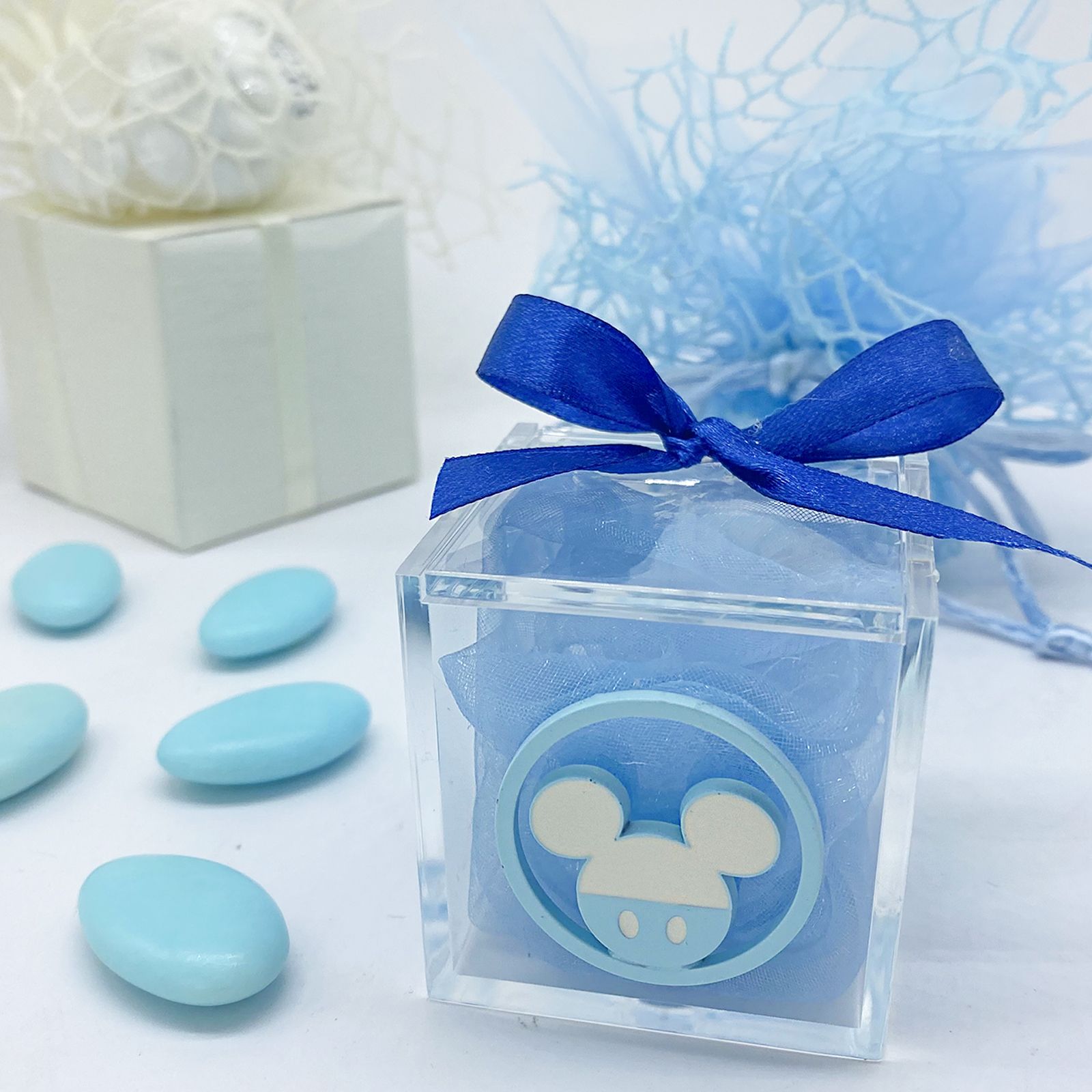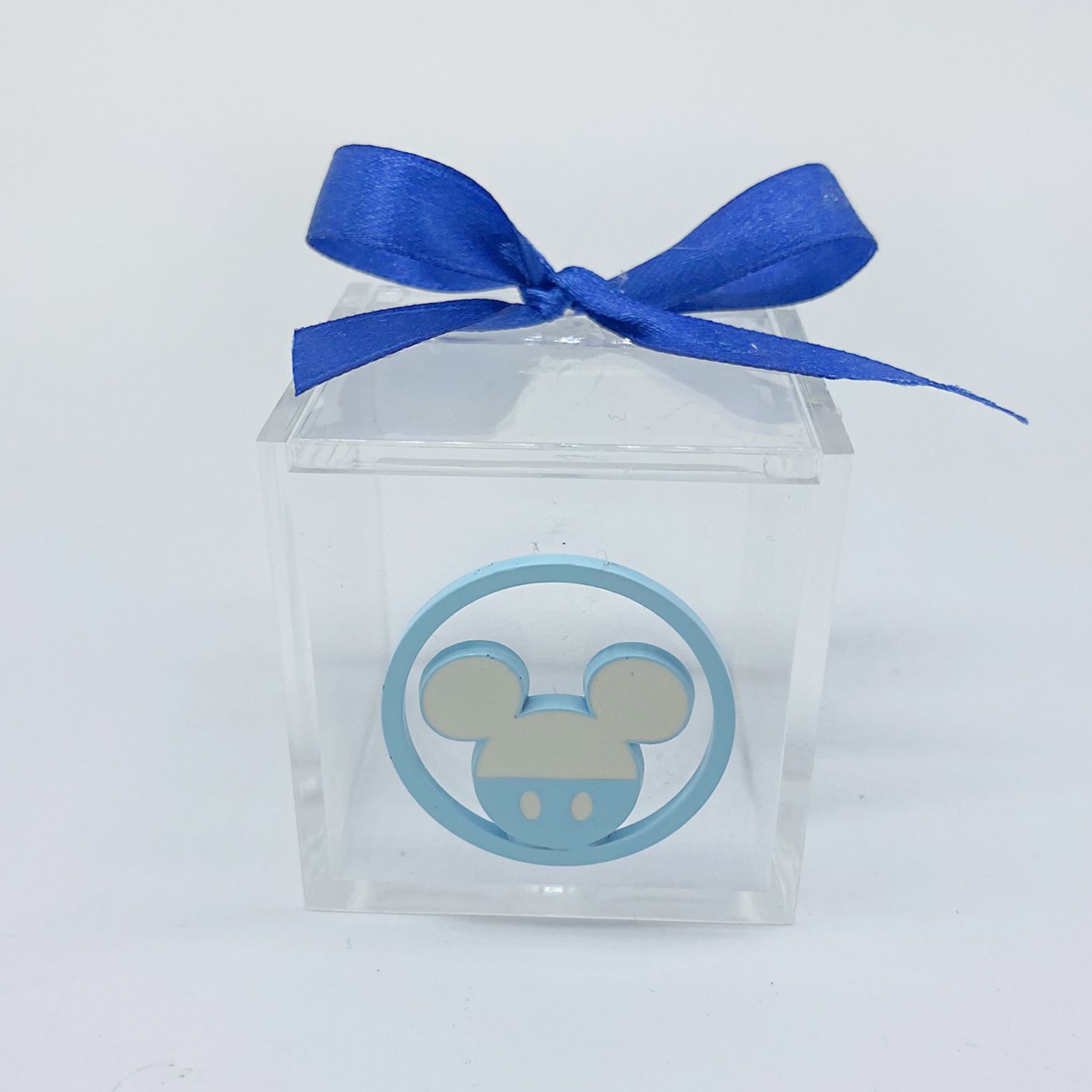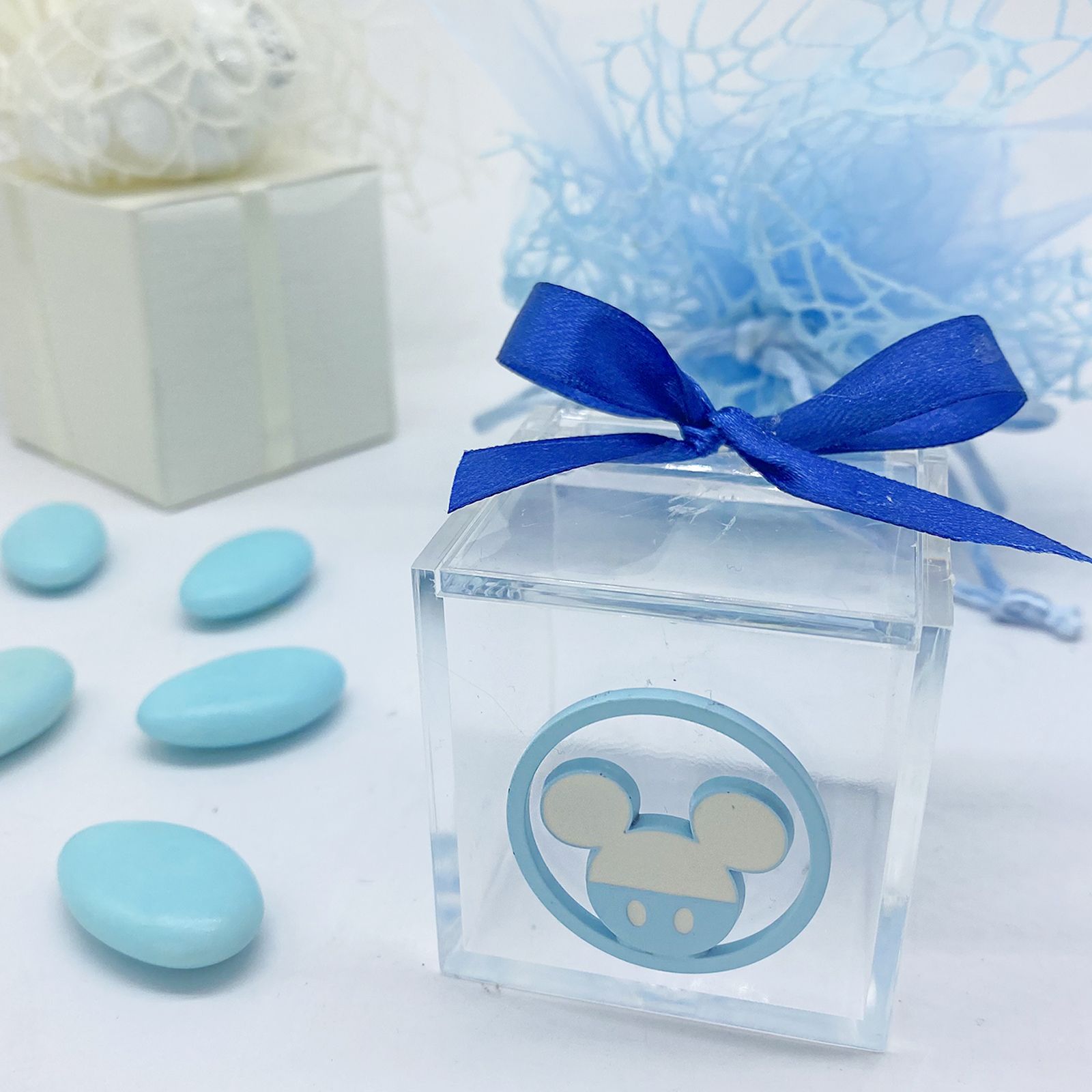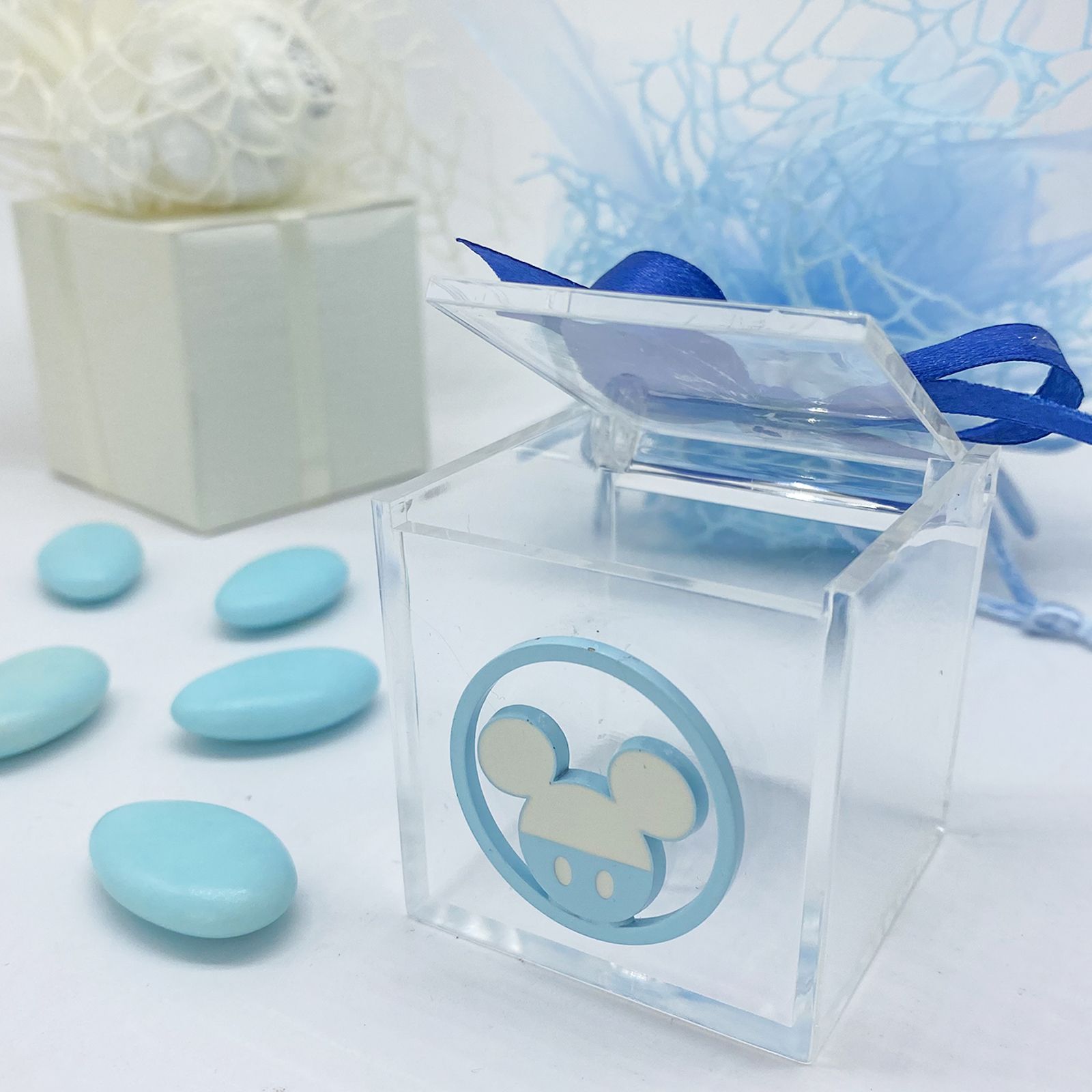 Queste scatole trasparenti, dal design classico e moderno, sono ideali come portaconfetti, segnaposto, o pensierini di fine festa. Ogni scatola è arricchita da un ciondolo in metallo azzurro, rotondo, raffigurante la simpatica testa di Topolino, l'amato personaggio Disney. Realizzate con plexiglass di alta qualità, queste scatole cubiche sono un tocco raffinato per qualsiasi evento.