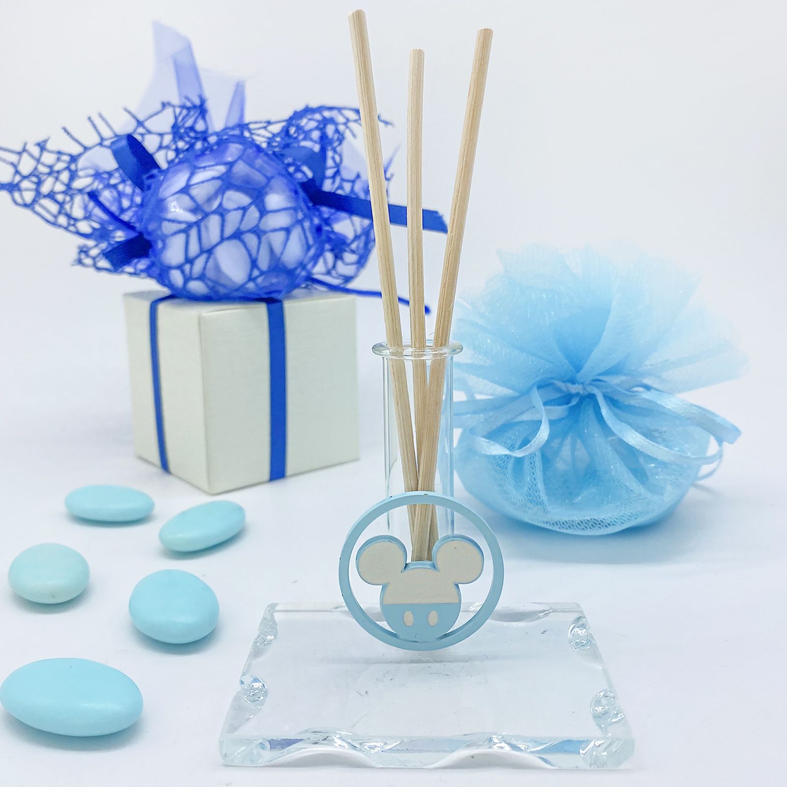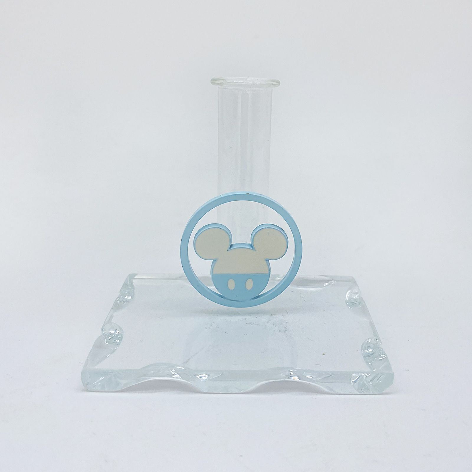 La fiala può essere utilizzata come profumatore, diffondendo fragranze delicate, ma può anche diventare un vaso per un unico fiore o un pratico porta penne. Sulla parte frontale della fiala, troverete un ciondolo rotondo di Topolino in metallo azzurro, con la sagoma della testa dell'amato personaggio Disney.