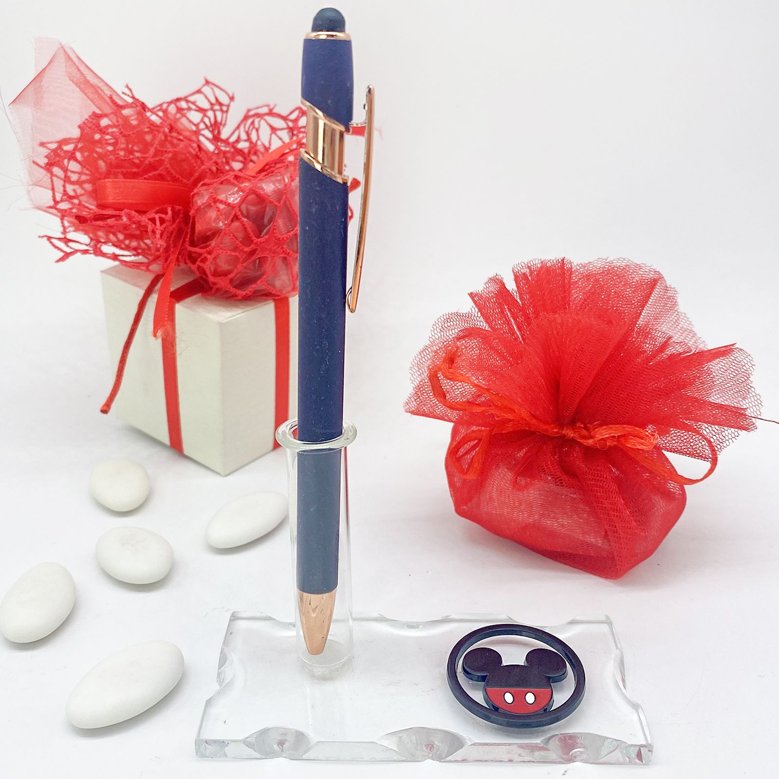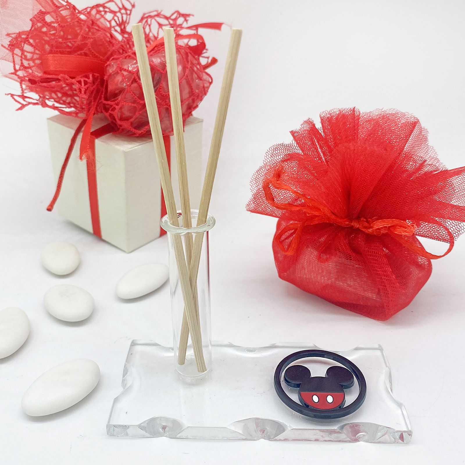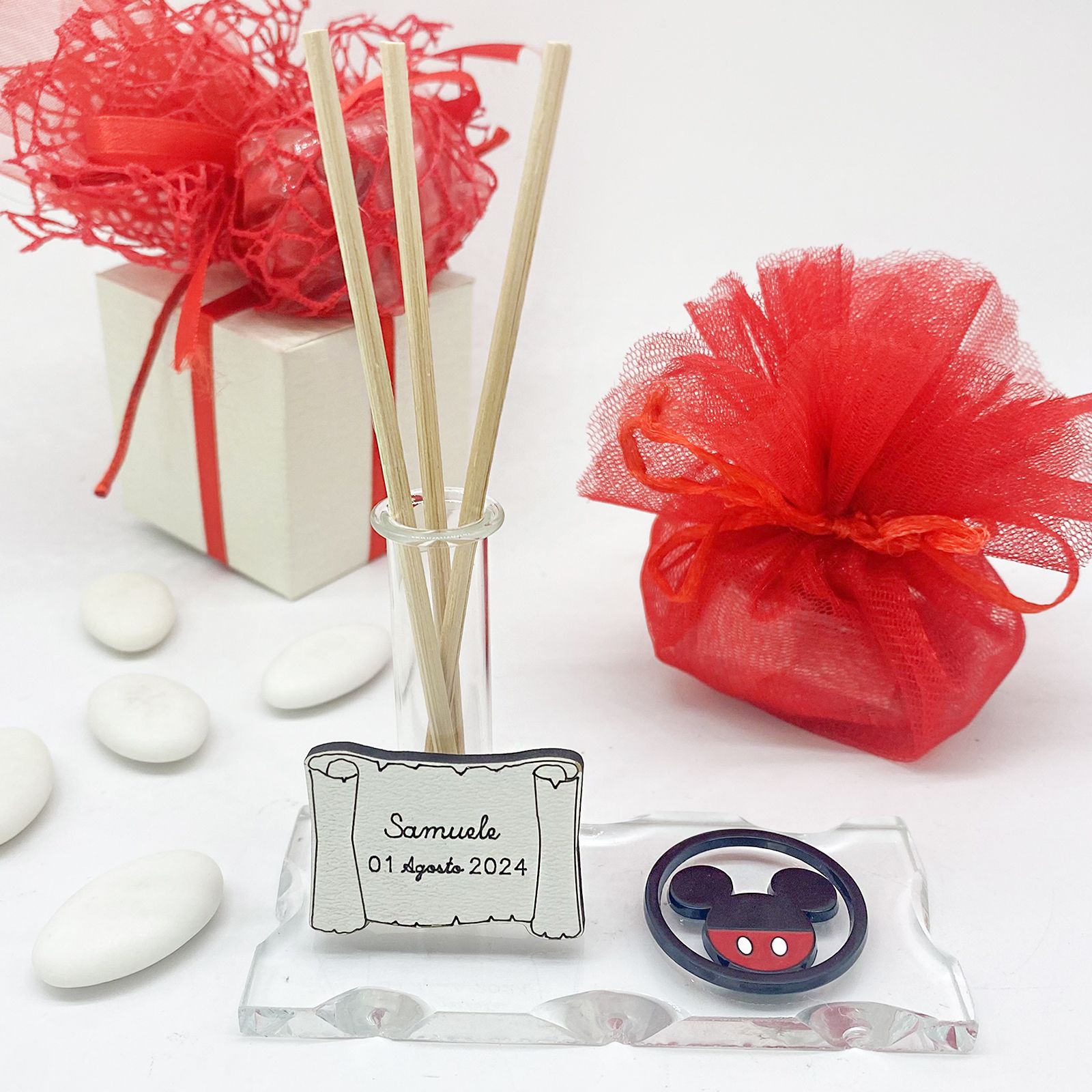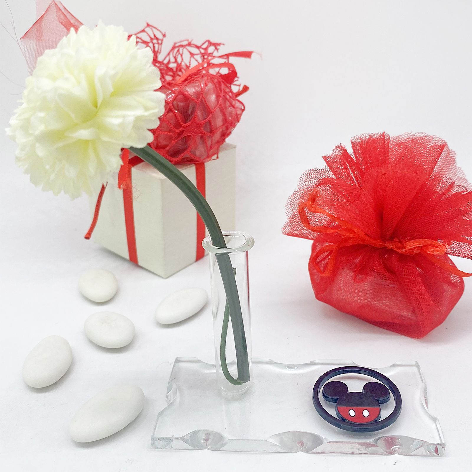Esplora la versatilità delle celebrazioni con la nostra Base in Vetro con Fiala Profumatore - Monofiore - Porta Penna con Applicazione Disney Mickey Mouse. Questa bomboniera straordinaria è pensata per catturare l'essenza di ogni momento speciale. La base in vetro soffiato intagliato ospita un'ampolla fiala multifunzionale, che può essere usata come diffusore d'ambiente, porta penne o monofiore. Accanto all'ampolla sulla base, troverai un affascinante Ciondolo Disney Mickey Mouse realizzato in metallo, con la sagoma rotonda della testa di Topolino, nelle classiche tonalità del rosso e del nero. Questo ciondolo aggiunge un tocco di magia a ogni dettaglio.