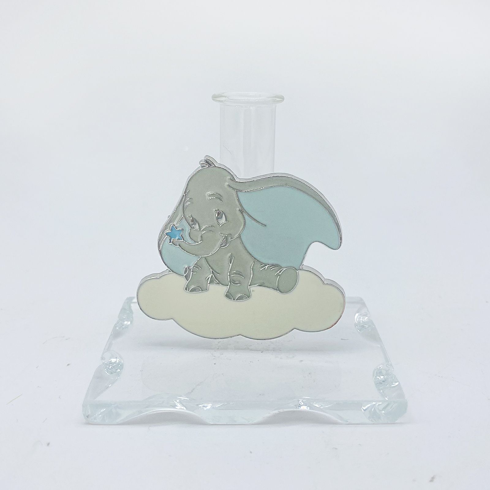 Davanti alla fiala una graziosa Applicazione Disney Dumbo piatta realizzata in metallo argentato e colorato che raffigura l'amato elefantino su una nuvola, con una stellina azzurra sulla proboscide. Un tocco magico per una bomboniera davvero speciale.