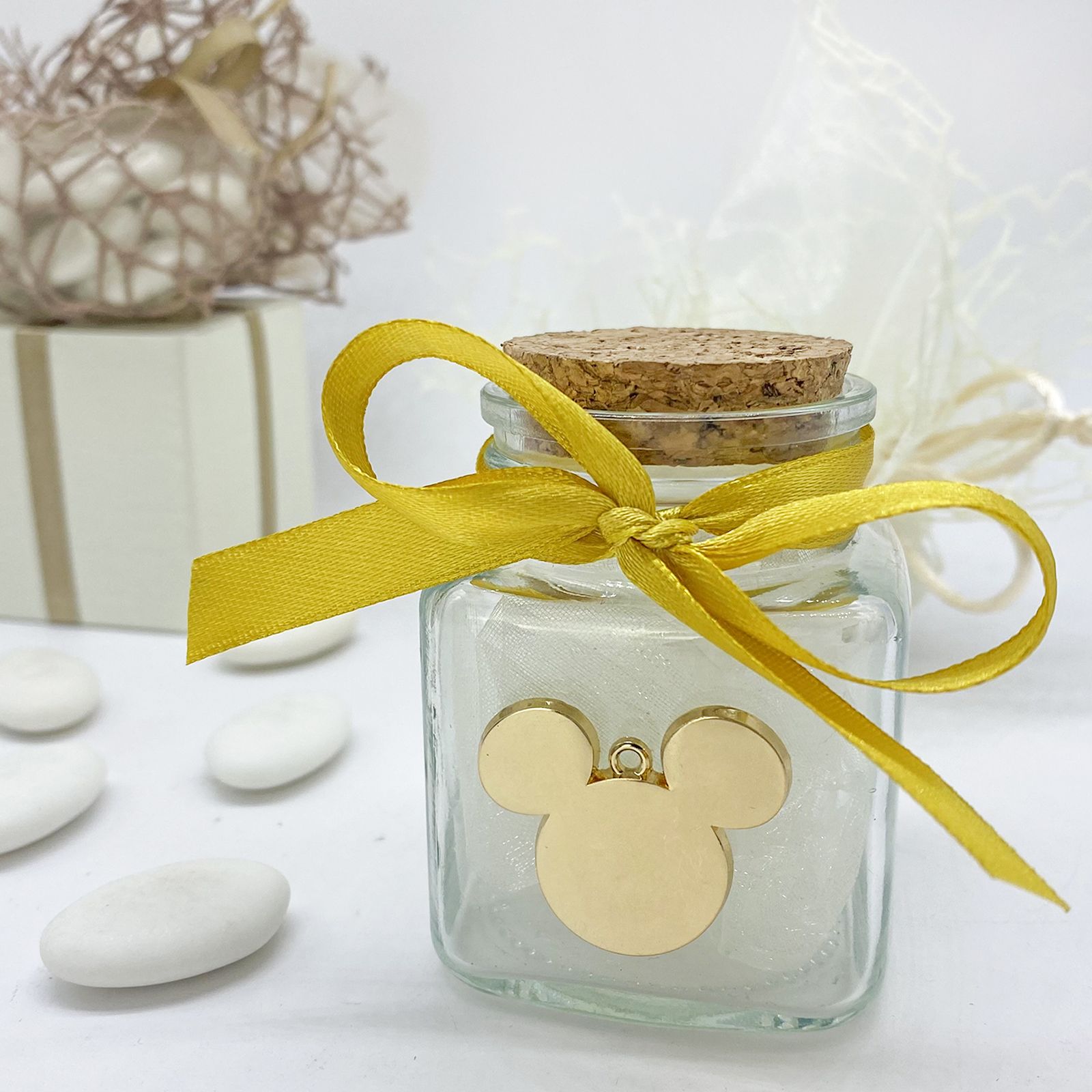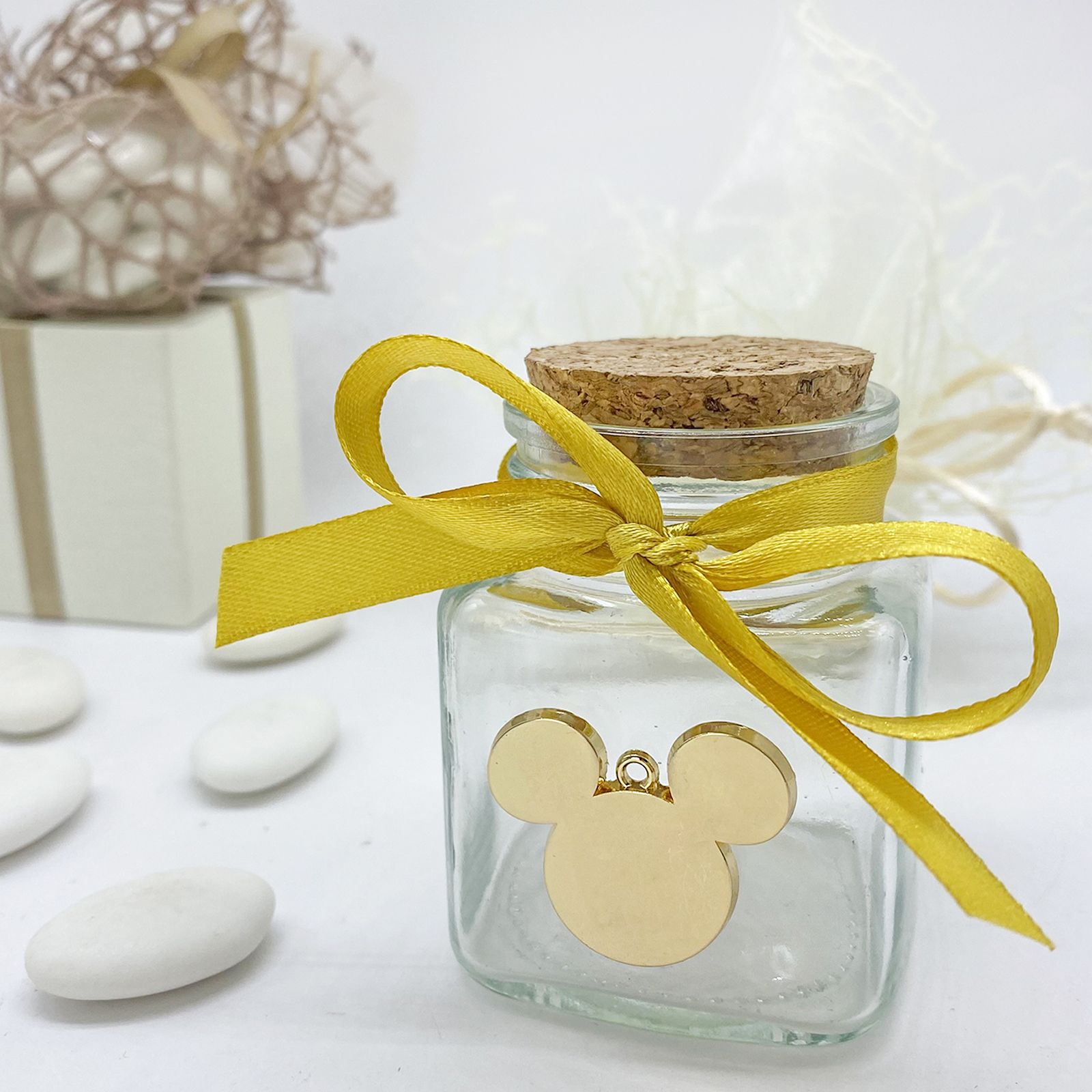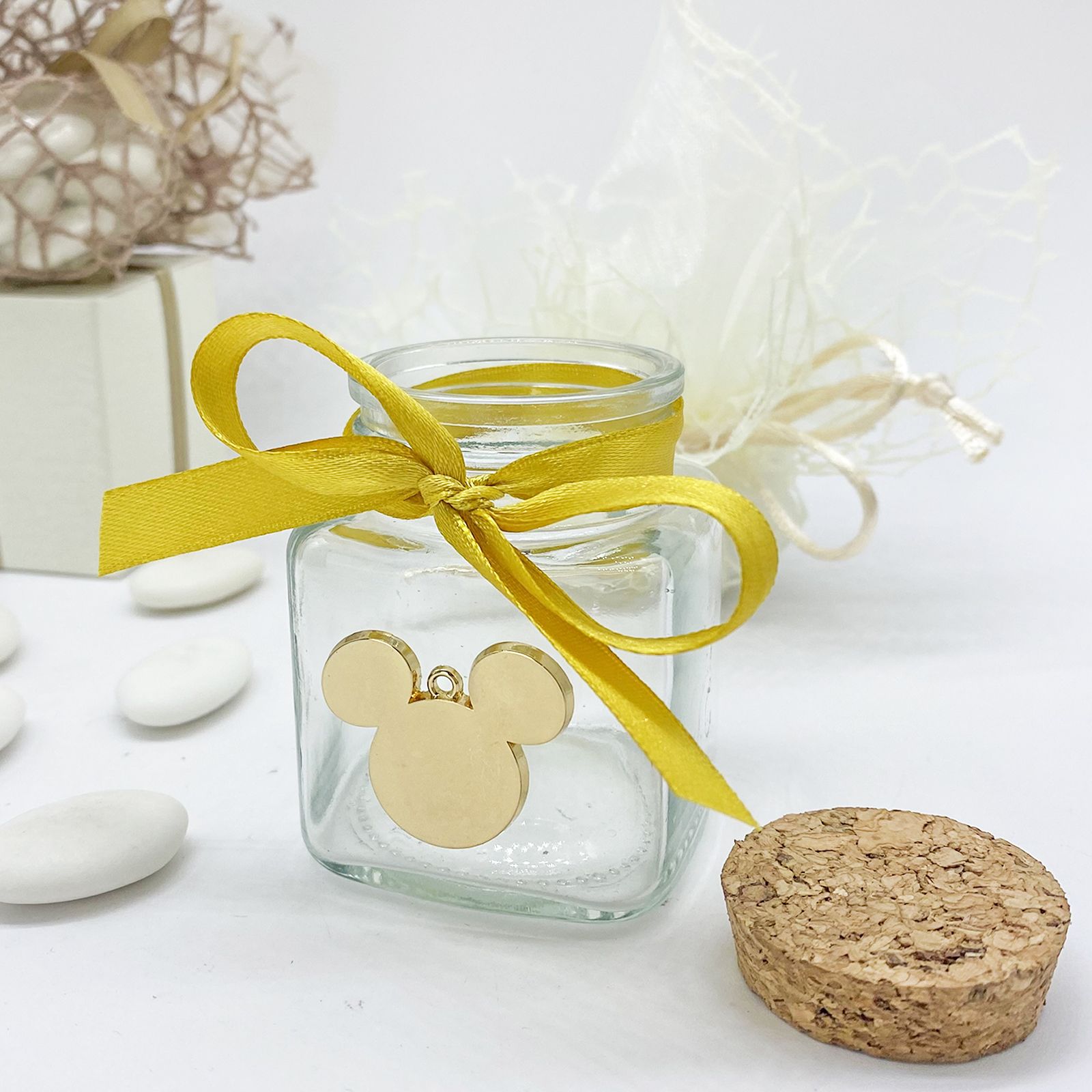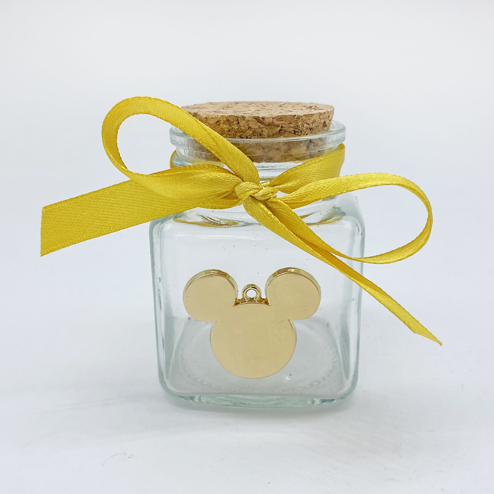 Questo elegante barattolo è realizzato in vetro e dotato di un tappo ermetico di sughero tondo, che lo rende estremamente versatile e adattabile a molteplici utilizzi. Con un po' di creatività e fantasia, puoi trasformare questo vasetto in qualcosa di straordinario. Può diventare un originale porta spezie, un contenitore per marmellate o miele, un portaconfetti, o persino un segna posto per un tocco speciale alle tue celebrazioni. Il limite è la tua immaginazione! Il vasetto è arricchito da charm a forma di sagoma della testa di Mickey Mouse, realizzati in metallo dorato, che aggiungono un tocco di magia Disney al tuo evento.