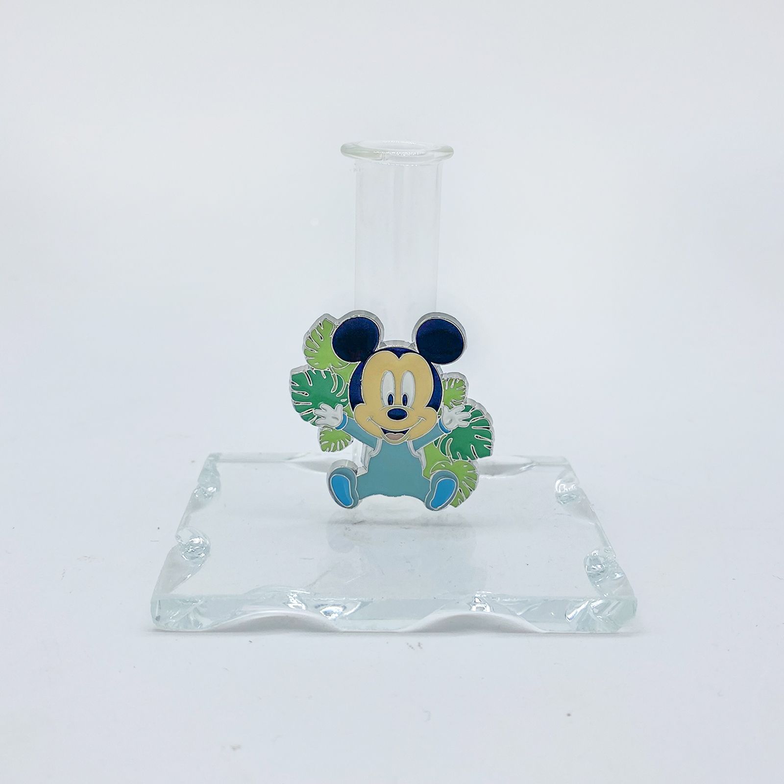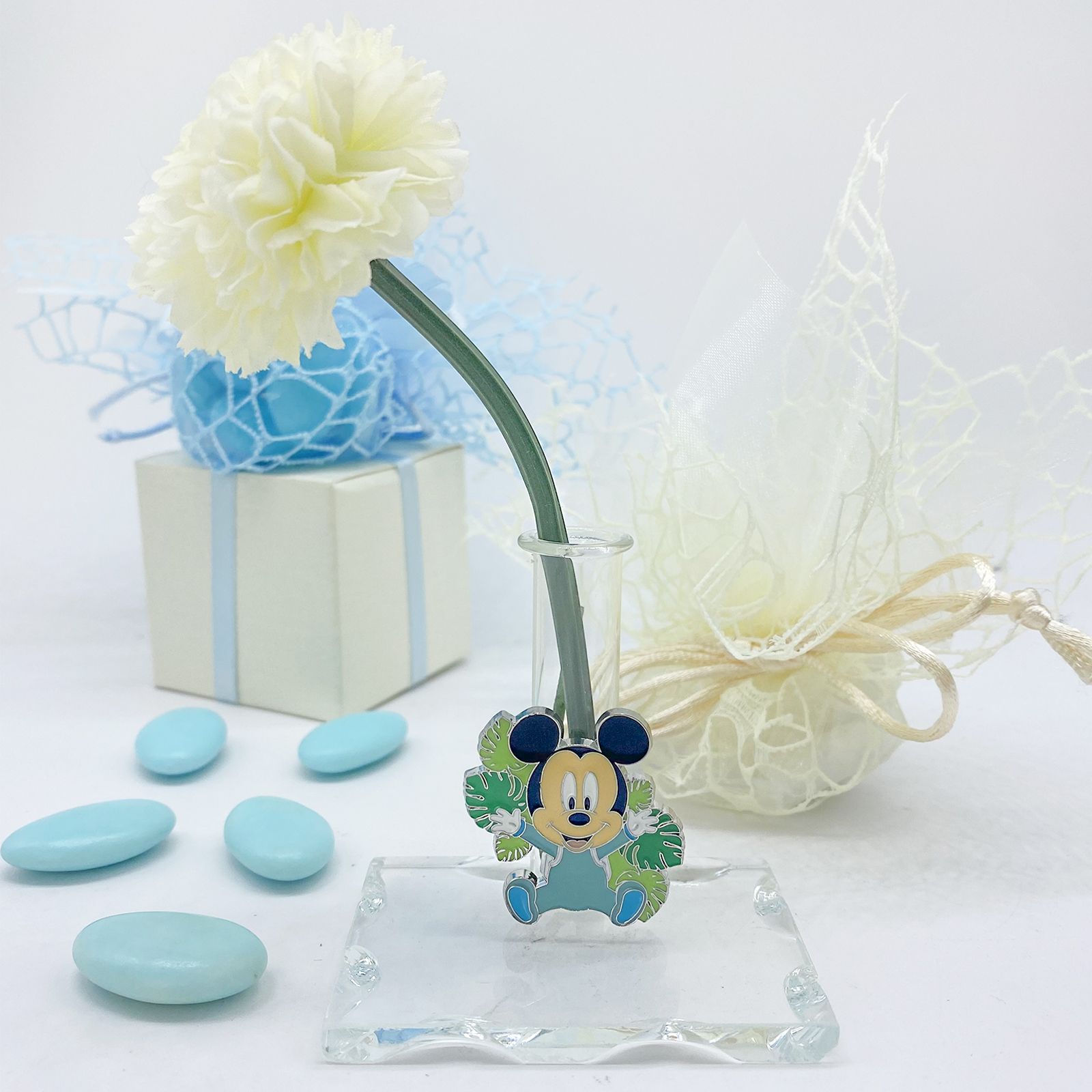 La tua ricerca della bomboniera perfetta per celebrare il battesimo del tuo bambino è giunta al termine. Questo elegante oggetto presenta una base in vetro trasparente, finemente intagliata, che custodisce una versatile ampolla fiala. Quest'ultima non è solo un profumatore, ma può essere utilizzata anche come porta bacchette profumate, contenitore per penne o come cornice per un grazioso monofiore. Vicino all'ampolla, brilla una tenera applicazione rappresentante un giovane Mickey Mouse vestito con una delicata tutina celeste, circondato da foglie dai colori sfumati di verde.