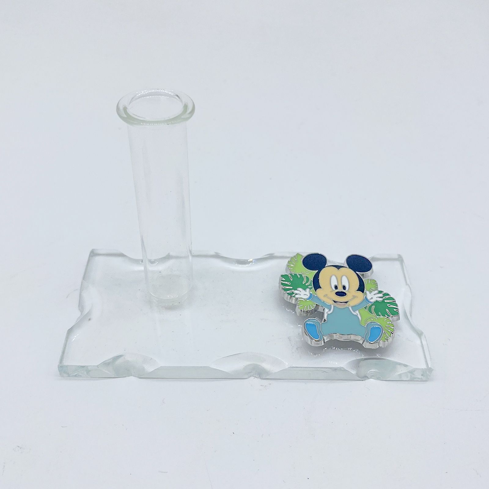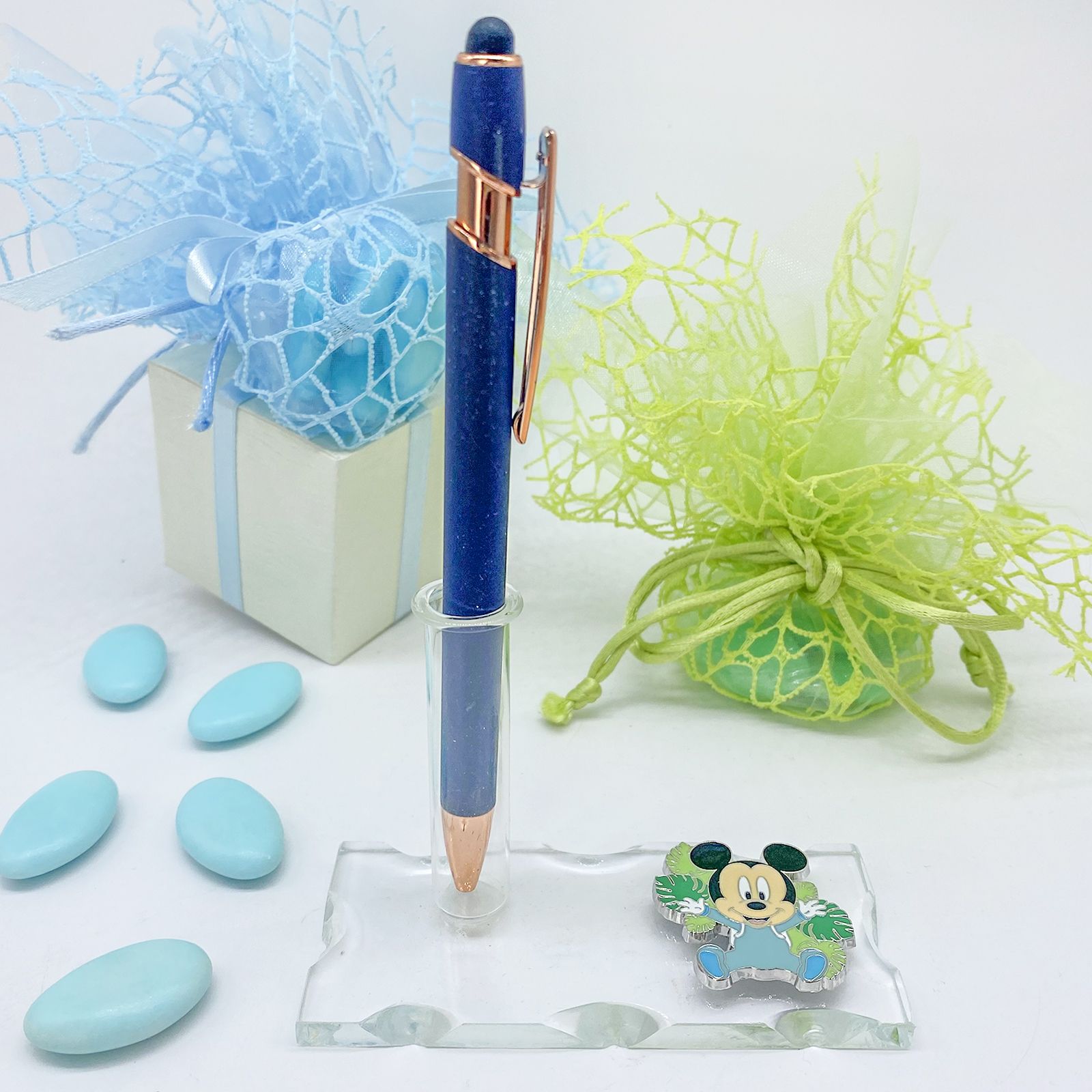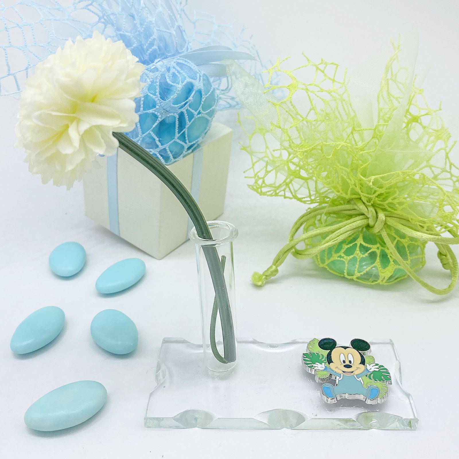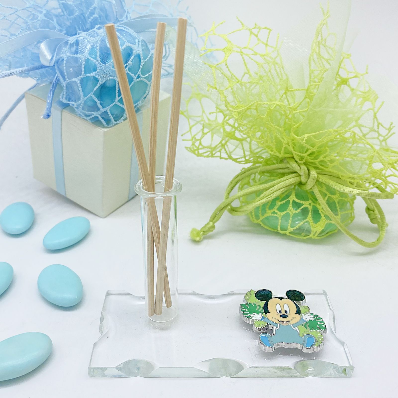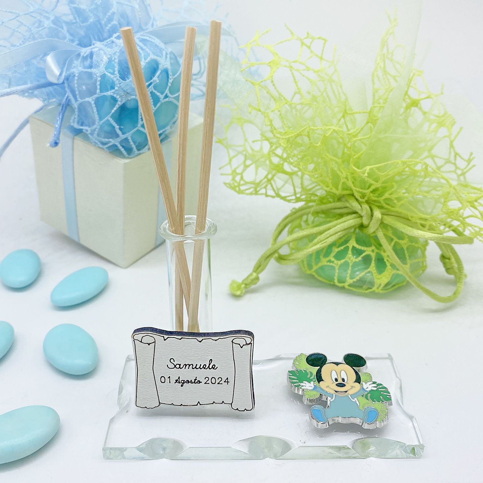 La bomboniera presenta una base in vetro trasparente soffiato intagliato che ospita un'ampolla fiala multifunzionale, funzionante come profumatore, porta bacchette profumate, porta penne o monofiore. Accanto alla base, troverai una graziosa applicazione a forma di baby Mickey Mouse con una tutina celeste, circondato da foglie di diverse tonalità di verde. Oltre alle sue caratteristiche affascinanti, hai la possibilità di personalizzare la bomboniera con una pergamena.