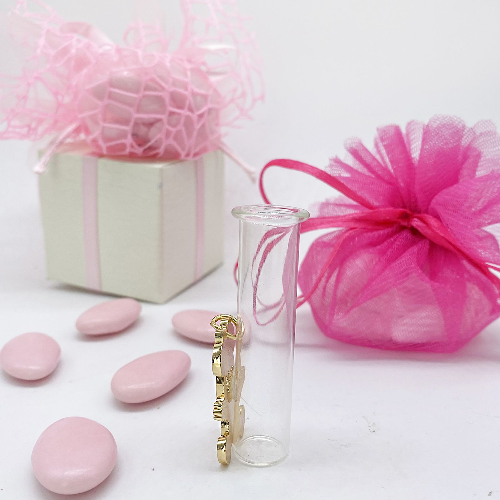 Il nostro ecommerce offre il valore aggiunto della personalizzazione, permettendoti di vedere una simulazione dal vivo del confezionamento. Puoi scegliere se ricevere il kit fai da te per confezionare la bomboniera a tuo piacimento o optare per ricevere la bomboniera già pronta per essere regalata, risparmiando tempo e sforzi preziosi.