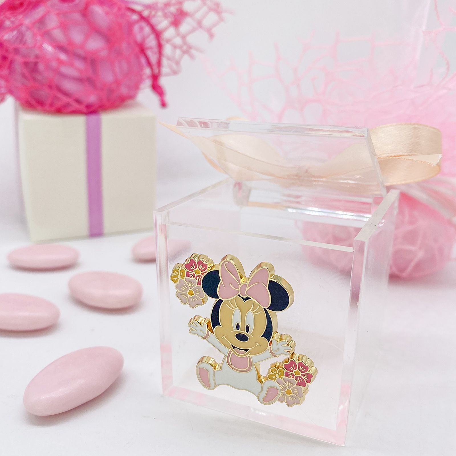 Presentiamo scatole plexiglass trasparenti, con un'apertura superiore agevole e un tocco magico Disney. Queste scatole versatili si prestano a molteplici utilizzi: portaconfetti, segnaposto, pensierino o parte integrante dell'allestimento di un evento speciale. La loro trasparenza le rende ideali anche come contenitori per oggetti o porta cioccolatini. Ciò che rende queste bomboniere davvero speciali sono le graziose applicazioni Disney a forma di Minnie. Minnie è vestita con una delicata tutina bianca e rosa, e un fiocco in tinta arricchisce il suo look. È circondata da piccoli fiorellini nelle stesse tonalità, creando un'atmosfera incantata. Questi dettagli incanteranno i tuoi ospiti e faranno brillare l'evento.
