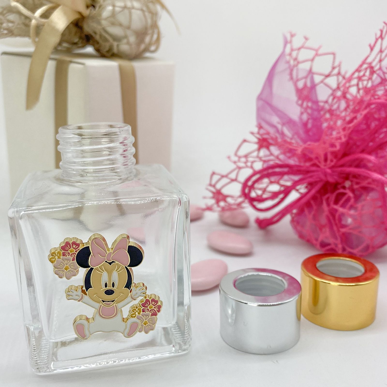 Hai la possibilità di scegliere non solo la capacità della bottiglia, ma anche il colore del tappo esterno, disponibile nelle affascinanti tonalità dell'oro e dell'argento. Inoltre, sulla parte frontale di ogni bottiglia troverai una graziosa decorazione di Minnie, vestita con un adorabile abitino bianco e rosa, accompagnato da un fiocco coordinato e circondata da piccoli fiorellini che seguono la stessa armonia di colori.