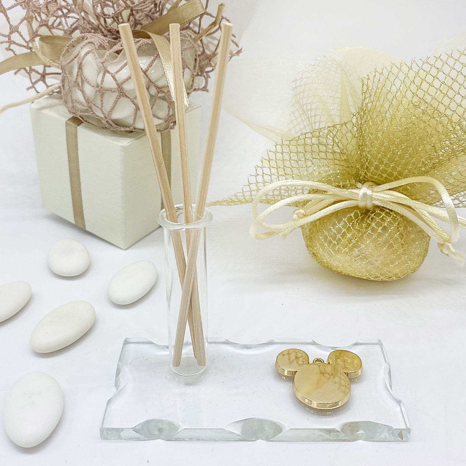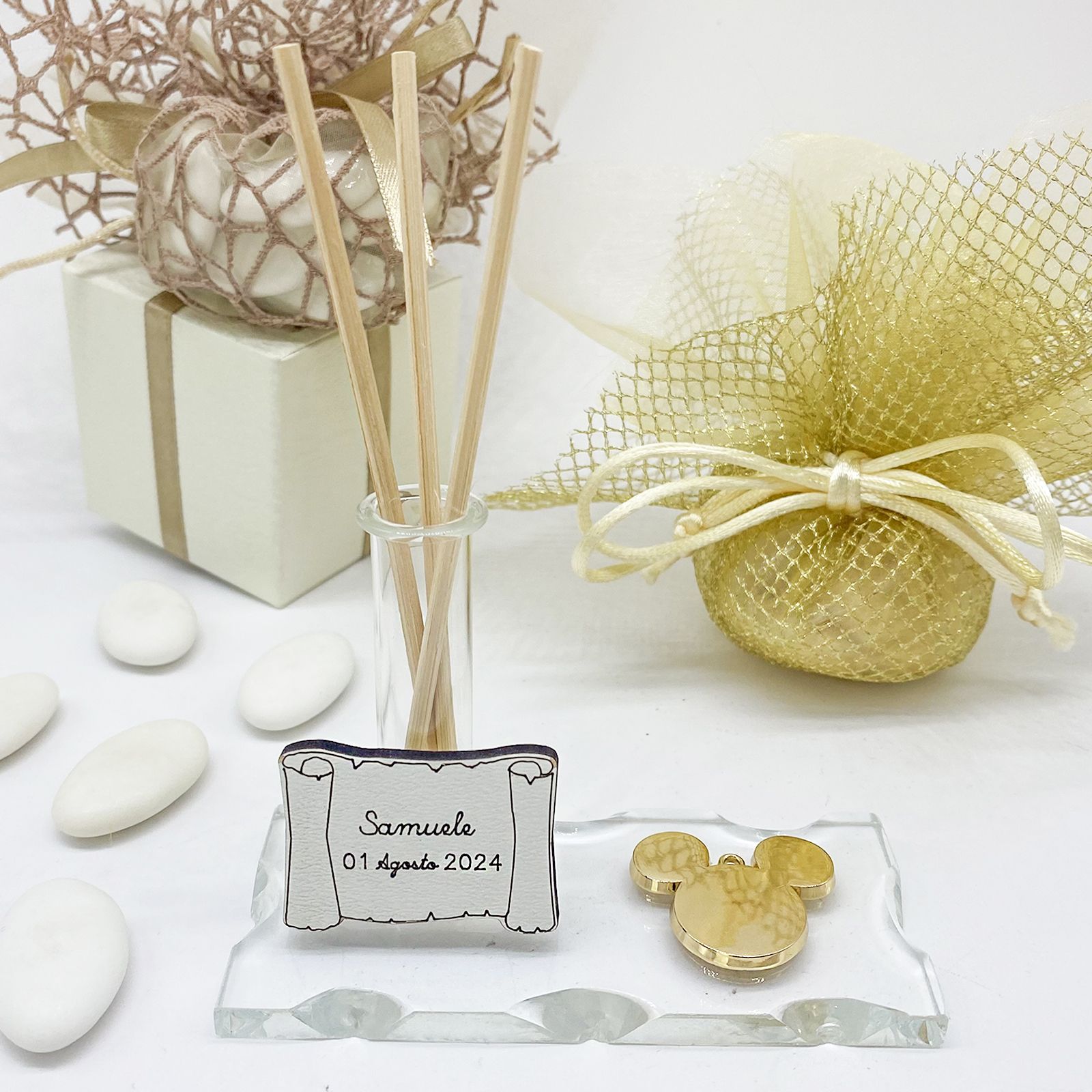 Questa bomboniera straordinaria presenta una base in vetro di circa 10x4 cm, con un simbolo scintillante di Topolino in color oro. Ma non finisce qui. La base in vetro ospita anche una fiala in vetro, alta circa 6 cm, che può essere utilizzata in una varietà di modi: come monofiore profumatore per diffondere un'atmosfera incantevole, oppure come portapenne elegante per arricchire la scrivania di chi la riceve. Inoltre, c'è una pergamena personalizzabile in legno che aggiunge un tocco di calore e personalità al regalo.