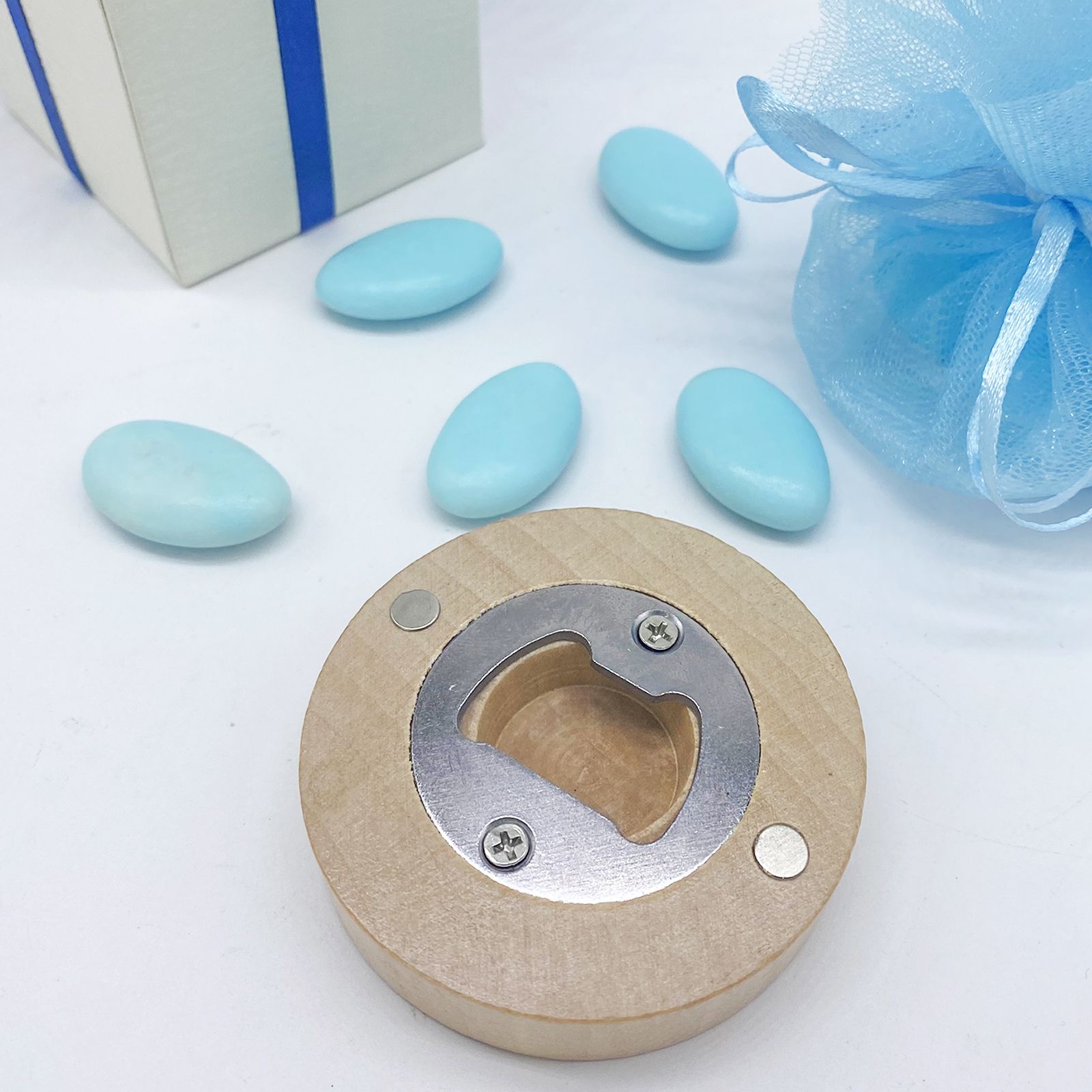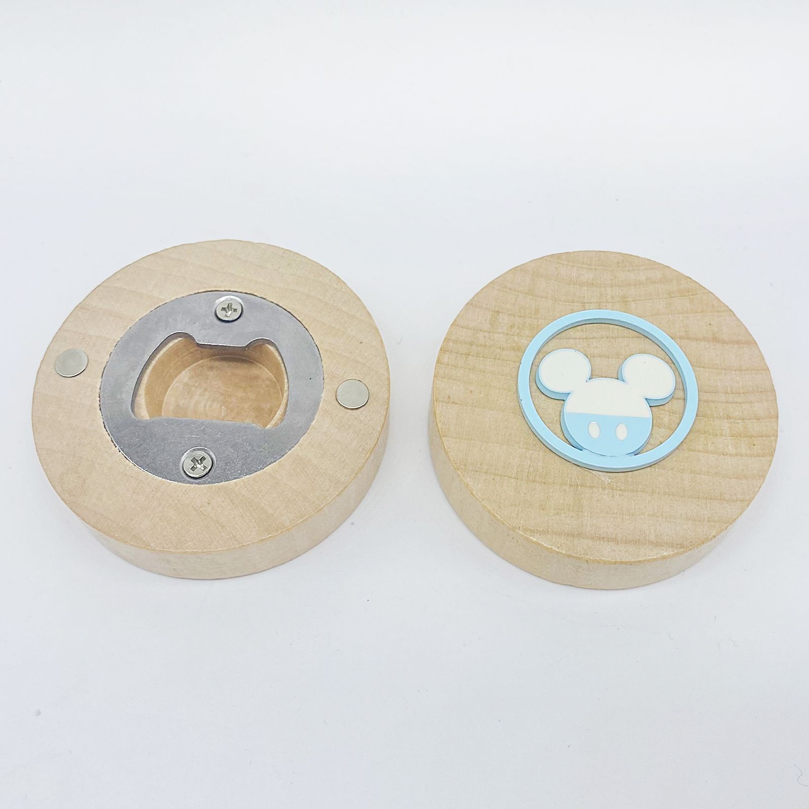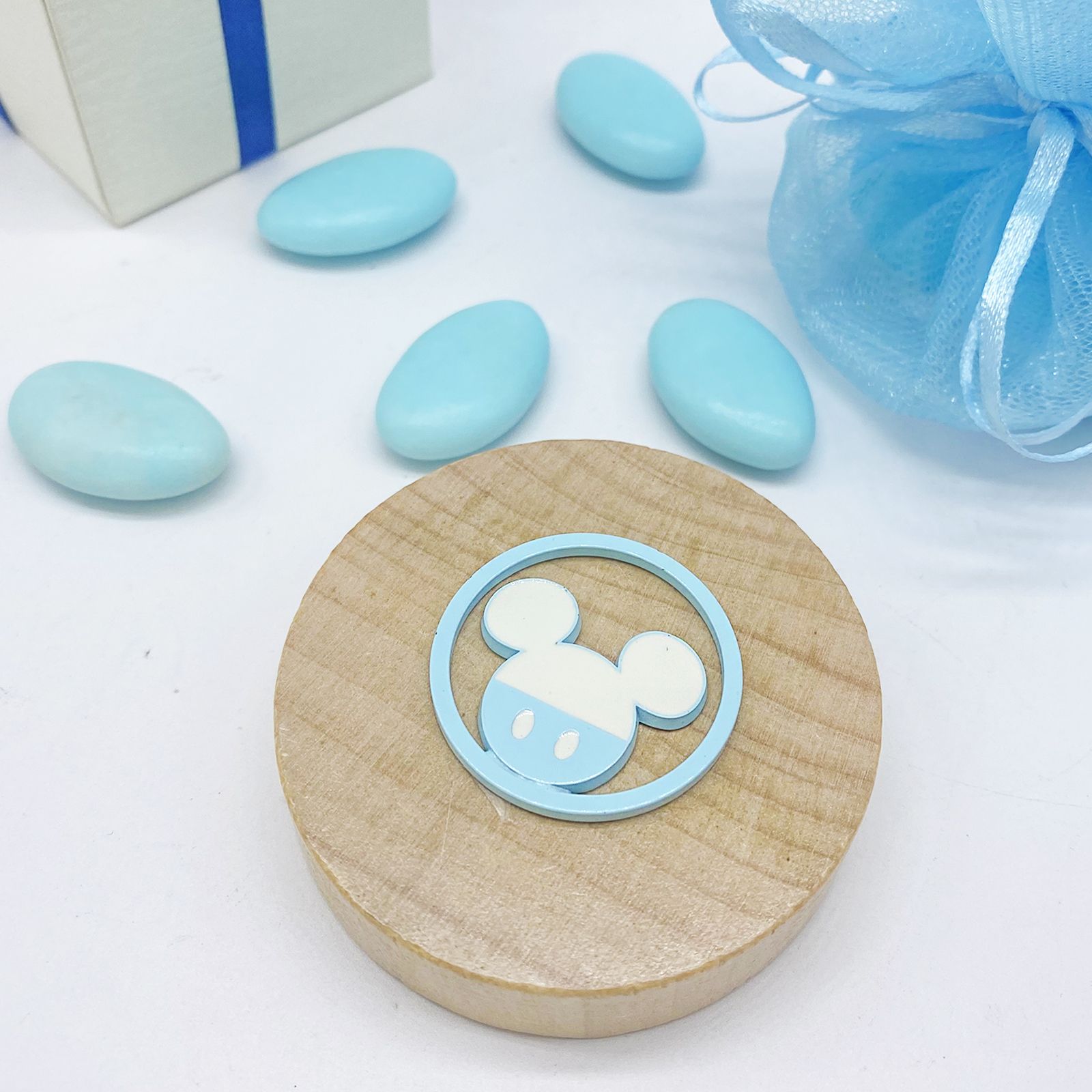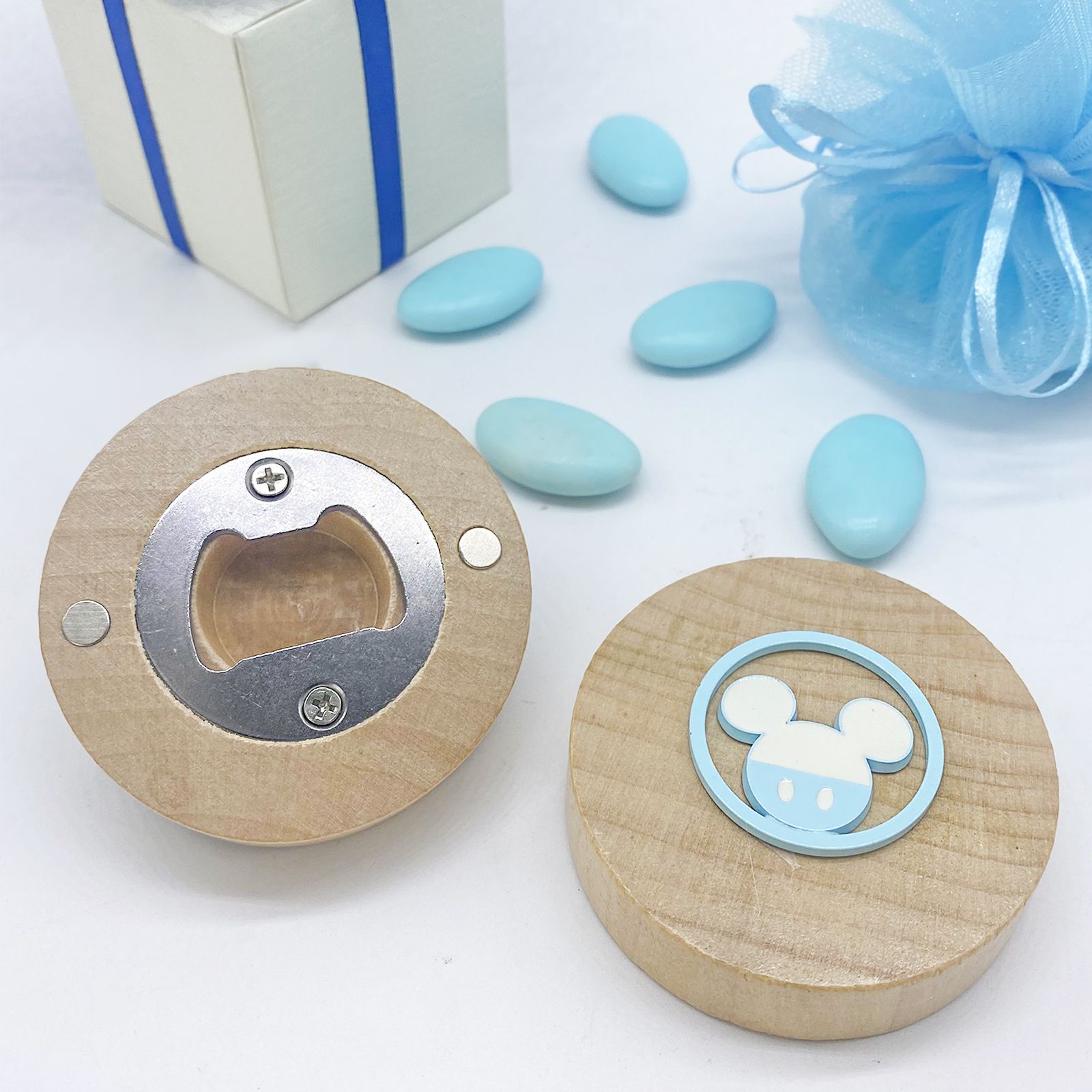 La nostra bomboniera presenta un apribottiglie magnetico in legno, arricchito da un'adorabile applicazione in metallo raffigurante Topolino, il simpatico protagonista Disney.