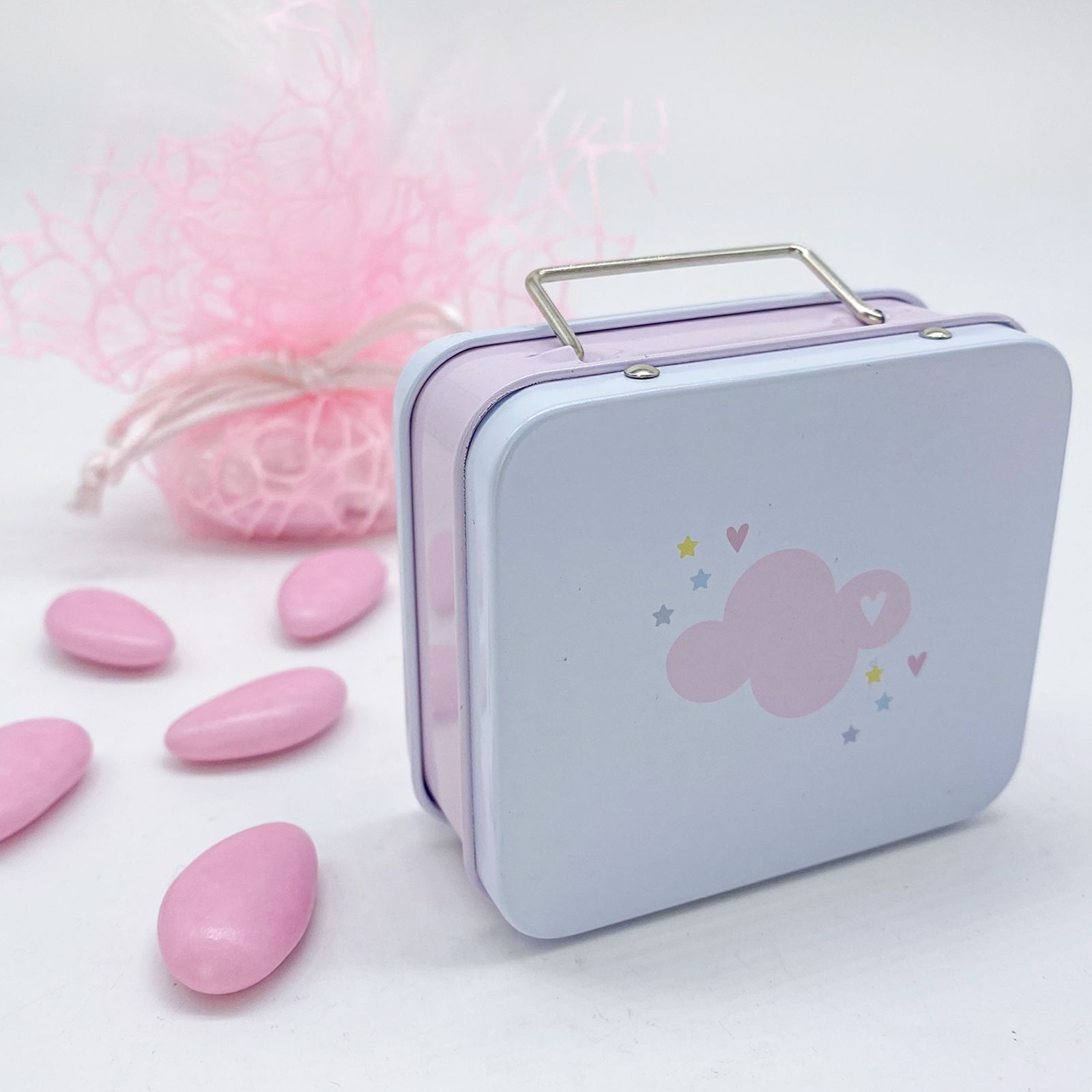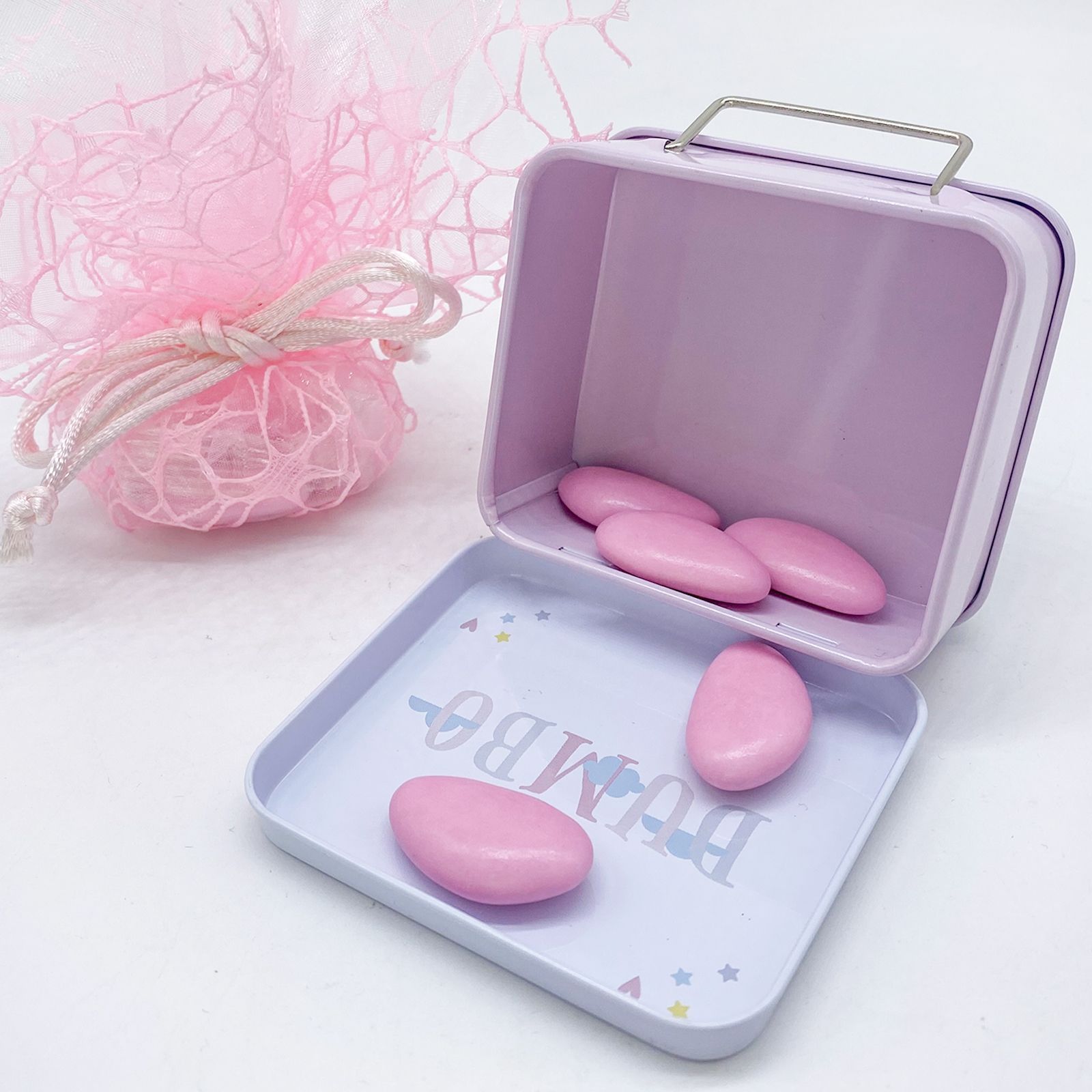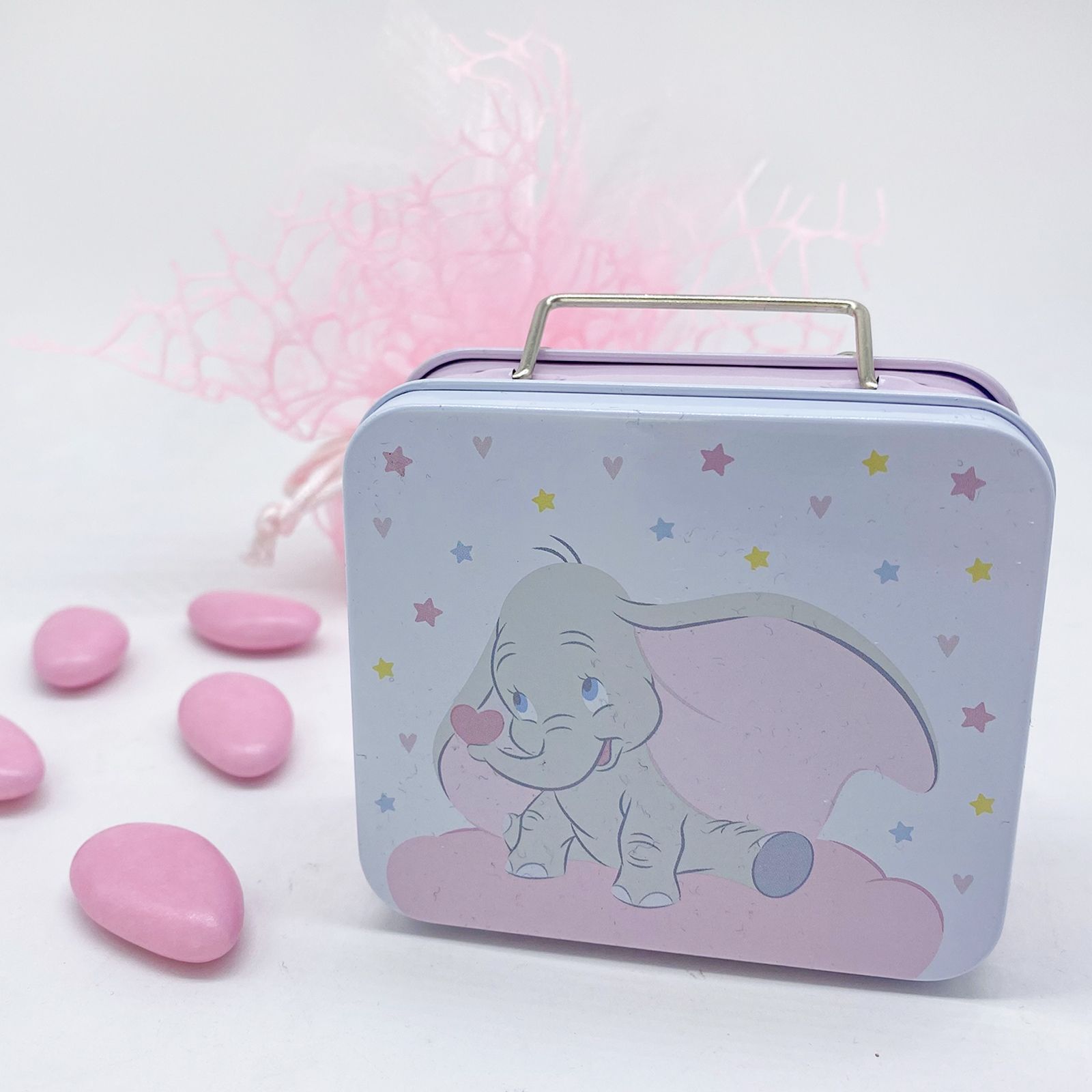 All'apertura, sotto il coperchio, la scritta "Dumbo" appare per esteso, accompagnata da un elegante manico in metallo che aggiunge un tocco di originalità. Perfetta per una confettata, questa scatolina è un ricordino speciale per gli ospiti che parteciperanno alla festa della tua bambina.
