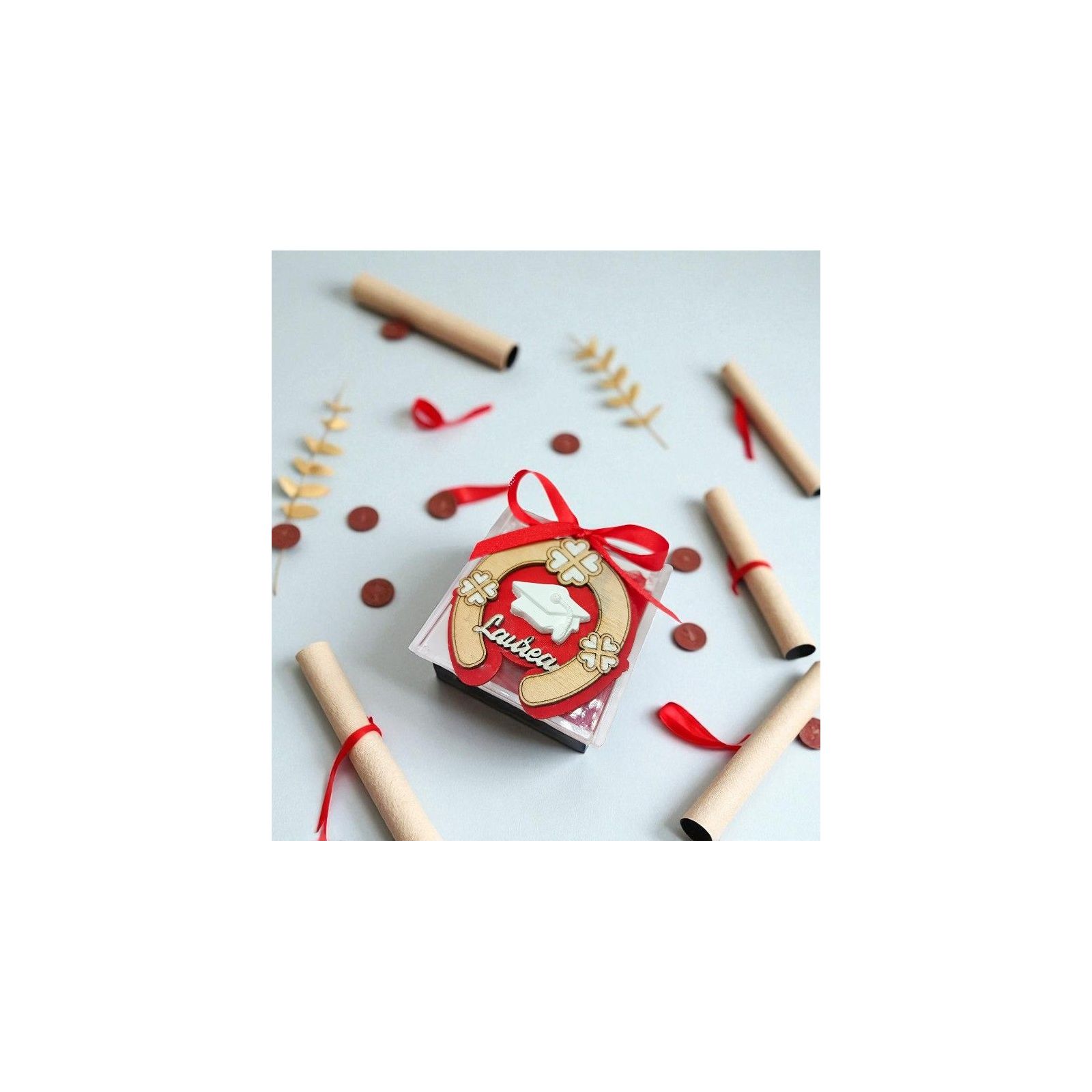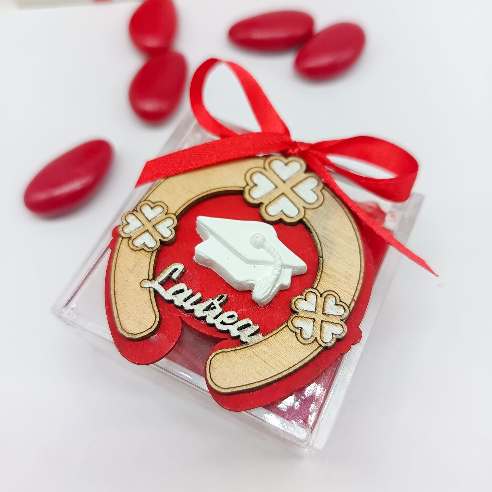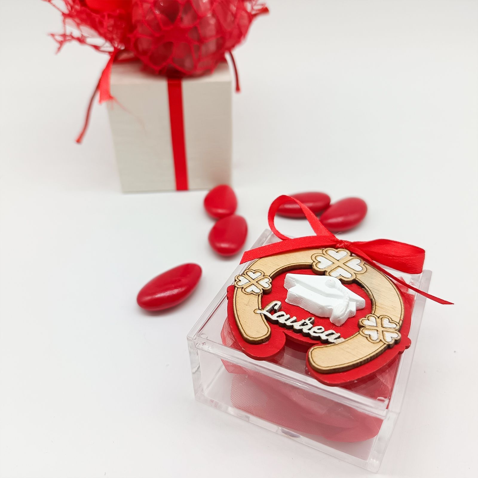 Rendi speciale la tua festa di laurea con un portaconfetti raffinato: una scatolina in plexiglass decorata con un simbolico ferro di cavallo, circondato da quadrifogli portafortuna. Al centro spiccano il tocco da laureato e la scritta “Laurea”, su una decorazione in color legno e rosso che dona calore e significato.