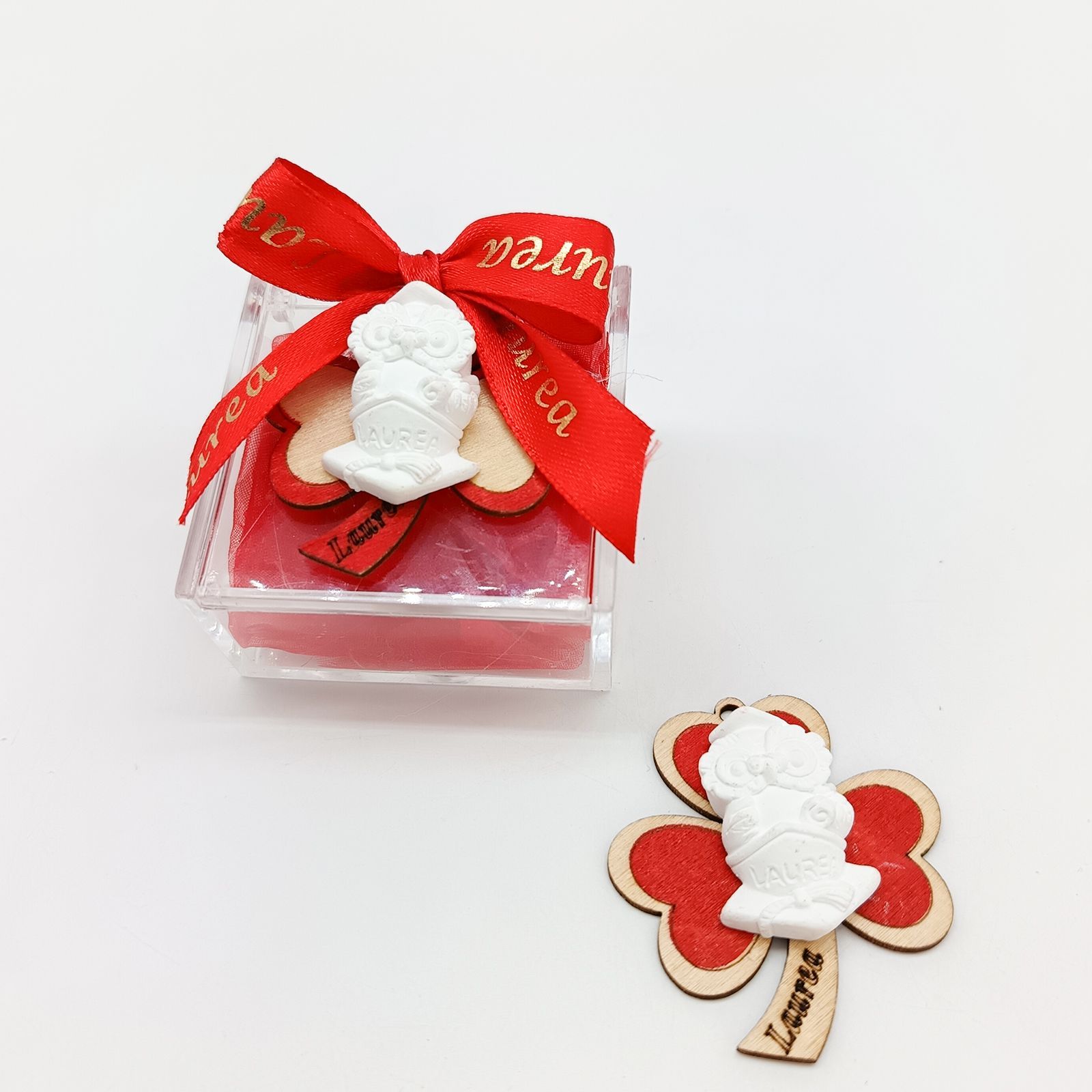 Dai un tocco di allegria e originalità alla tua festa di laurea con questa simpatica scatolina portaconfetti in plexiglass decorata con un gufetto portafortuna alto 5,5 cm, un trifoglio e la scritta "Laurea". Assortitoin due colori vivaci, è il regalo perfetto per stupire i tuoi ospiti!