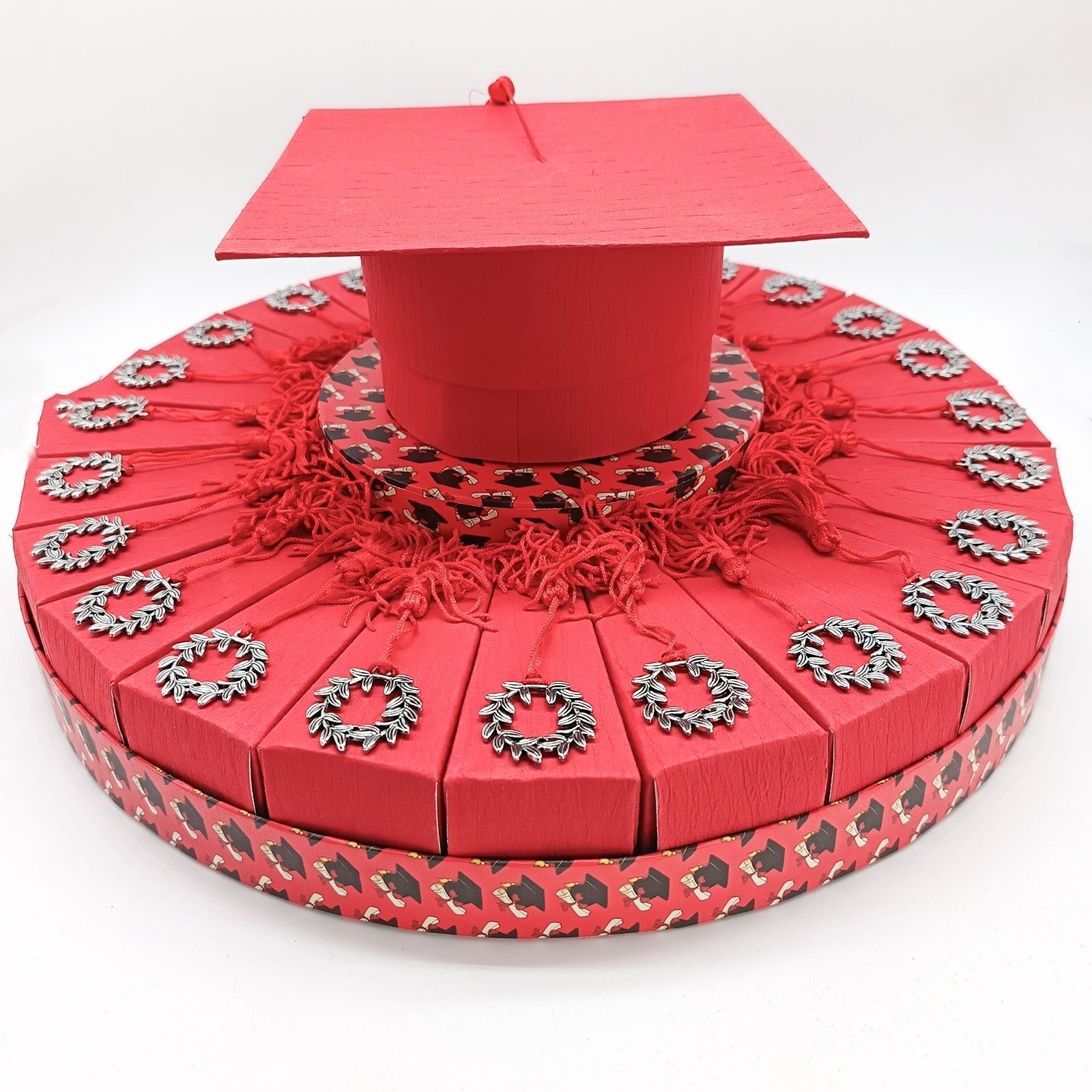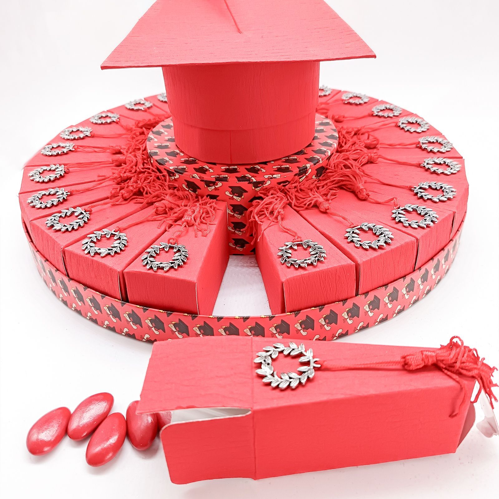 Dai un tocco vivace alla tua laurea con una splendida torta rossa da 24 fette! Ogni fetta, in resistente cartoncino, è arricchita da un ciondolo in metallo a forma di corona d’alloro e nappina rossa, pronta per sorprendere amici e parenti come originale bomboniera o elegante elemento per la tua confettata.