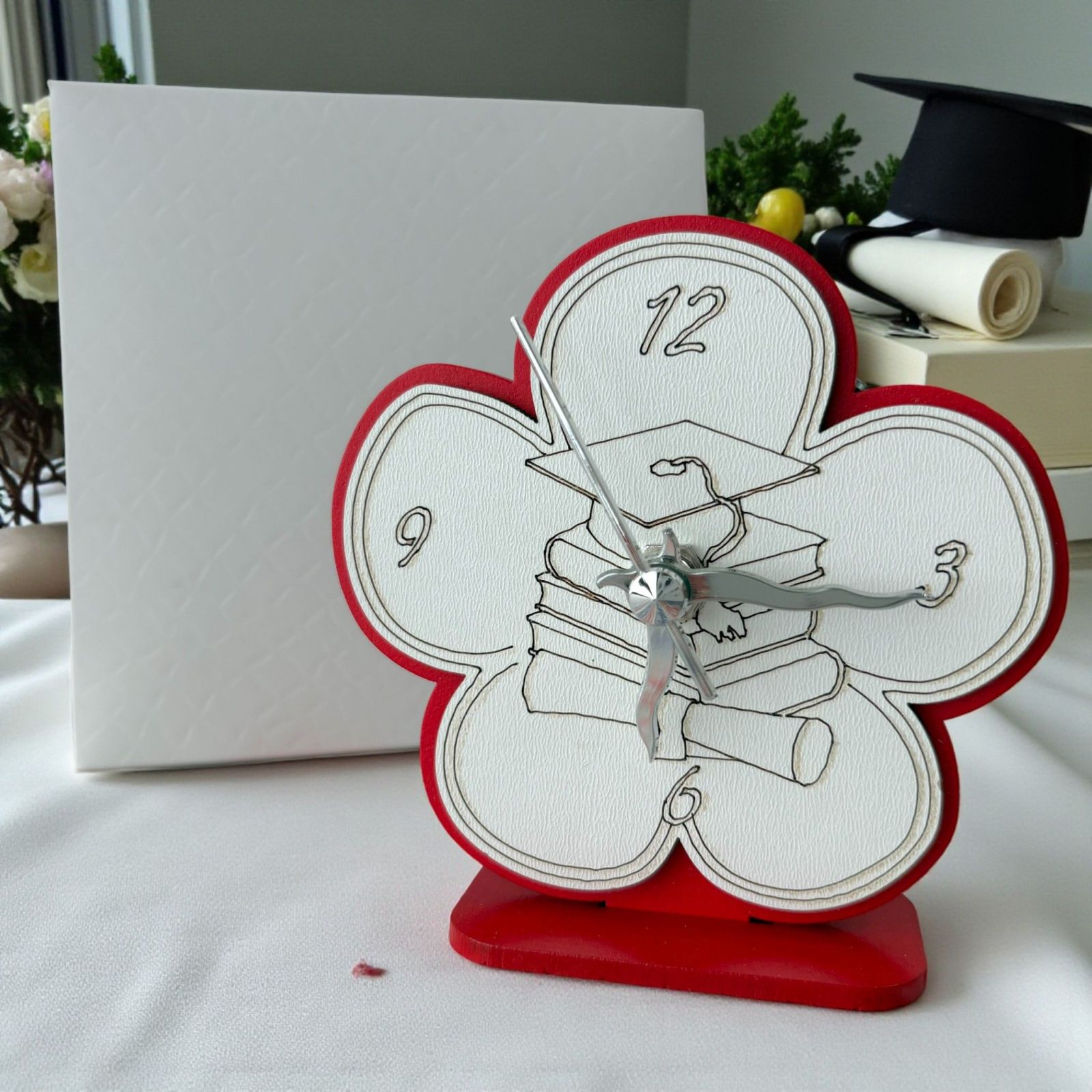 Celebra il traguardo significativo della laurea con una bomboniera che parla direttamente al cuore. Il nostro orologio a forma di fiore è molto più di un semplice orologio: è un simbolo di successo e dedizione, perfetto per rendere omaggio a chi ha affrontato anni di studio e sacrifici. Ogni dettaglio, dai libri al tocco, fino alla pergamena, è pensato per rievocare i momenti straordinari di questo viaggio accademico, trasformando ogni attimo in un ricordo prezioso.