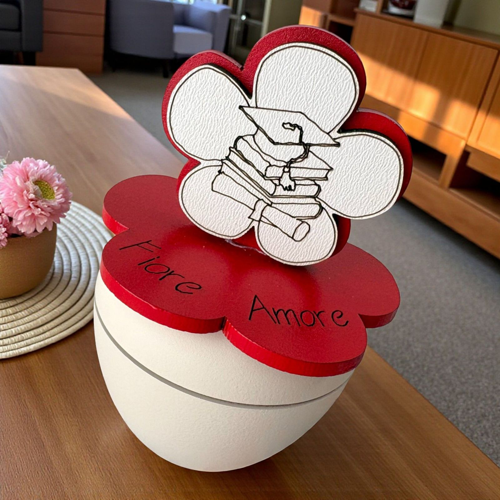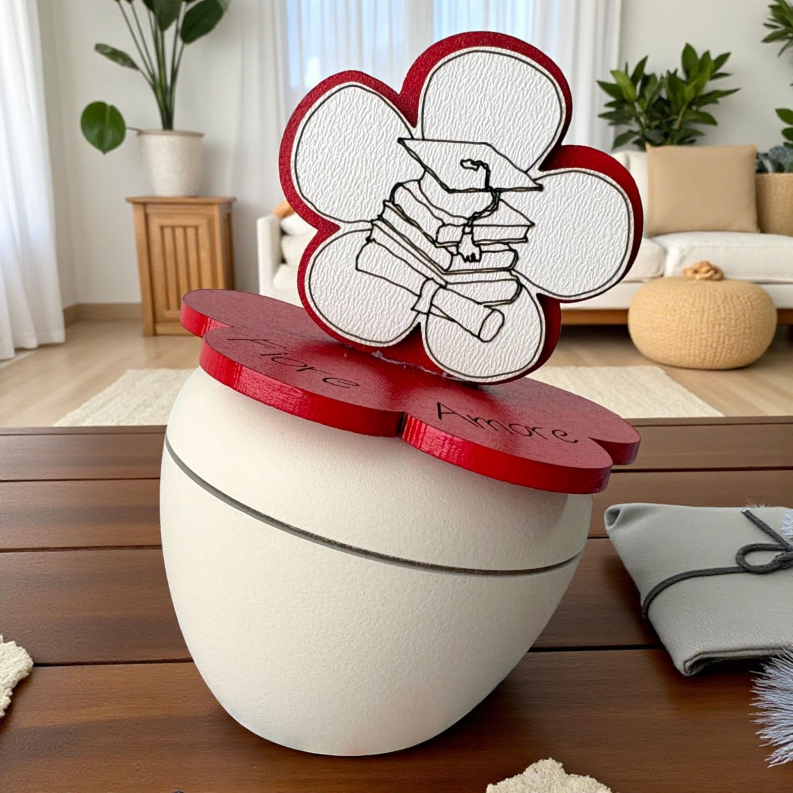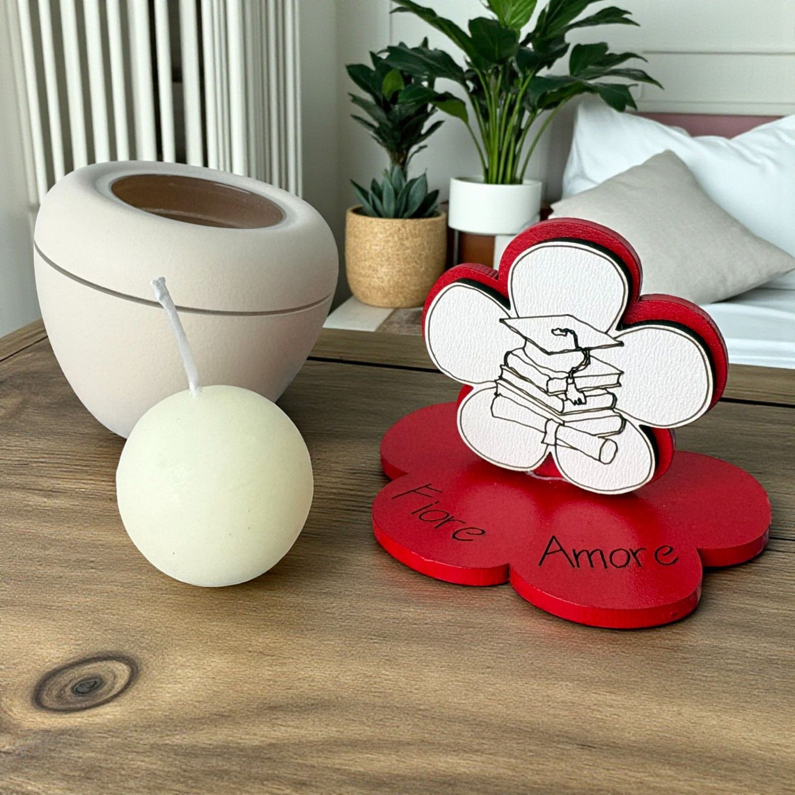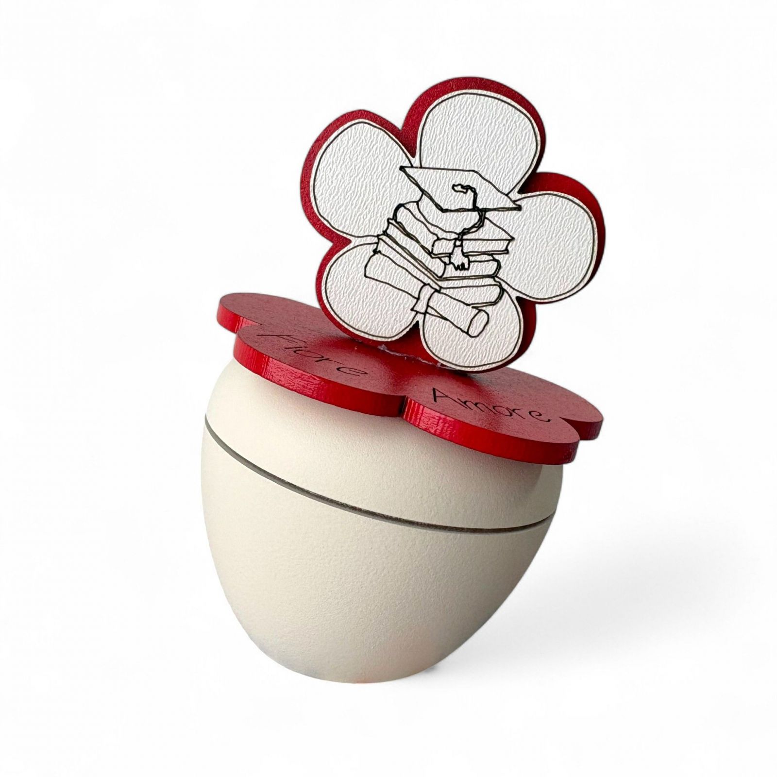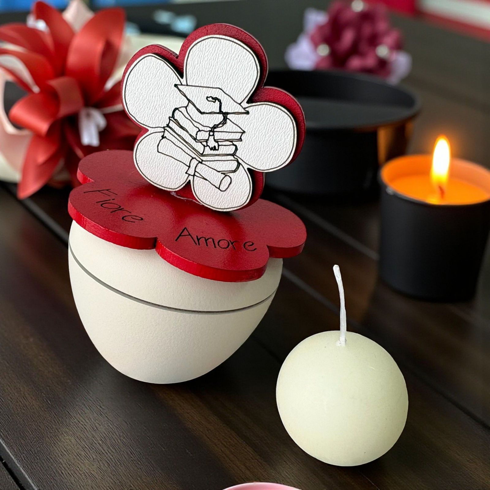 Celebra il traguardo della laurea con le nostre bomboniere laurea originali, un regalo unico che racconta una storia di impegno e passione. Questo portacandela artigianale, decorato con un delicato fiore e i simboli di laurea come libro, pergamena e tocco, è un modo emozionante per esprimere la tua gioia. Ogni pezzo è realizzato con cura e dedizione, creando un ricordo indimenticabile per il festeggiato e i suoi invitati.