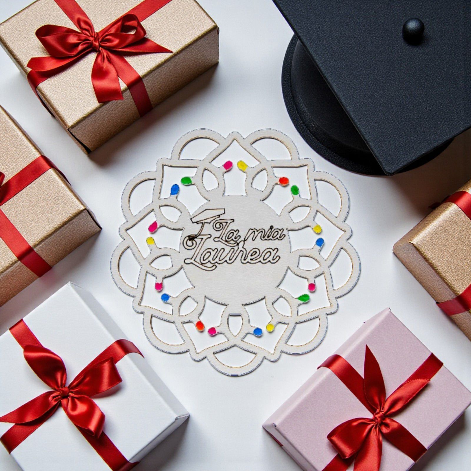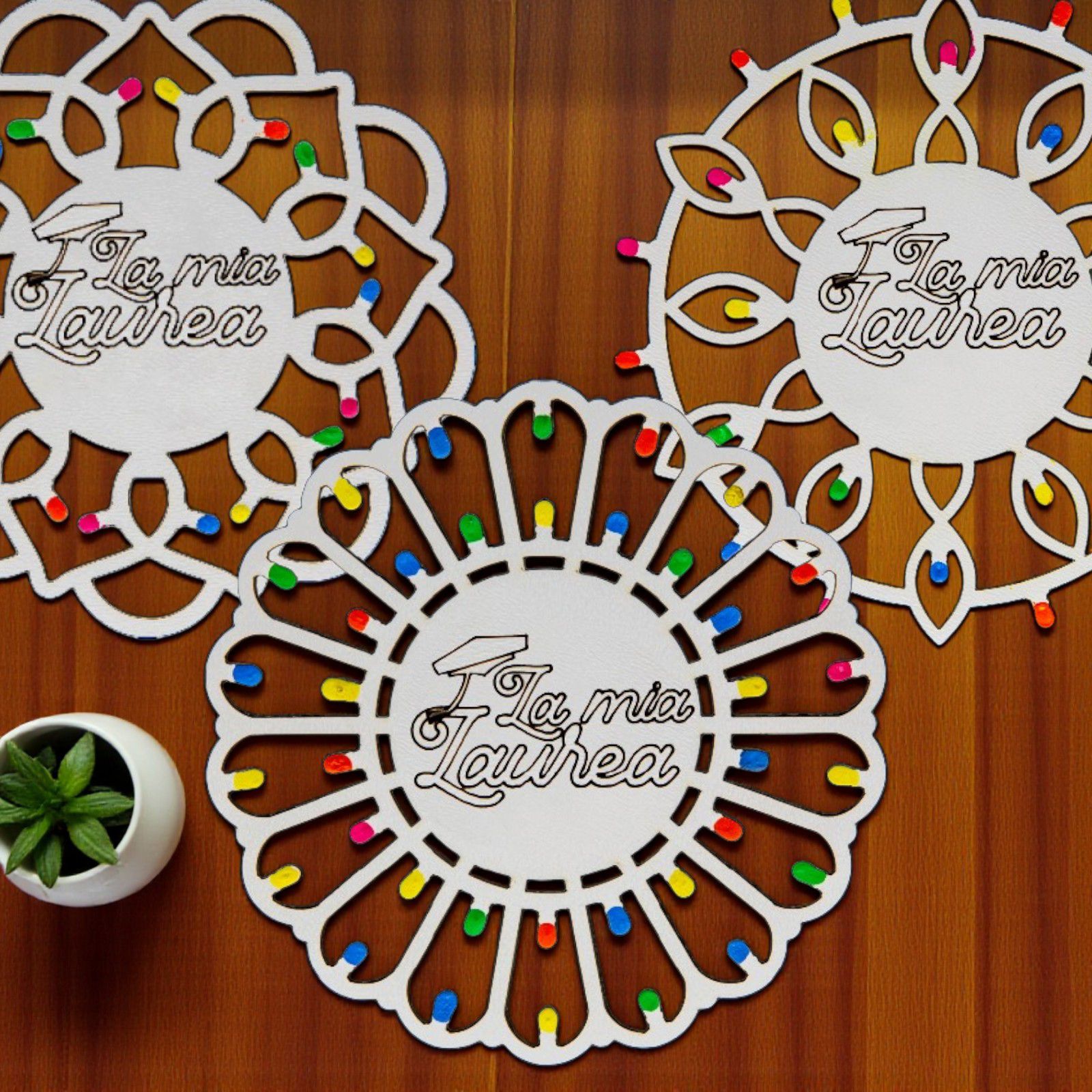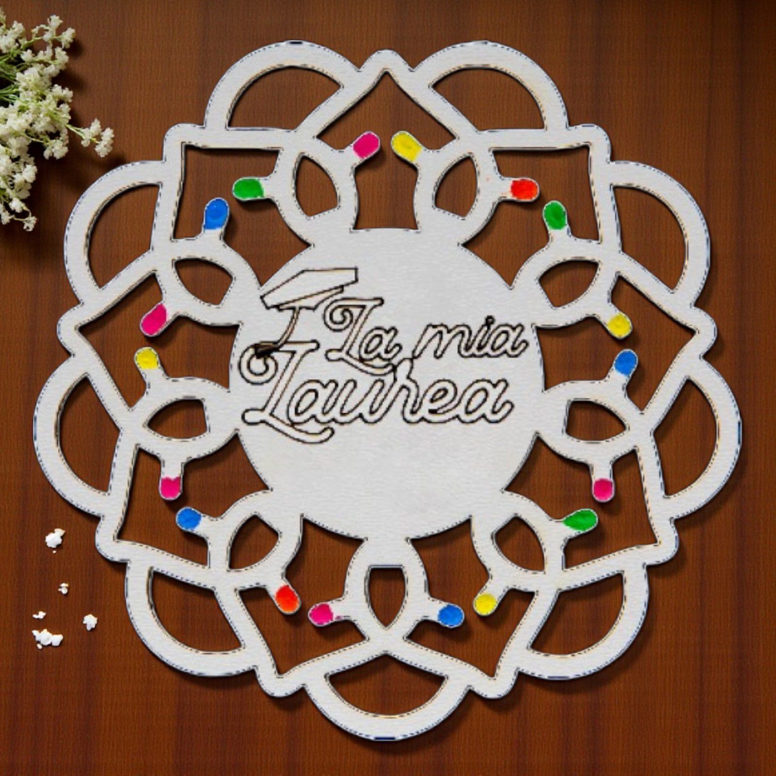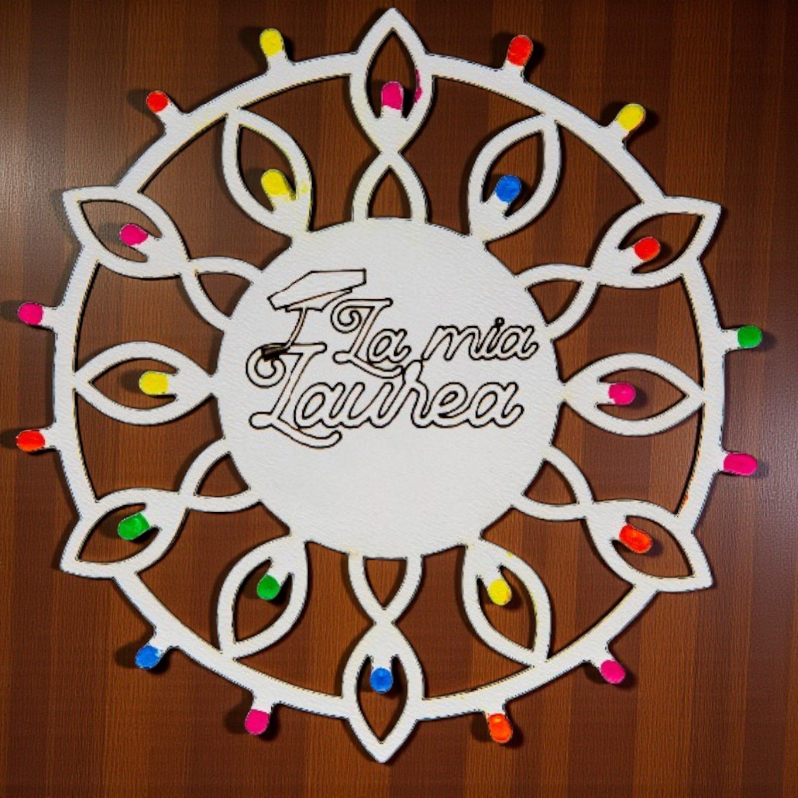 Realizzate in legno di alta qualità, le nostre luminarie pugliesi sono impreziosite da “lucine” multicolor che donano un tocco di magia e vivacità. L'incisione centrale con la scritta "La mia Laurea" con tocco, rende ogni pezzo unico e perfetto per ogni ragazzo o ragazza che desidera celebrare questo importante passo nella vita. Inoltre, possono servire anche come segnaposto per rendere il tuo evento ancora più speciale e memorabile.