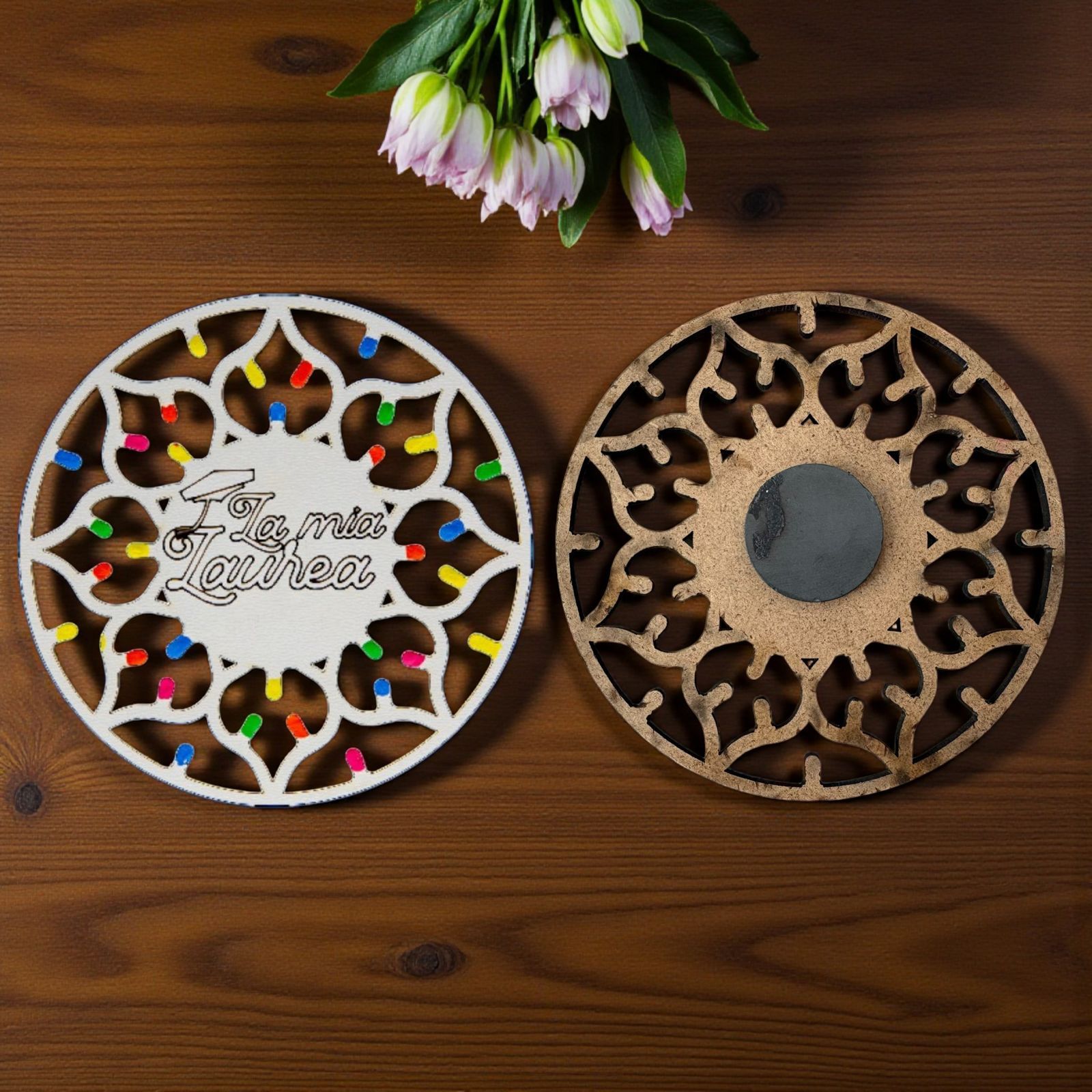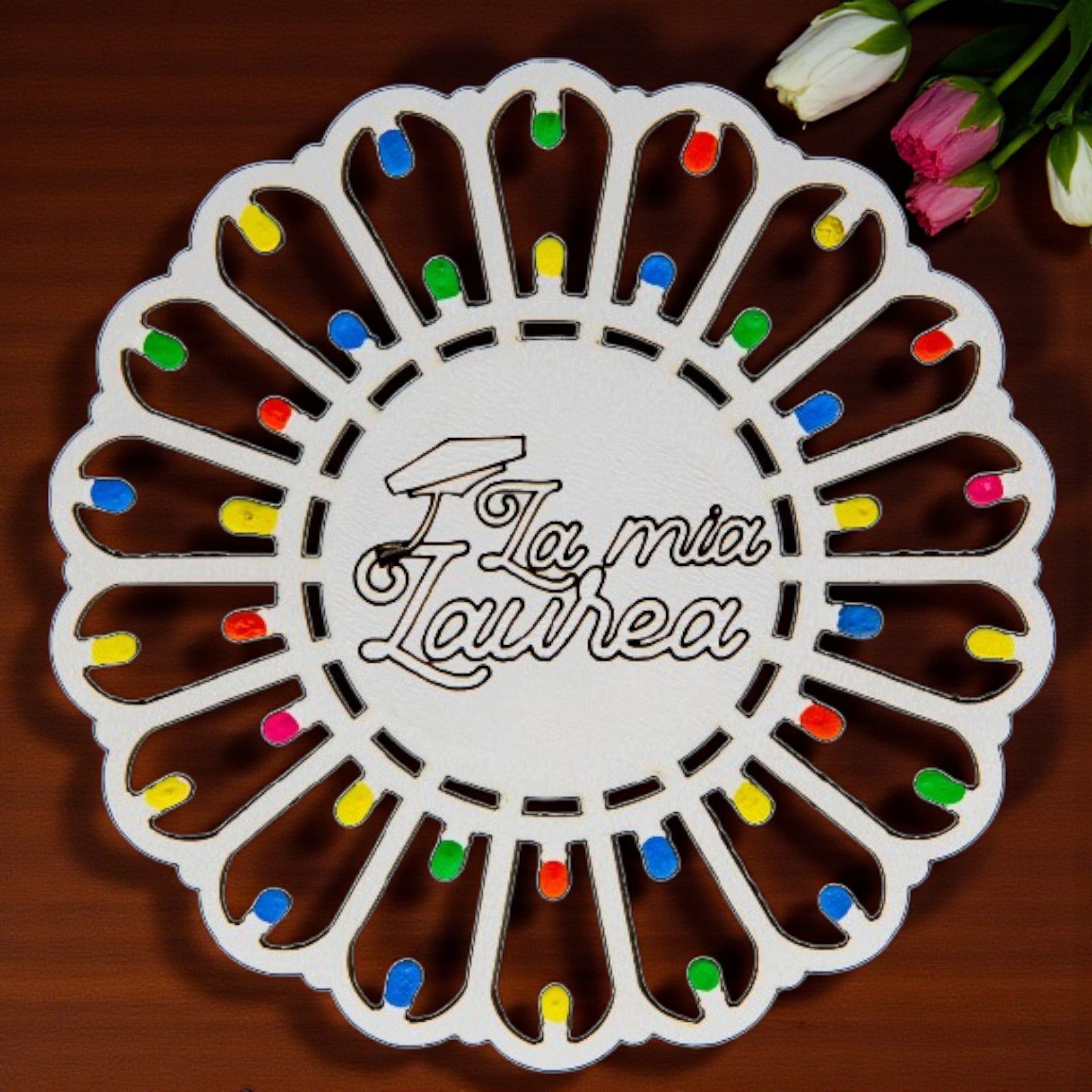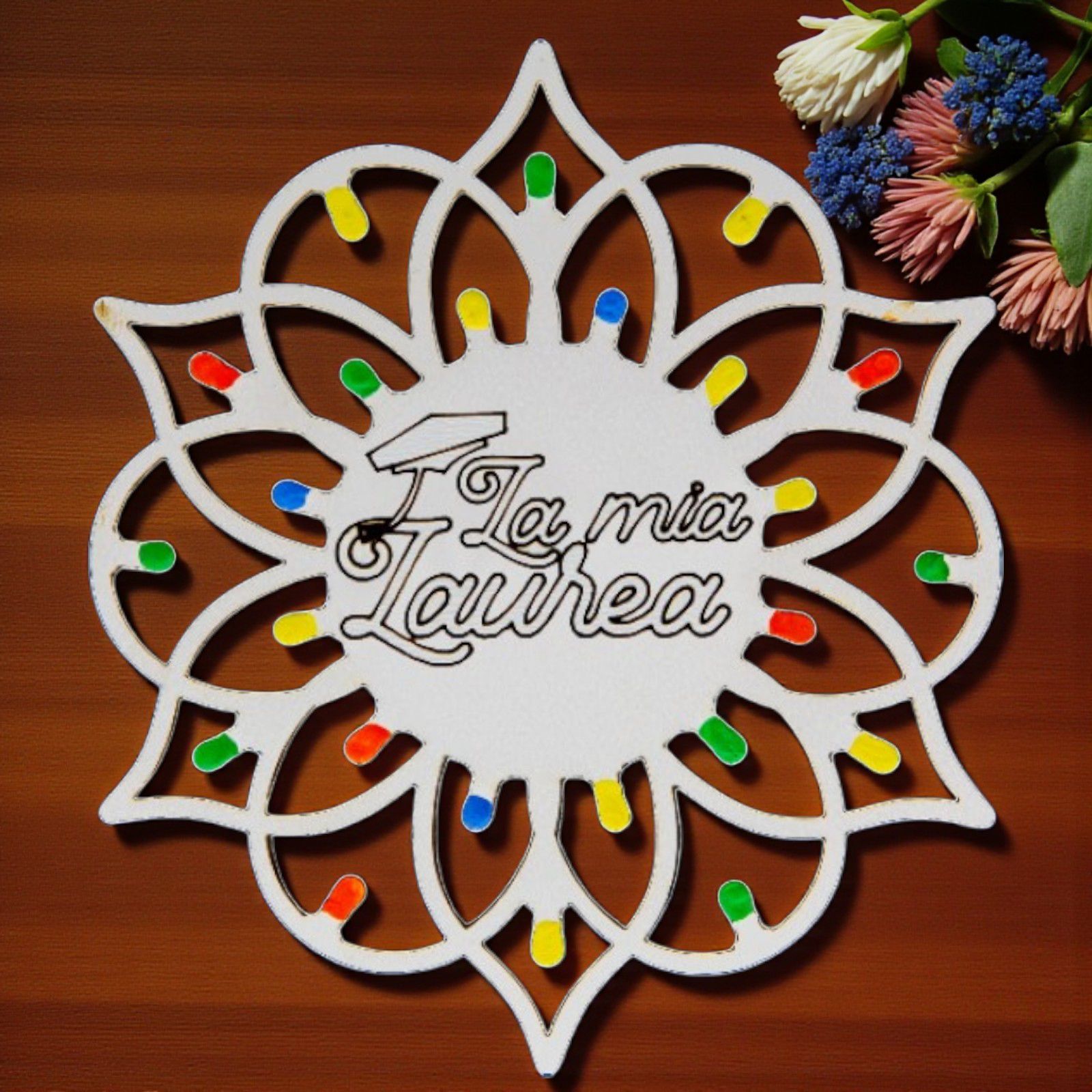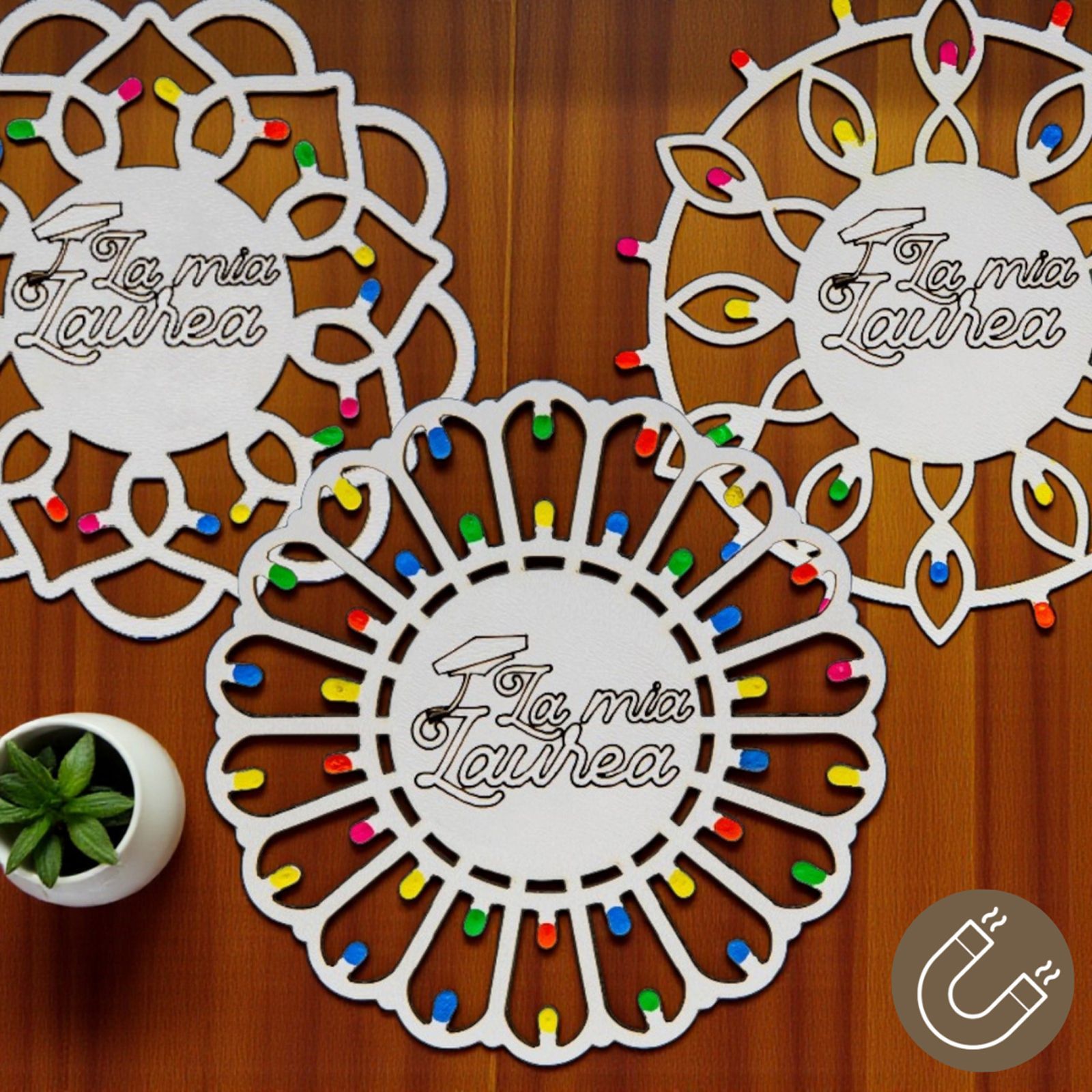 Realizzate in legno di alta qualità, le nostre luminarie pugliesi sono impreziosite da “lucine” multicolor che donano un tocco di magia e vivacità. L'incisione centrale con la scritta "La mia Laurea" con tocco, rende ogni pezzo unico e perfetto per ogni ragazzo o ragazza che desidera celebrare questo importante passo nella vita. Inoltre, possono servire anche come segnaposto per rendere il tuo evento ancora più speciale e memorabile.