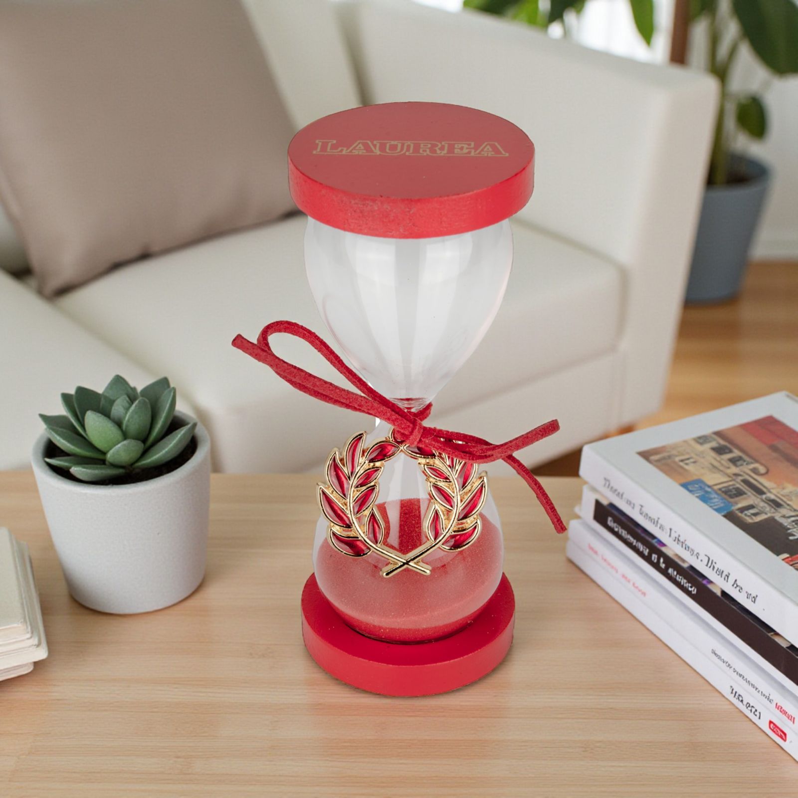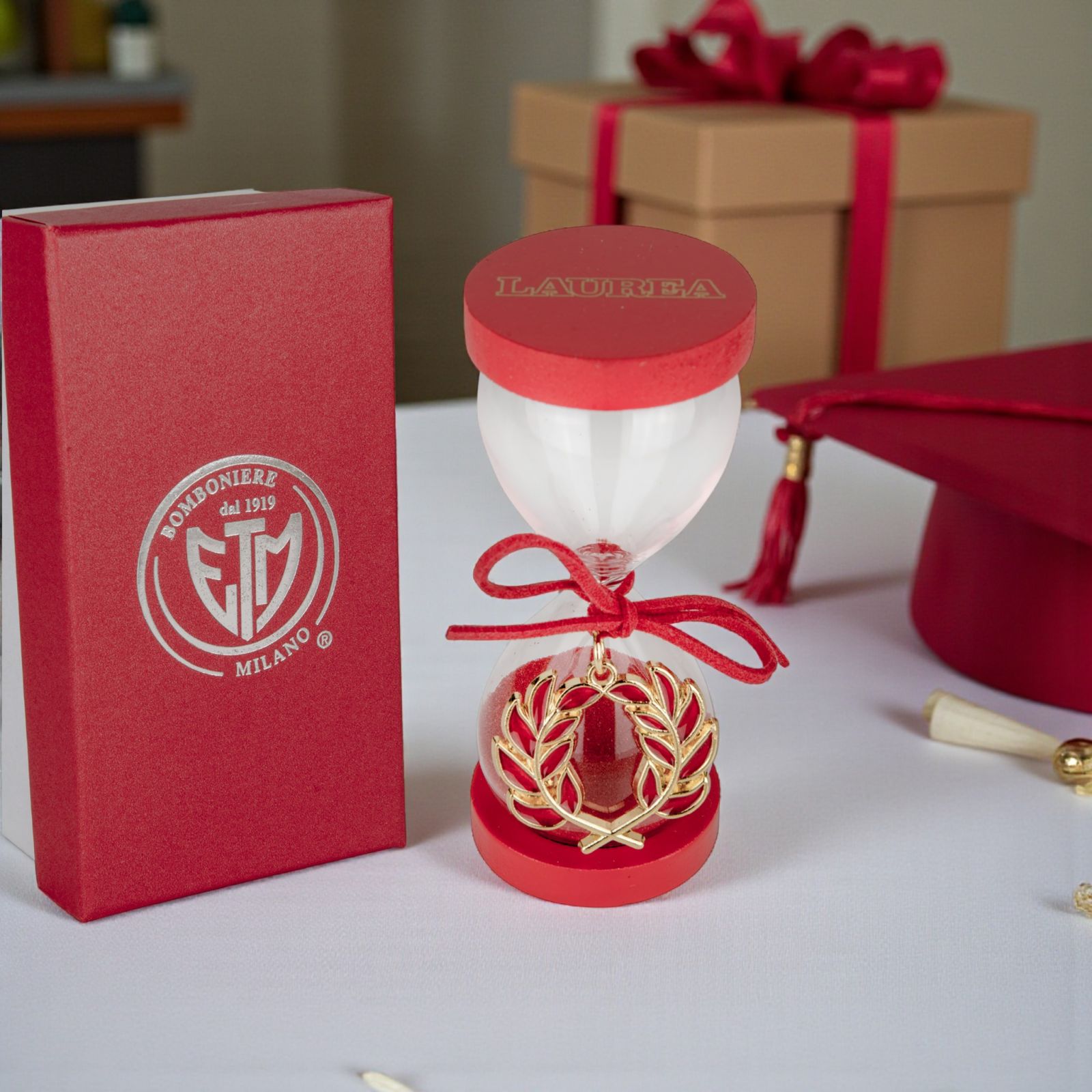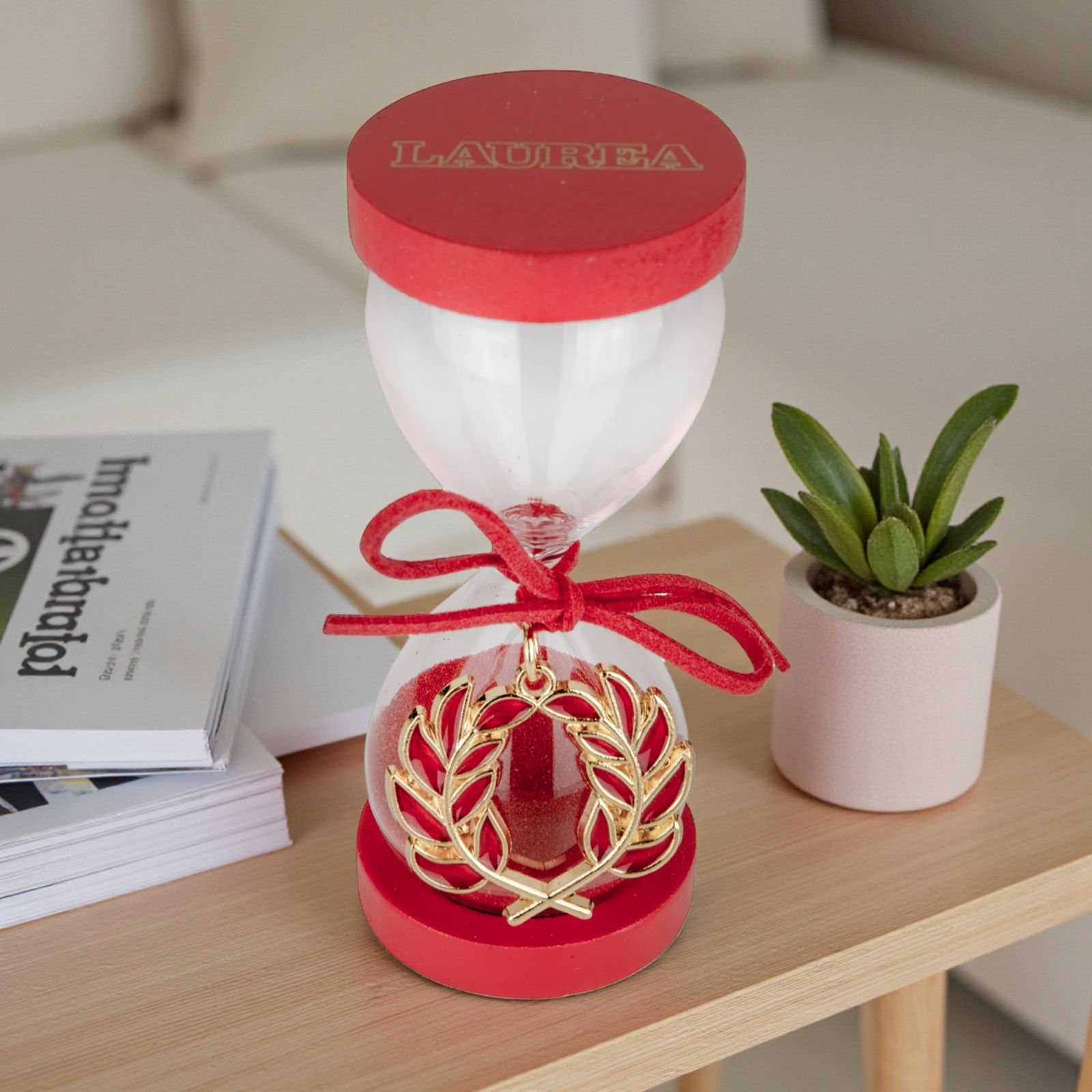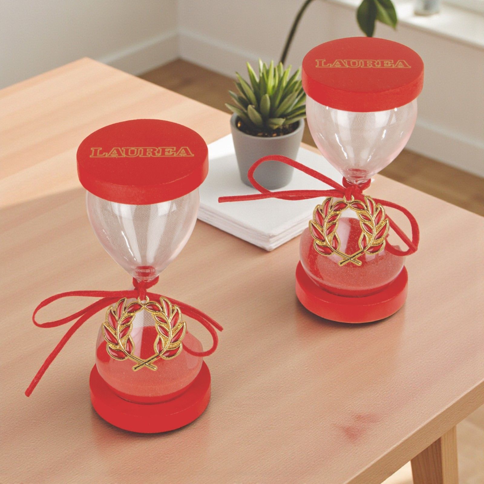Questa elegante clessidra in vetro con sabbia rossa cattura l’essenza del traguardo raggiunto. La scritta "Laurea" incisa sulle basi della clessidra e il ciondolo a forma di alloro legato con un nastrino rosso al collo rendono ogni pezzo unico e ricco di significato, un simbolo perfetto per celebrare la fatica, la dedizione e la gioia del giorno speciale.