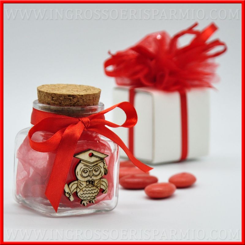 Bomboniere barattoli con tappo in sughero e vetro, decorati con gufetto laureato, applicazione in legno con incisione laser e fiocco rosso in raso, legato al collo dei barattoli portaconfetti.
