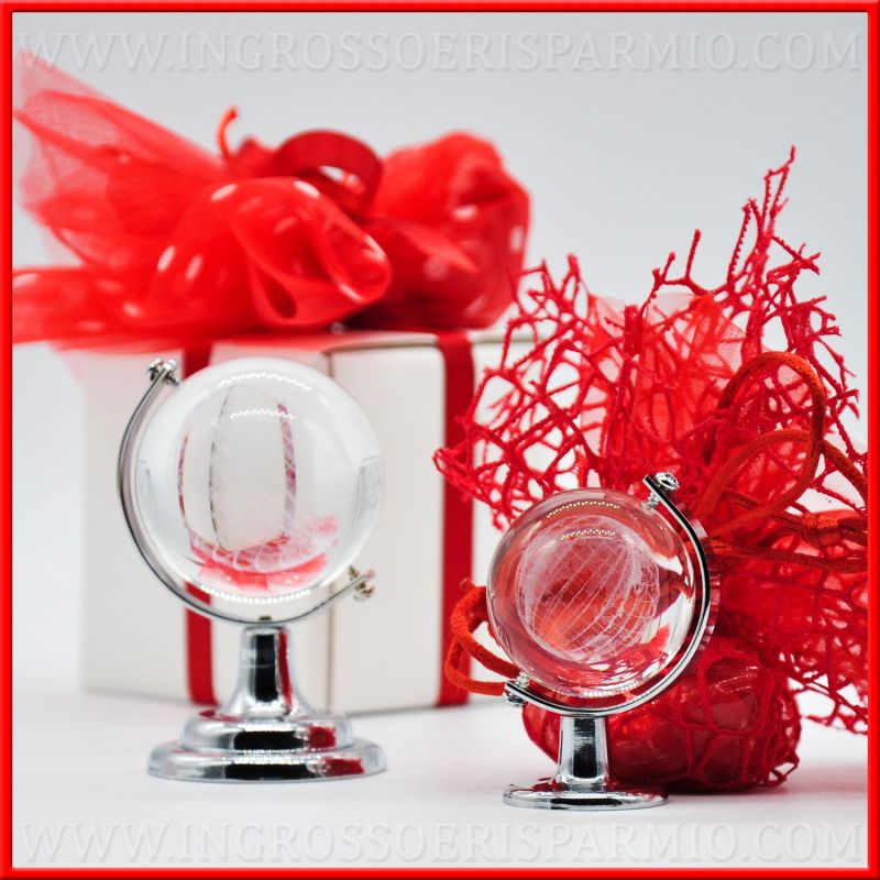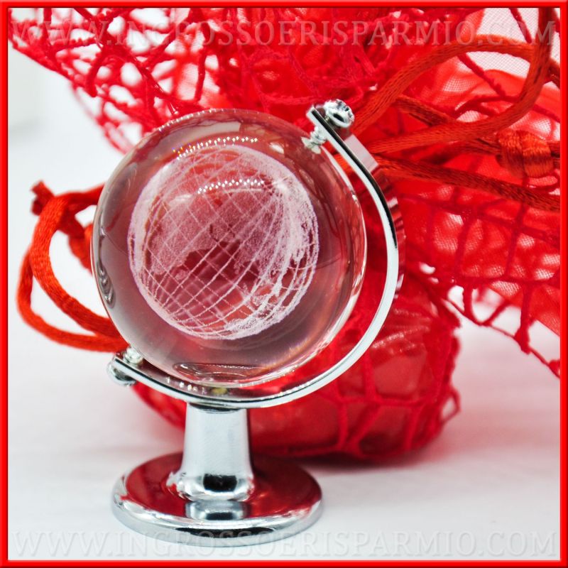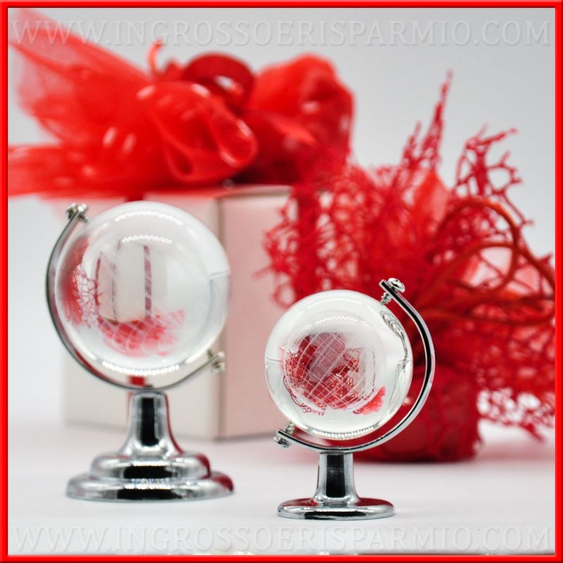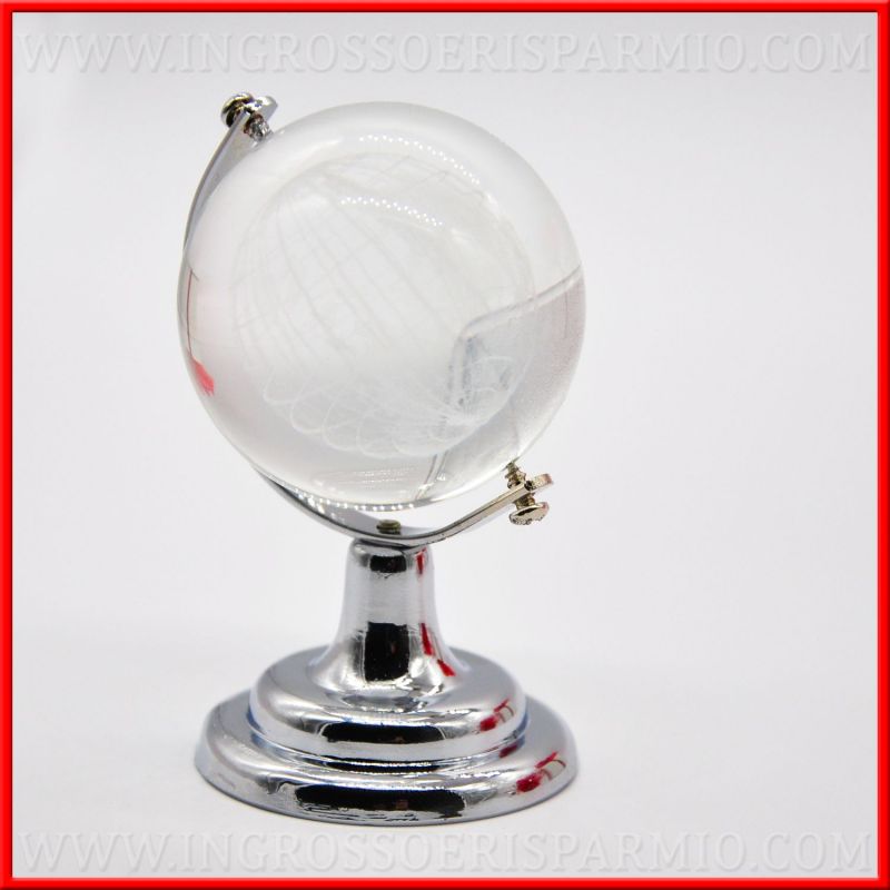 Particolari mappamondi in vetro con sostegno in metallo. Nella palla di vetro, vi è un ulteriore sfera di vetro inglobata in vetro satinato che sagoma il globo terrestre e regala uno stupendo effetto ottico.
