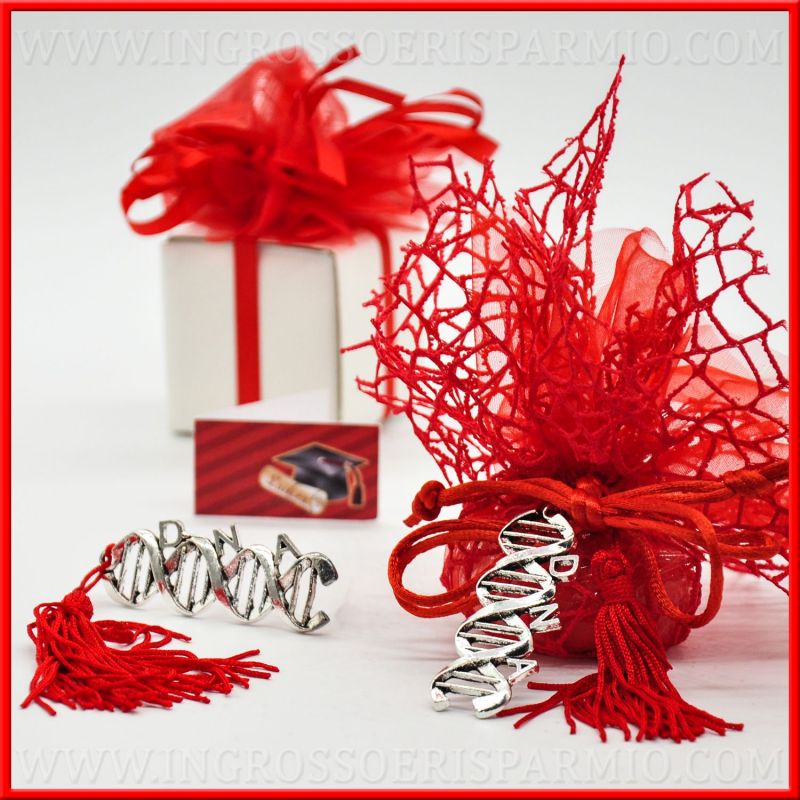 Puoi acquistare questi ricordini laurea per la creazione di bomboniere laurea medicina Fai da Te; se invece preferisci ricevere un segnaposto laurea già pronto, i nostri laboratori assembleranno il ciondolo a forma di DNA ad un sacchetto a rete rosso, completo di 5 confetti Crispo al cioccolato, o all'interno di una scatola, pronte per essere donate come vere e proprie bomboniere!