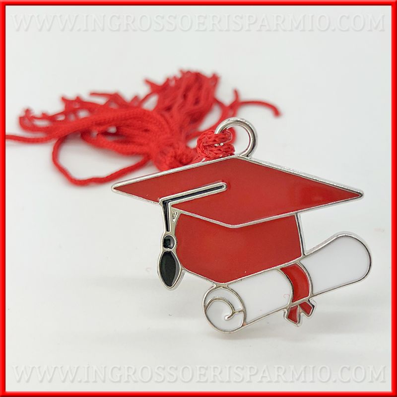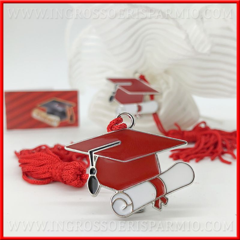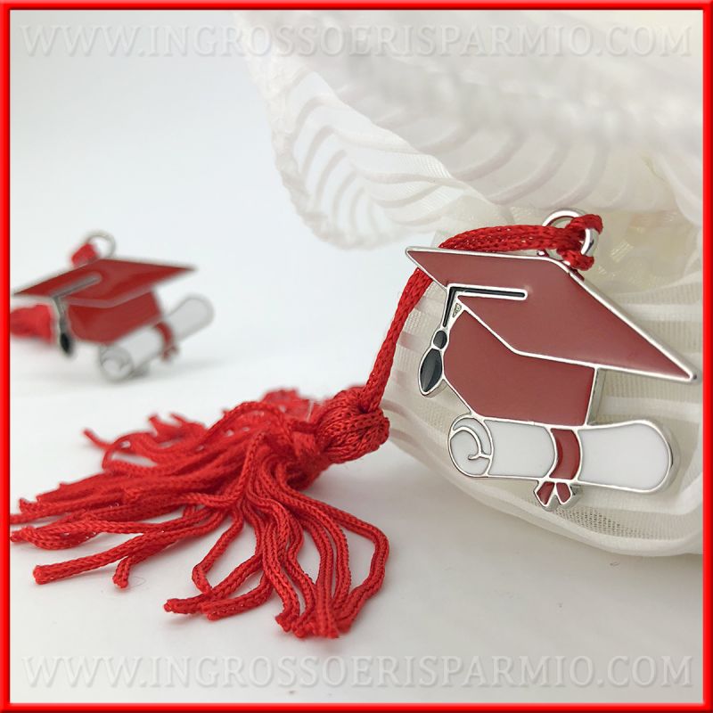 Ciondoli a forma di tocco in zama (metallo) colorato in rosso (cappello) e bianco (pergamena). All'occhiello del ciondolo bomboniera laurea è applicata una elegante nappa rossa, che arricchisce il ciondolino.
