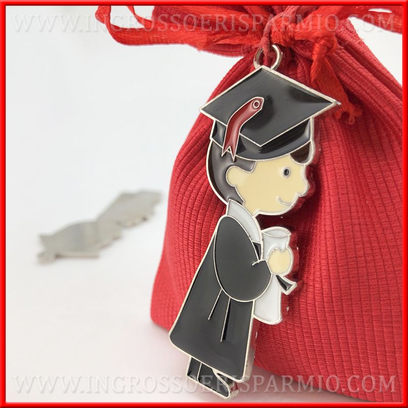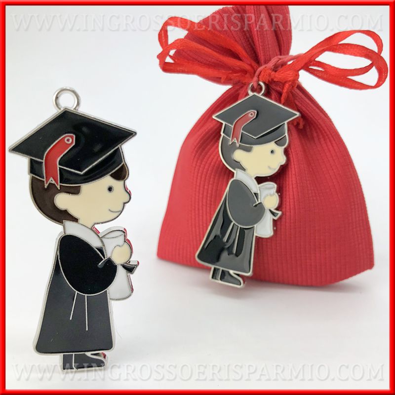Ciondoli in metallo (zama) a forma di ragazzo (maschio) laureato, rappresentato di profilo, con toga nera e tocco laurea, mentre regge in mano una pergamena.