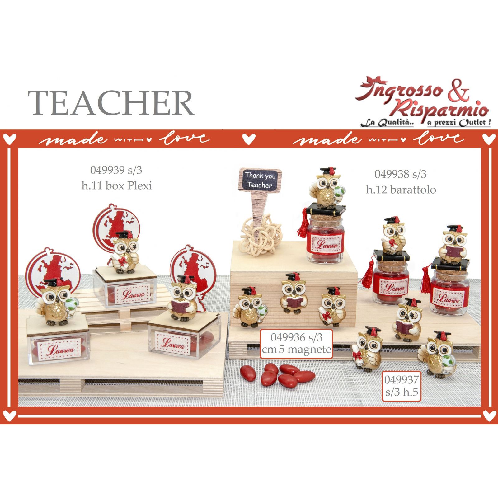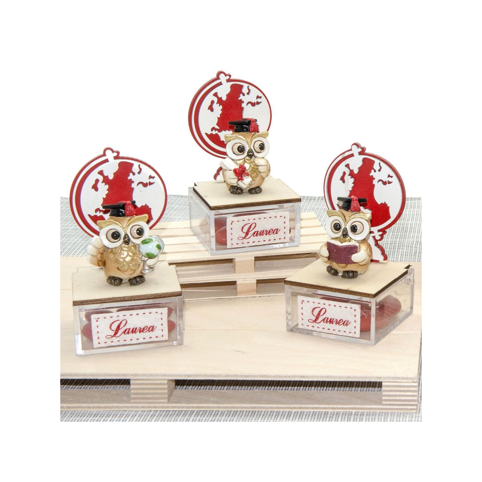 Bomboniere per laurea originali, composte da scatole in plexiglass decorate da etichetta in stoffa con scritta "Laurea" e base in legno su cui è applicata una simpatica statuina a forma di gufetto laureato in resina colorata, assortita in 3 modelli, come in foto.