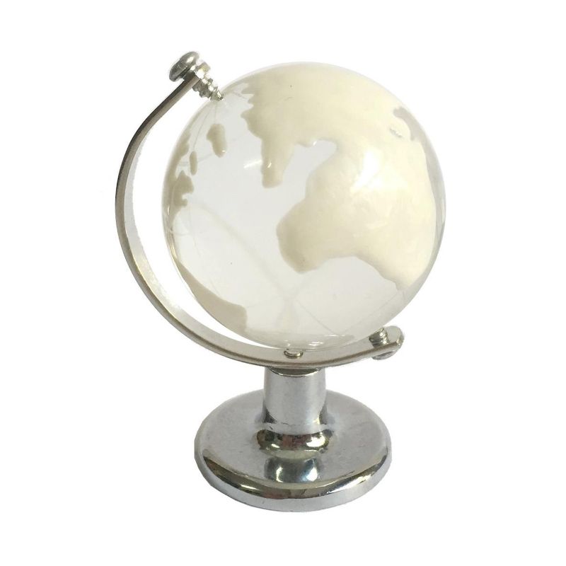 Il mappamondo bomboniera si compone di una base in metallo cromato, color argento con planisfero rotante in vetro cristallino, sorretto da un supporto in metallo e viti. I continenti sono segnati in vetro bianco.