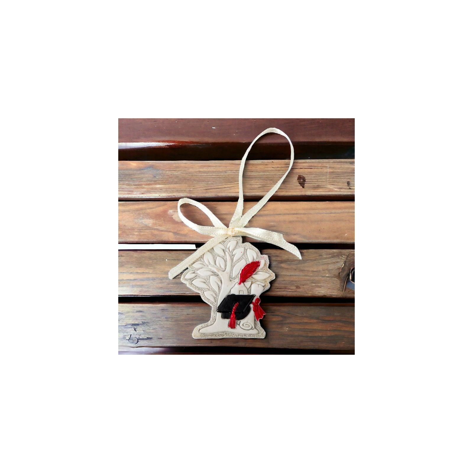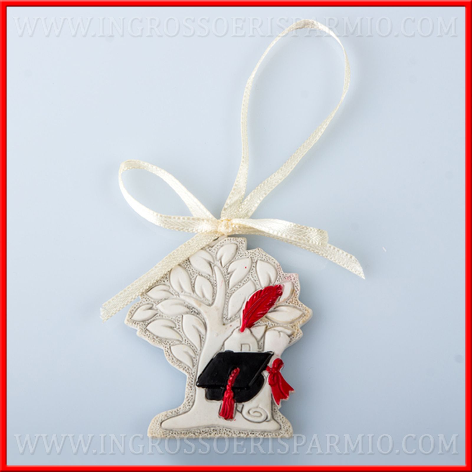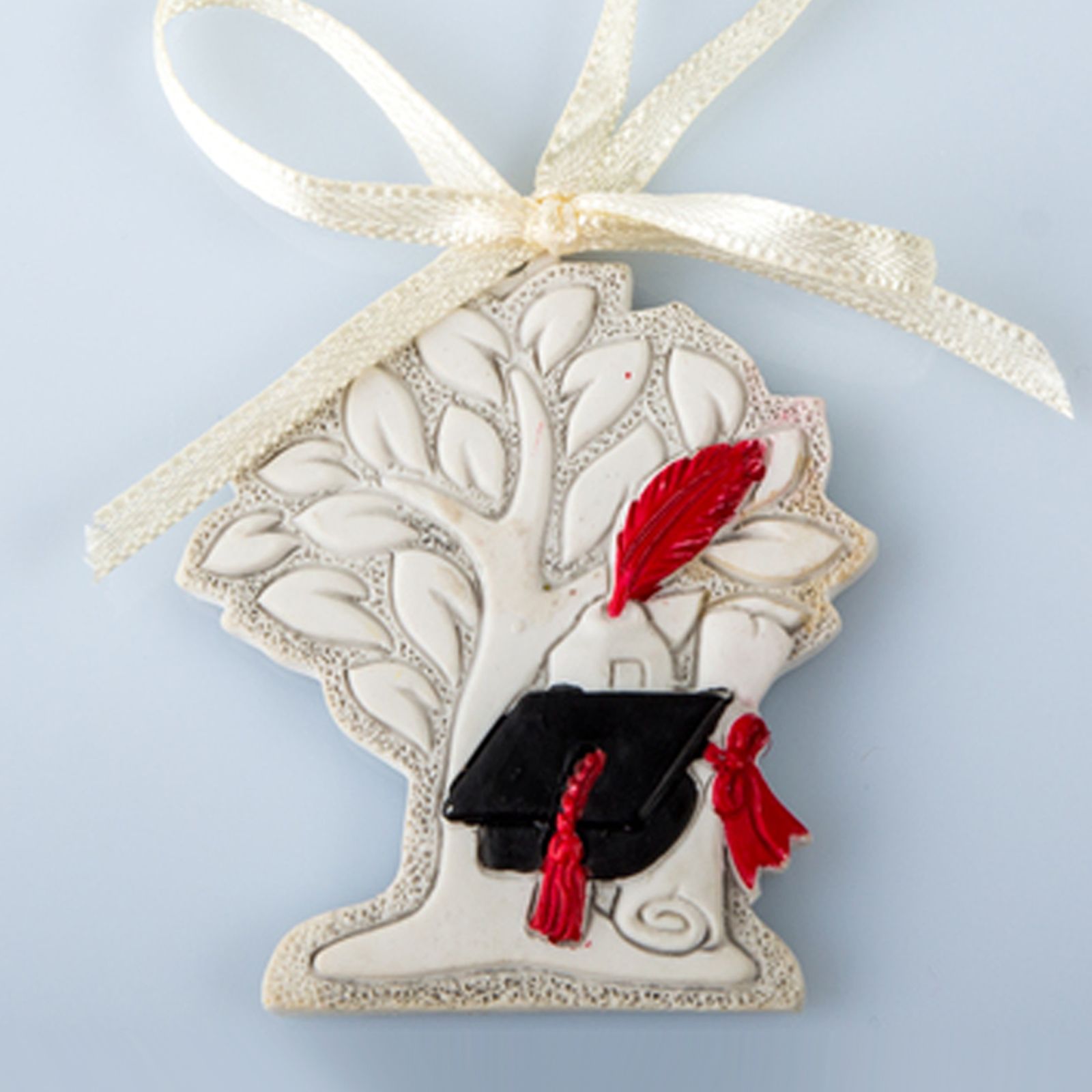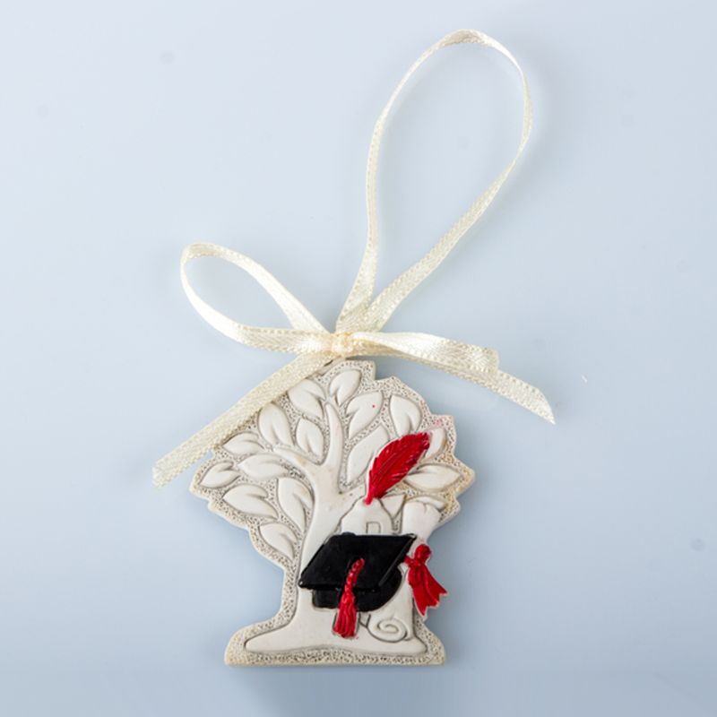 Bomboniere albero della vita laurea ad appendino, in resina bianca/panna con raffigurazione centrale di tocco nero per laurea con nappina rossa, pergamena e calamaio. Un foro, nella parte superiore della piccola icona, consente la funzione di appendino, attraverso un nastro in raso avorio.