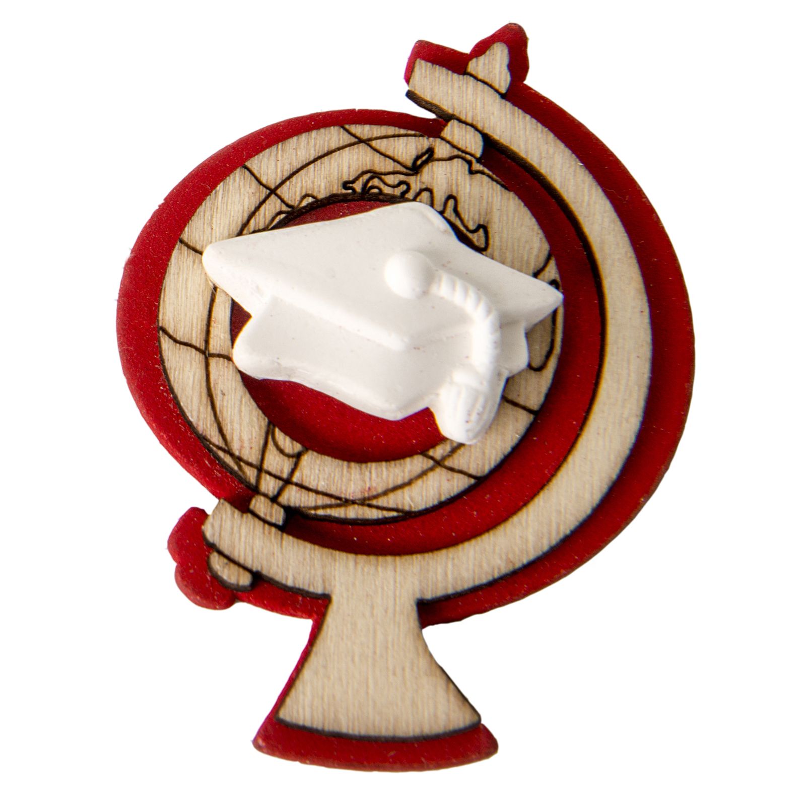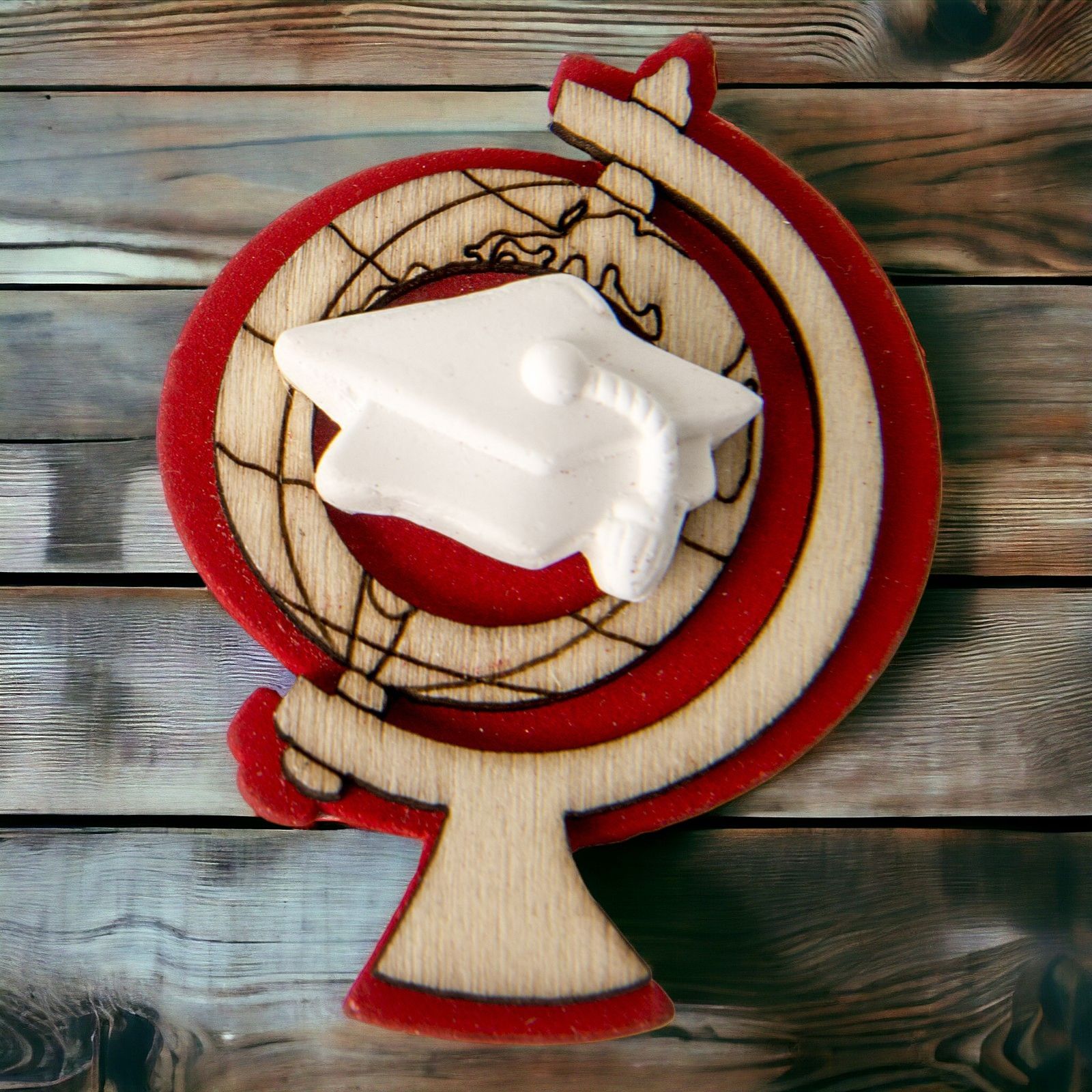I nostri gessetti decorativi con base in legno che raffigura un mappamondo in tonalità naturale con sfondo rosso su cui è applicato un piccolo tocco con pergamena in gesso bianco.