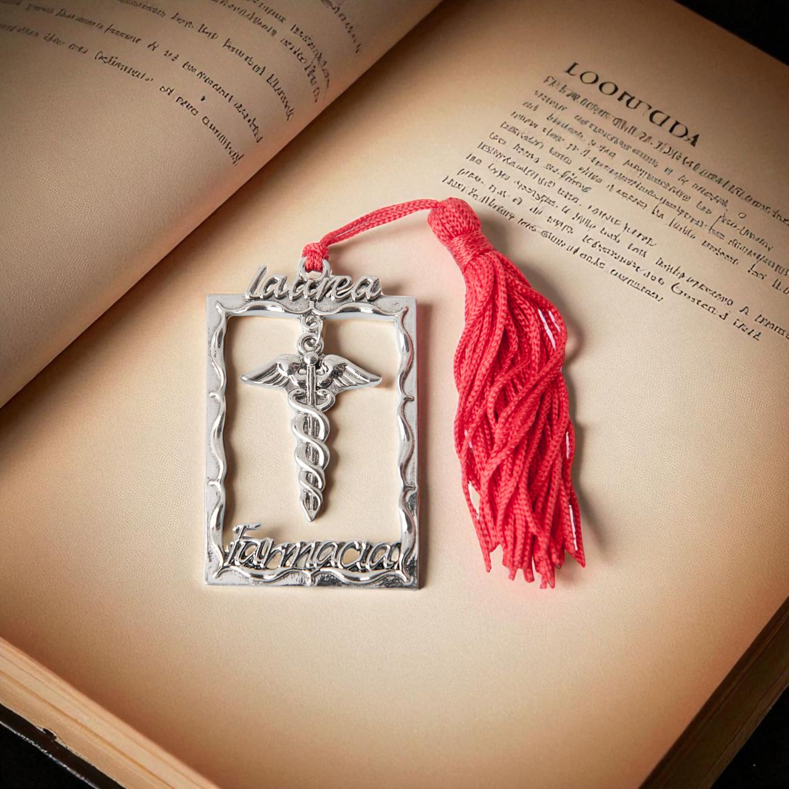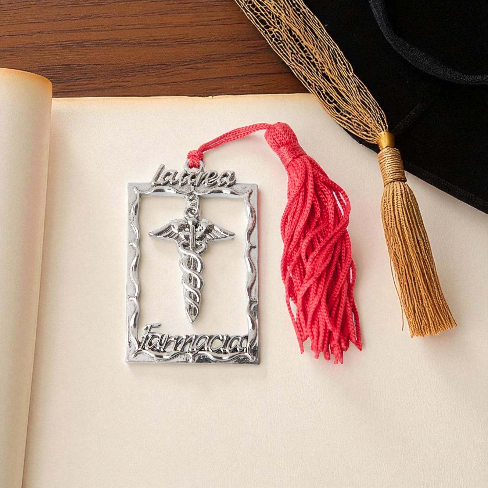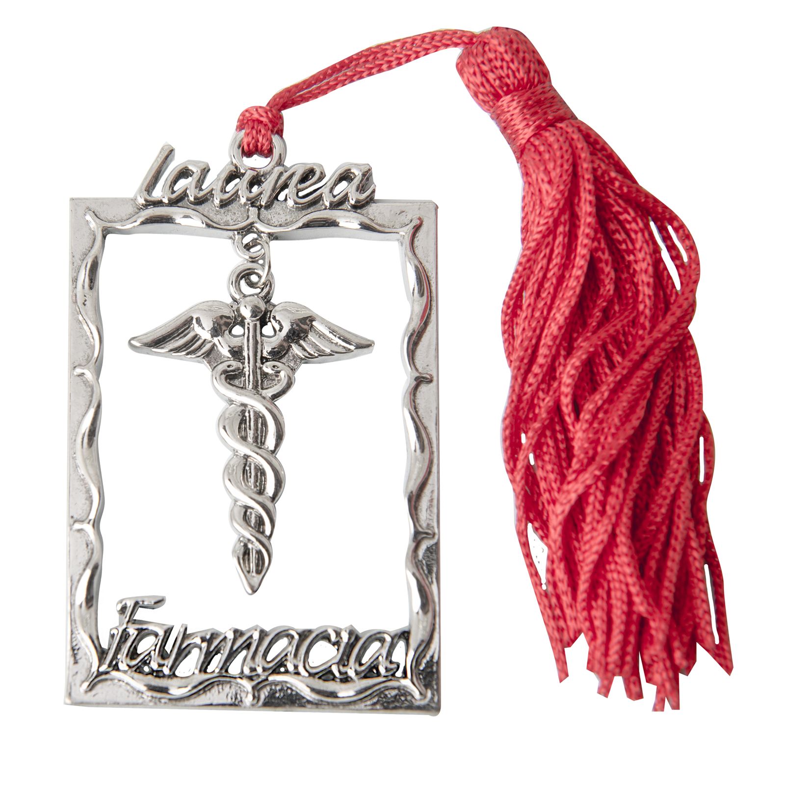 Ciondolo a base rettangolare in zama, con sulla parte esterna i termini "Laurea" e "Farmacia" e nella parte interna un caduceo, il tipico simbolo dell'ordine dei medici e farmacisti. Un piccolo oggettino laurea di pregio da regalare ai tuoi invitati!