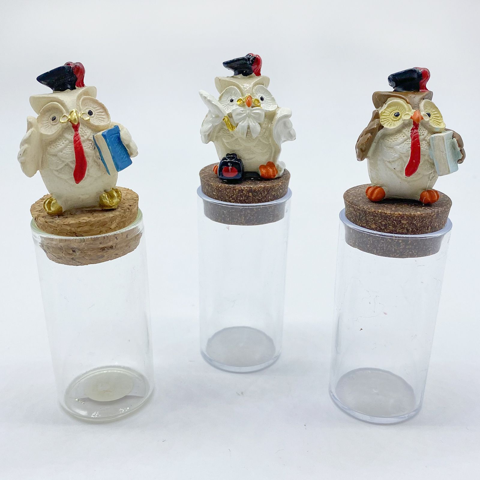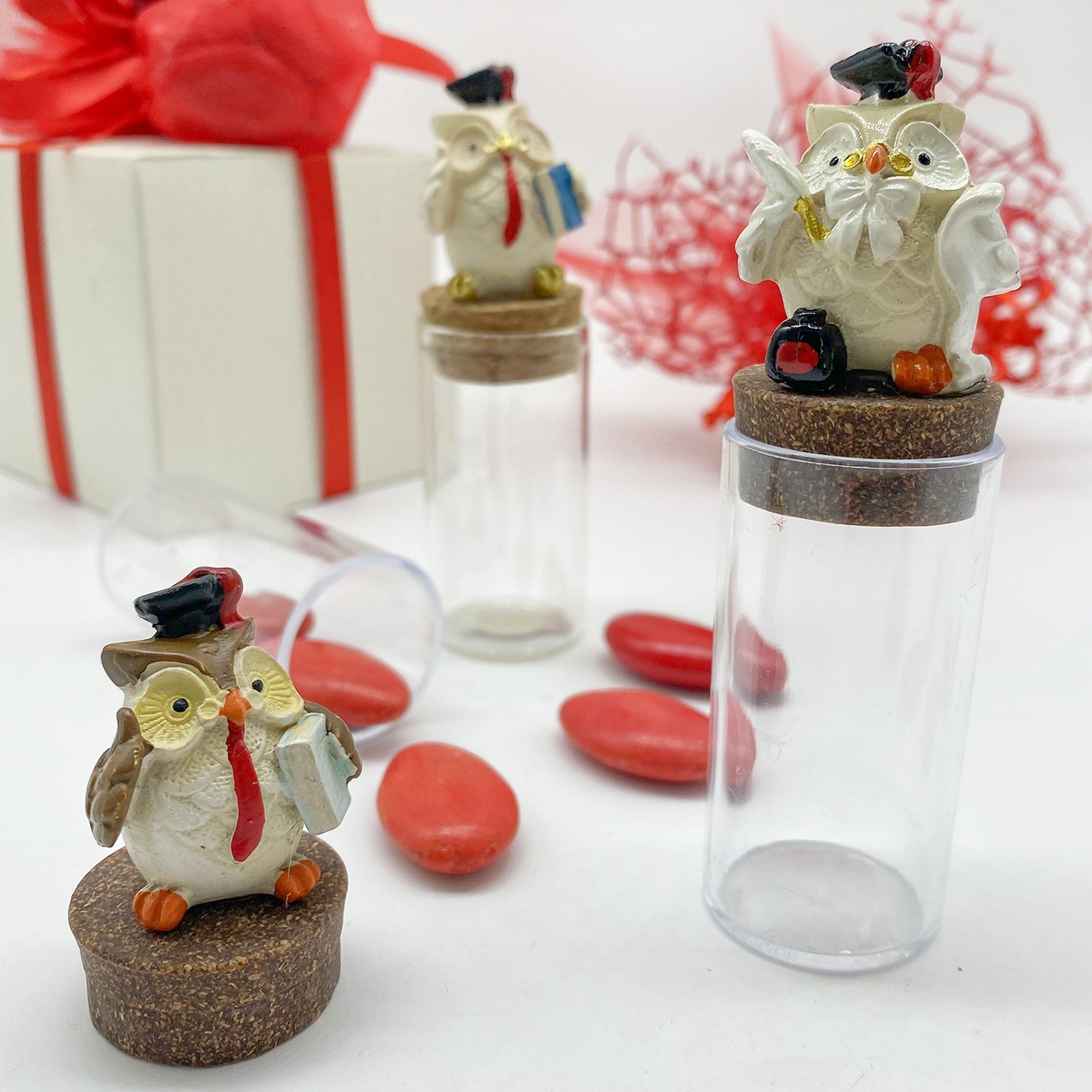 Eccoti le nostre fiale per confetti in vetro, delle particolarissime provette trasparenti per contenere la tua confettata laurea, munite di tappo di chiusura in sughero al di sopra del quale è posto un piccolo gufetto laureato, assortito in 3 varianti come in foto.