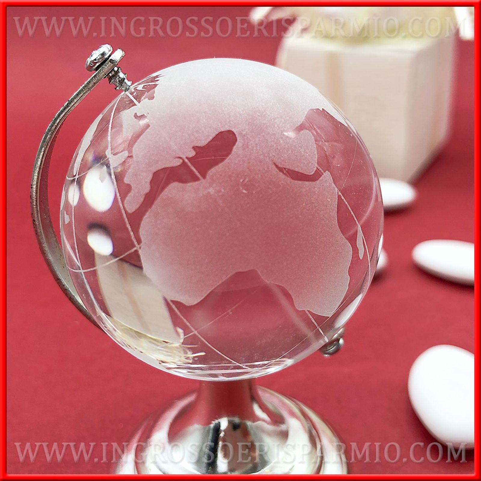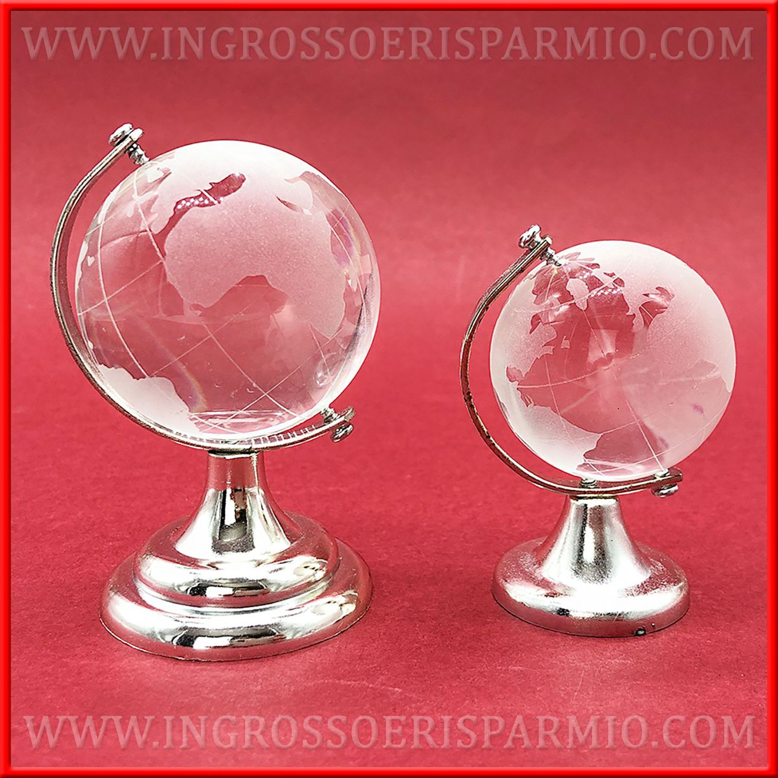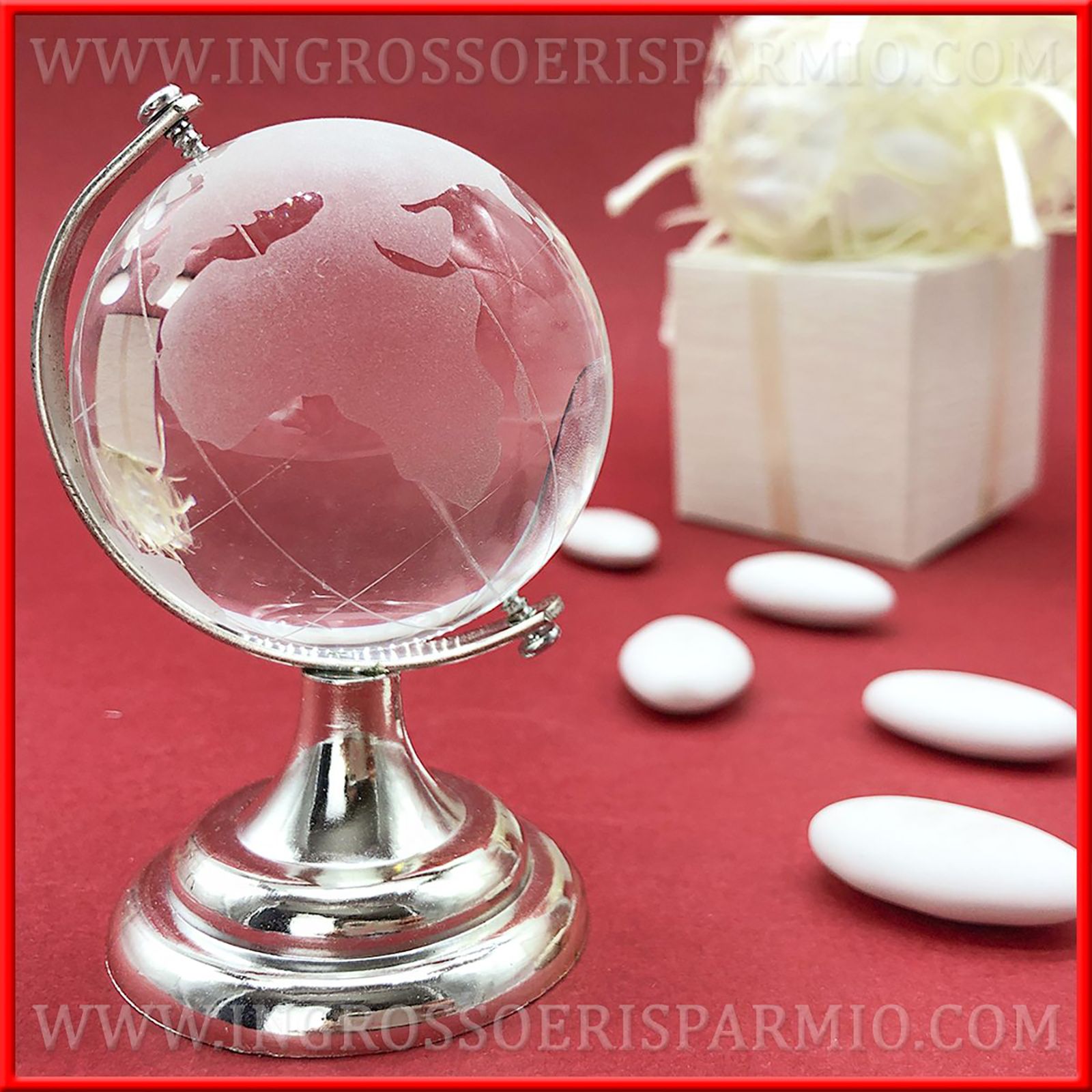 Che ne dici di acquistare subito i nostri mappamondi rotanti in vetro? La stampa dei continenti è in un delicato grigio ghiaccio e la struttura portante che permette al globo di roteare è in metallo. I mappamondo bomboniere sono disponibili in due dimensioni: