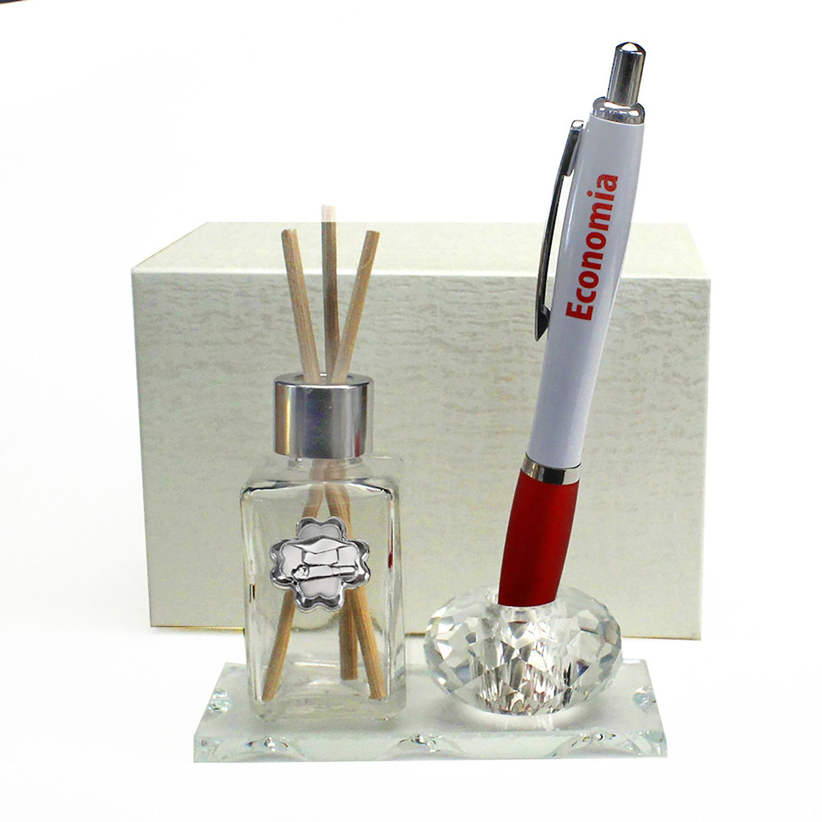 Eleganti profumatori per ambienti con base e flaconcino in vetro su cui è presente una placchetta in lamina argentata a forma di quadrifoglio con un'incisione interna a sbalzo raffigurante un tocco e una pergamena. Accanto al flaconcino è presente un portapenne in cristallo con già una penna a sfera in omaggio.