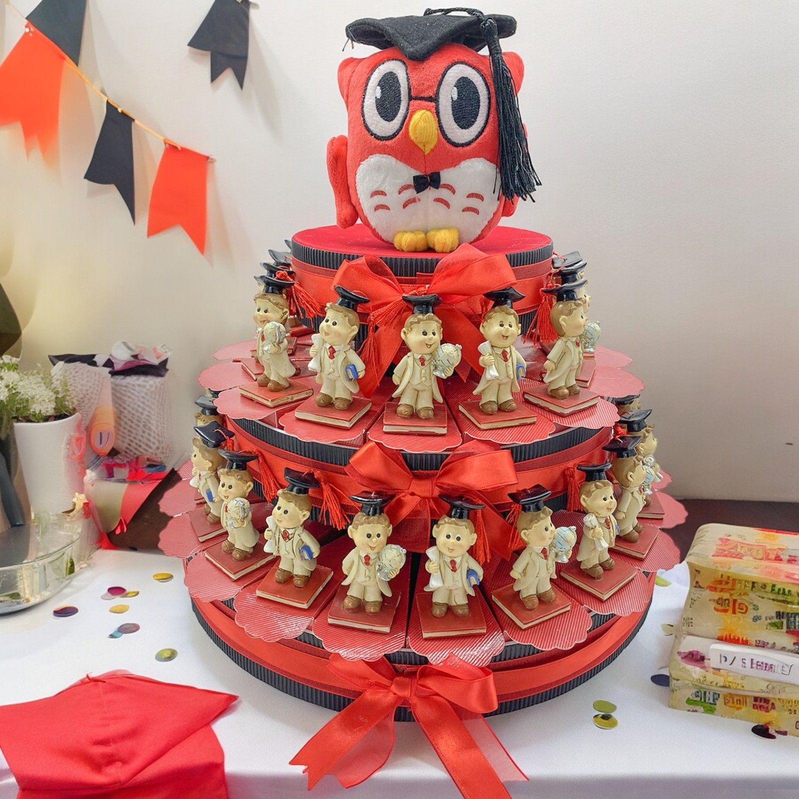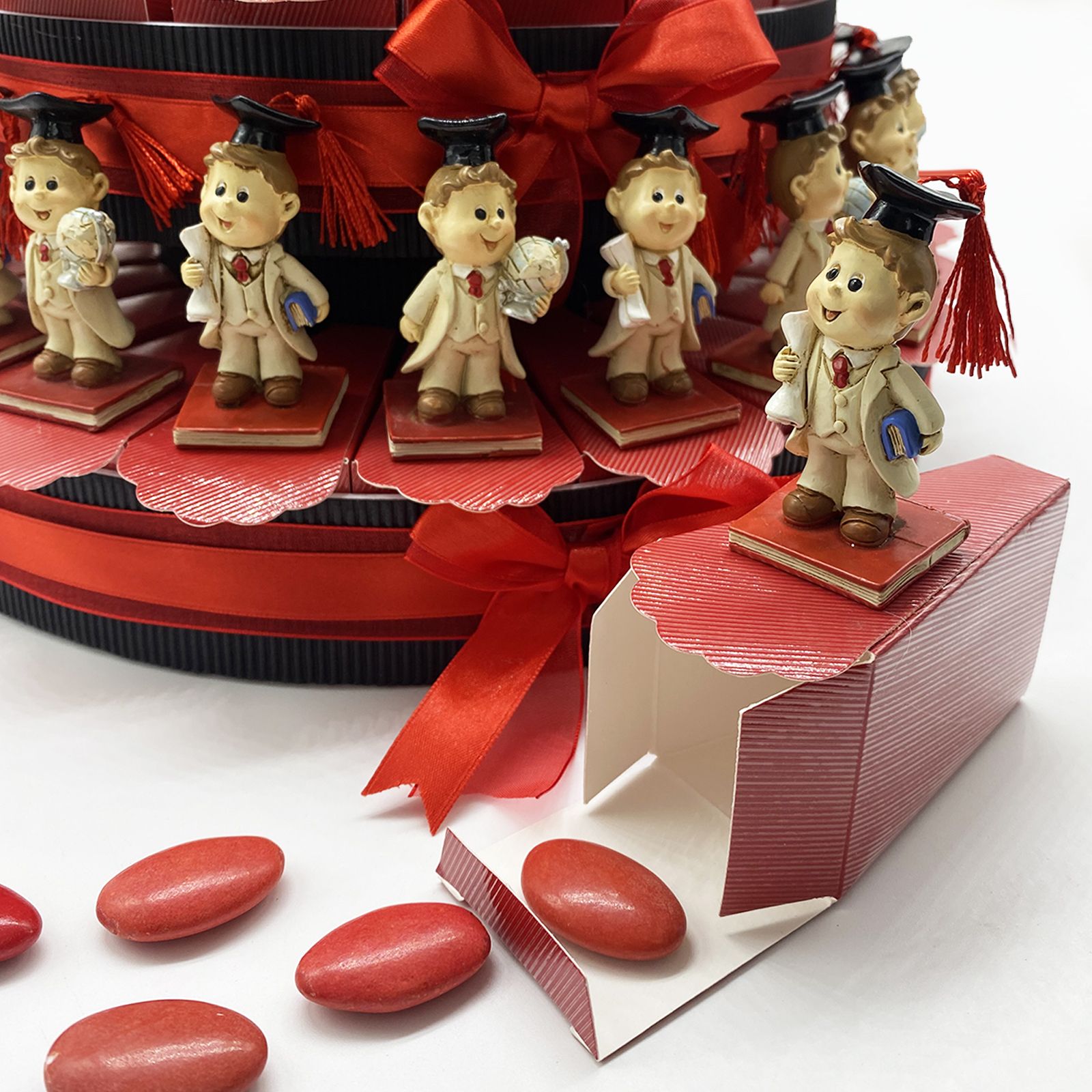 Acquista online questa bellissima torta di bomboniere in cartoncino nero e rosso, a tre piani con bordi rivestiti di nastro e fiocchi. La torta è composta da 36 fette, su ogni fetta troverai una statuina in resina raffigurante un giovane laureato, raffigurato in due varianti. Sulla parte superiore invece, rivestita in velluto, troverai un morbido peluche a forma di gufetto.