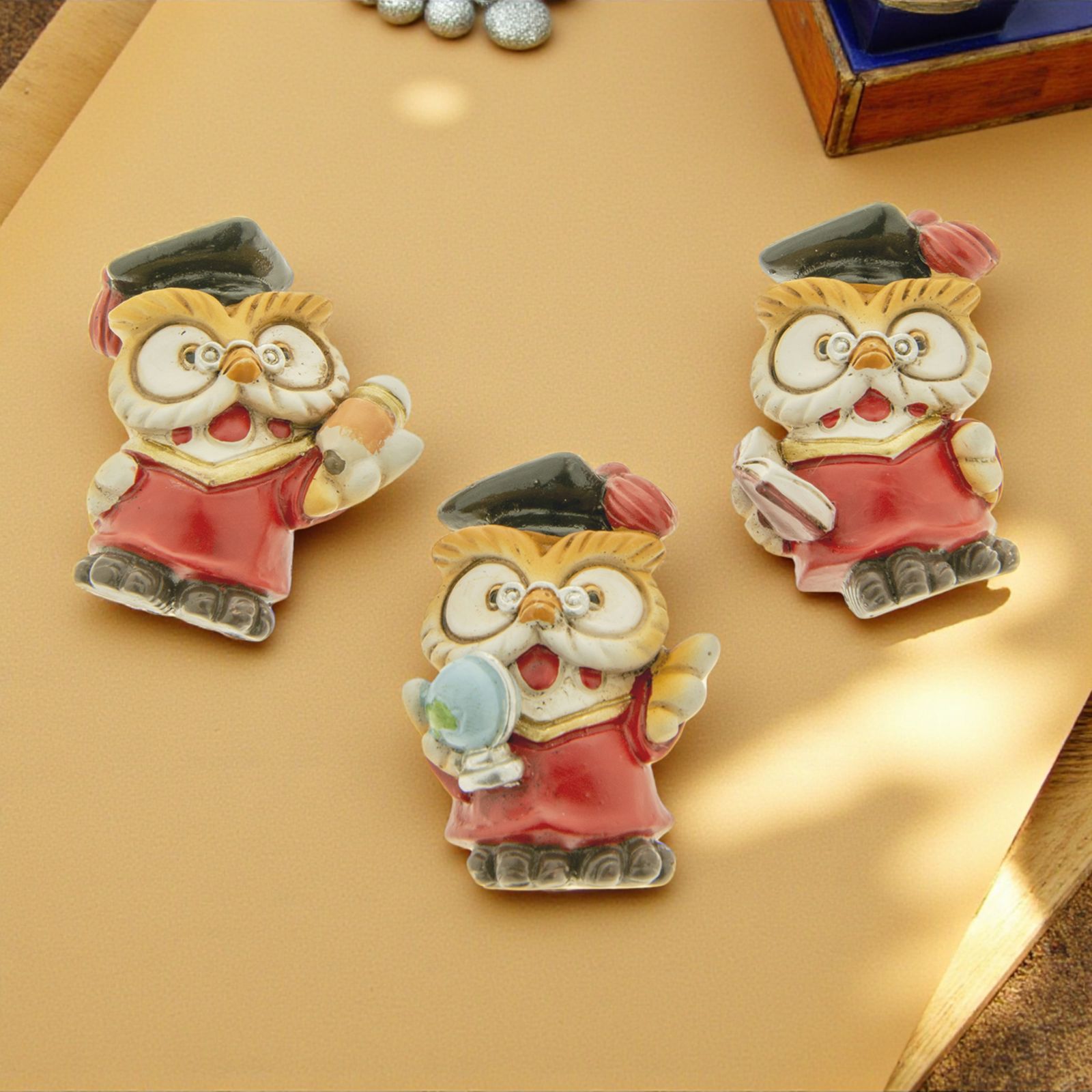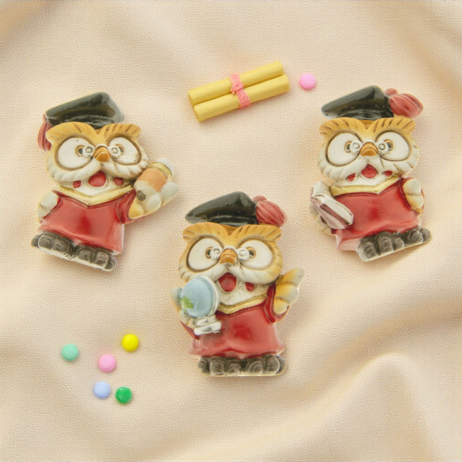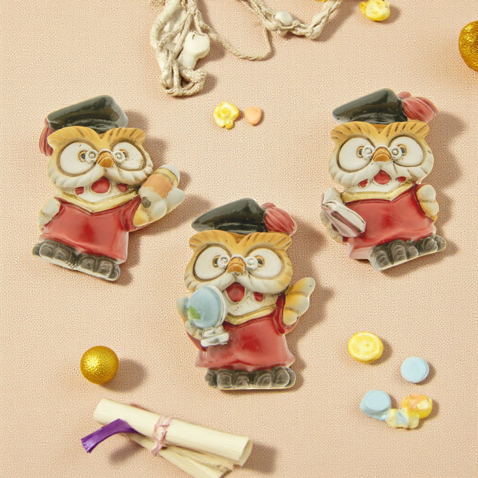 Calamite bomboniere per laurea, a forma di gufetto laureato, con tocco nero, assortiti in 3 varianti di modello, con libro, mappamondo e matita. Bomboniere gufi con magneti sul retro, realizzati in resina colorata.
