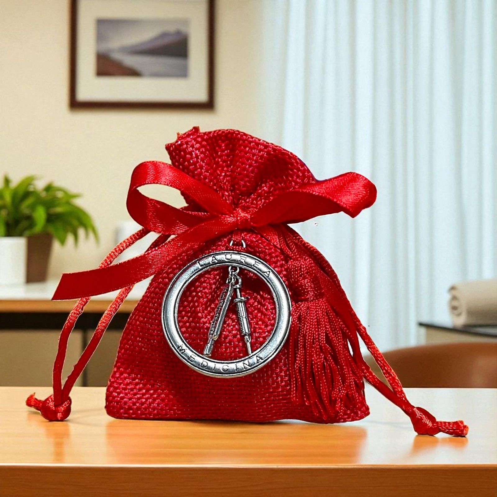 Ciondoli tondi, in zama, con sui bordi i termini "Laurea" e "Medicina" e all'interno appesi un termometro e una siringa. Sulla parte superiore vi è un foro con legata una piccola nappina rossa.