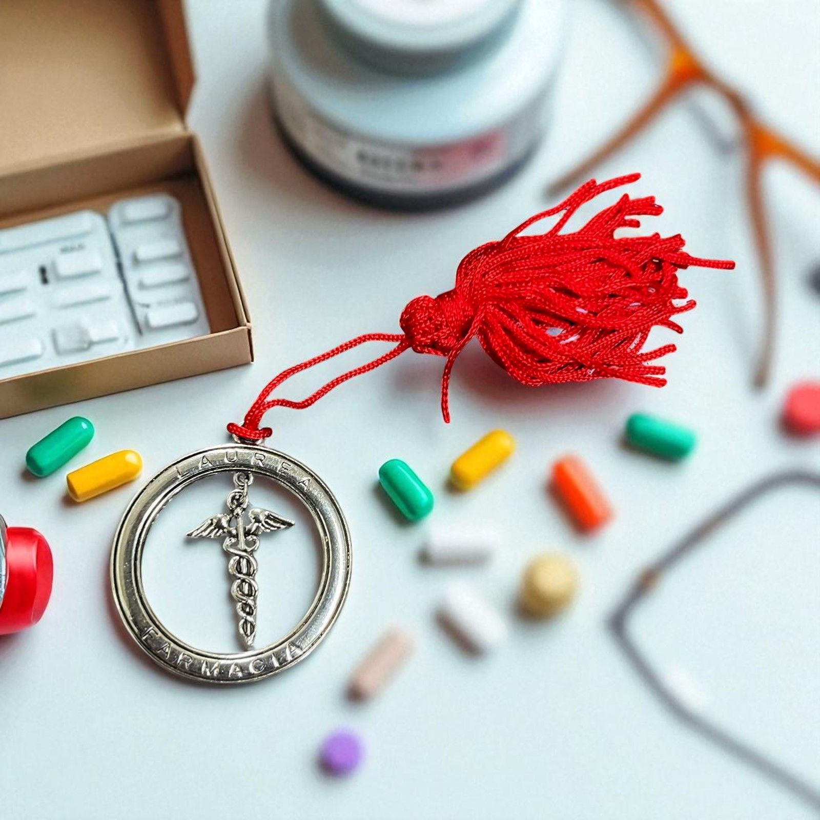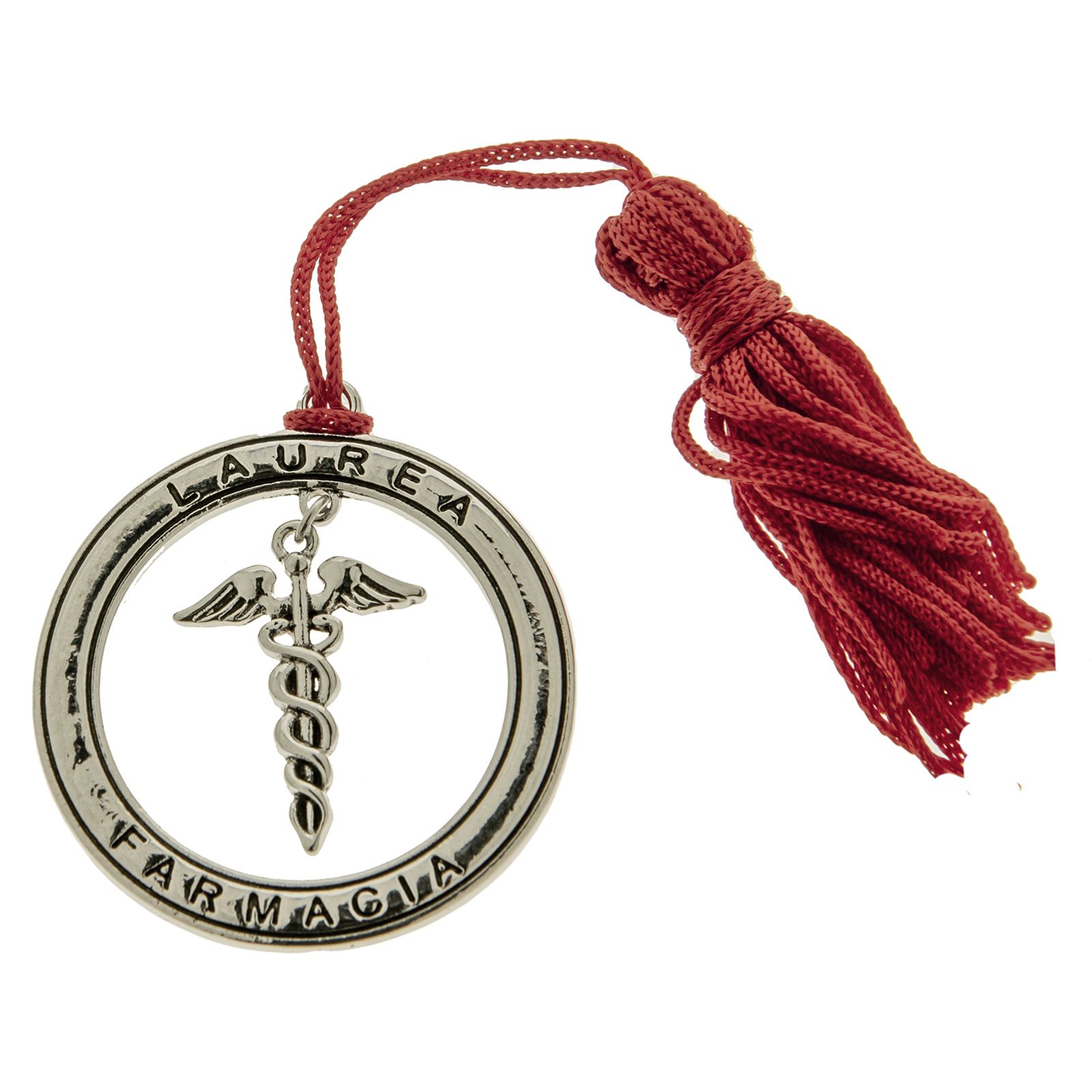 Ciondolo in zama circolare, con sul bordo esterno i termini "Laurea" e "Farmacia" e nella parte interna un caduceo, il tipico simbolo dell'ordine dei medici e farmacisti. Un piccolo oggettino laurea di pregio da regalare ai tuoi invitati!