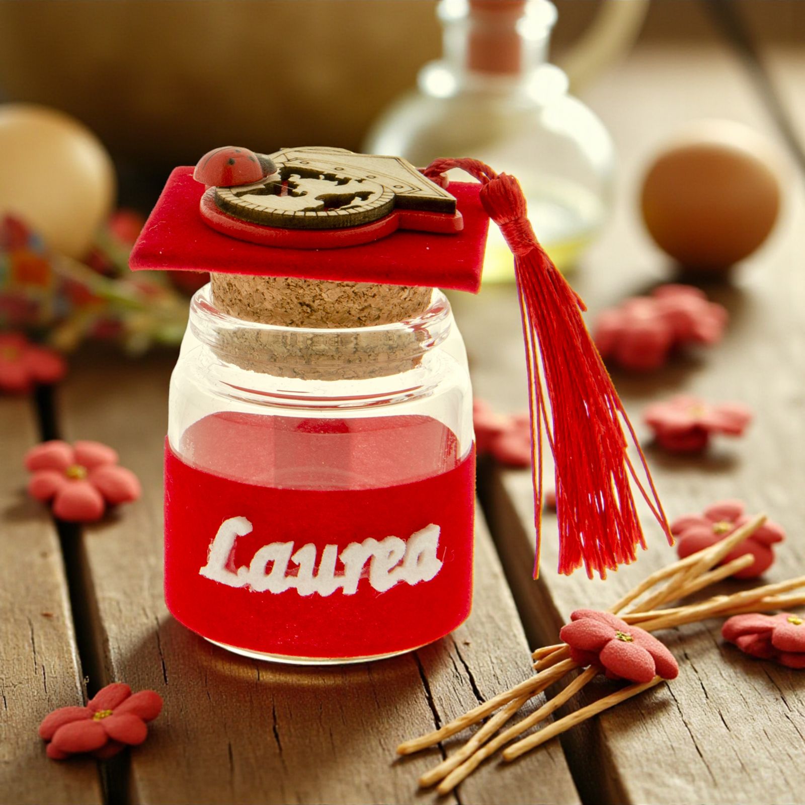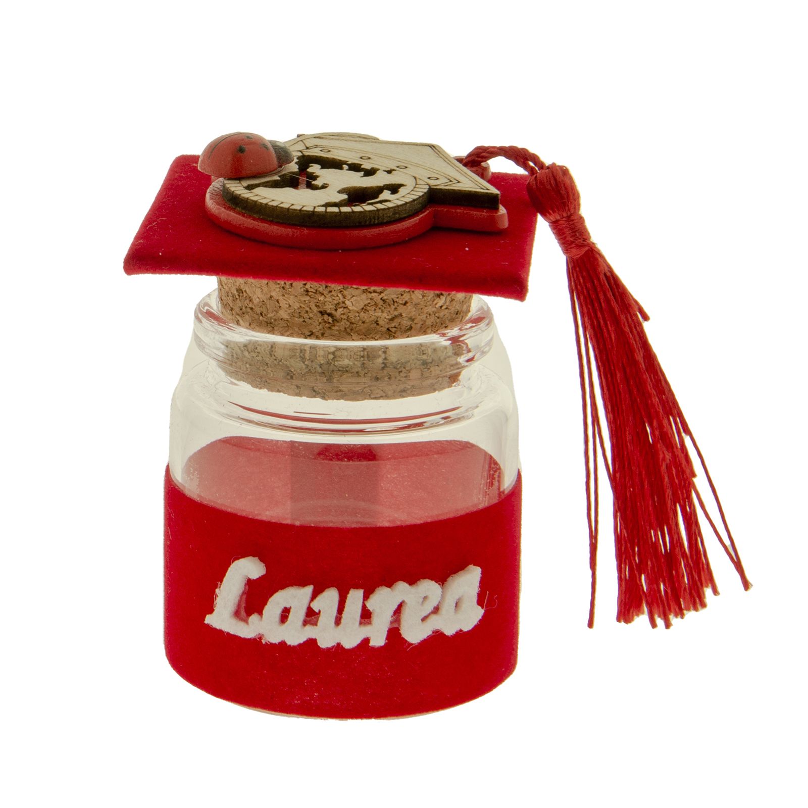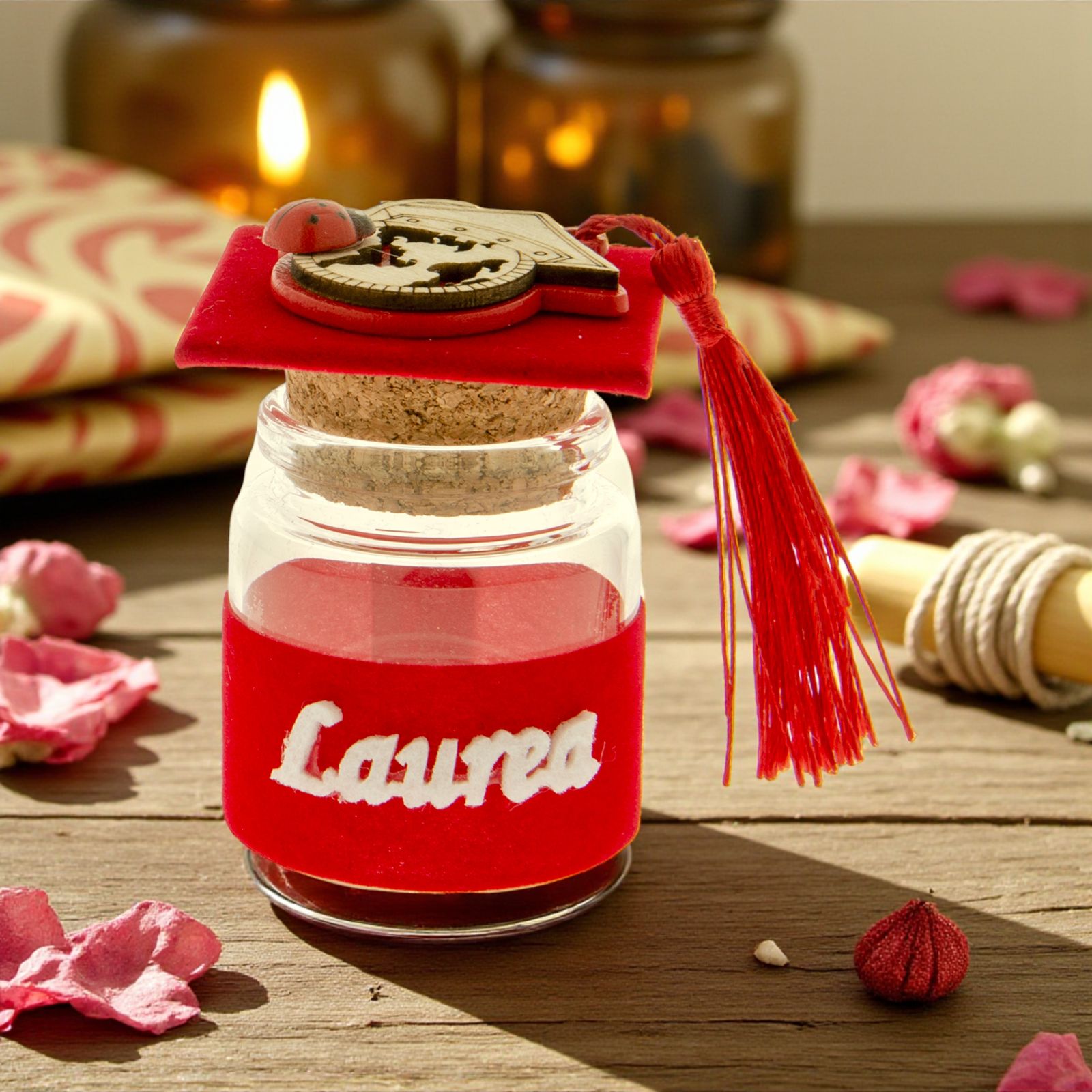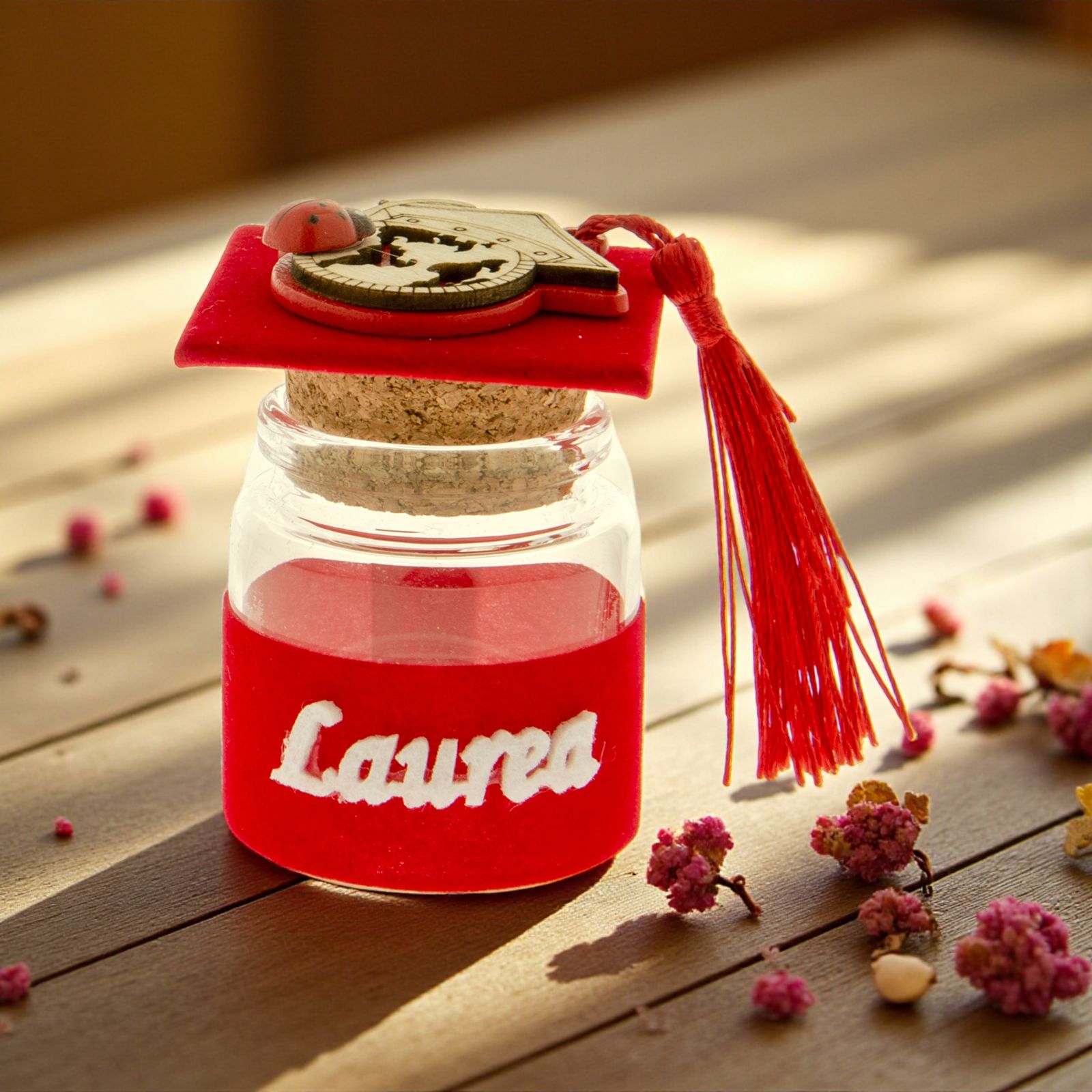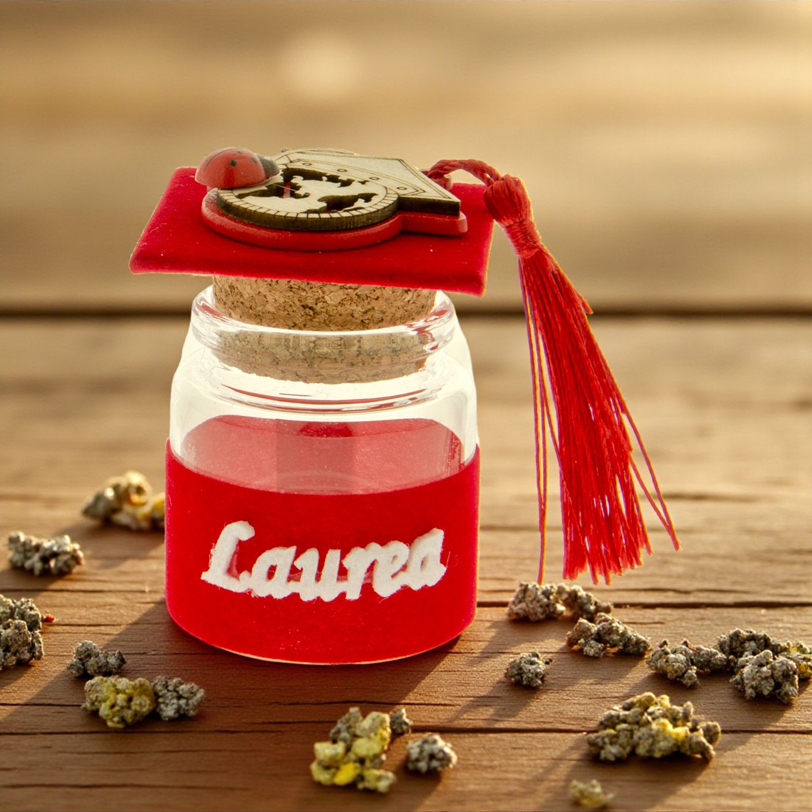 Disponibili per te questi barattolini in vetro con tappo in sughero, che diventa un tocco rosso su cui è presente un mappamondo in legno con coccinella e nappina rossa. Il vasetto è inoltre circondato da un nastro rosso con la scritta in bianco "Laurea".