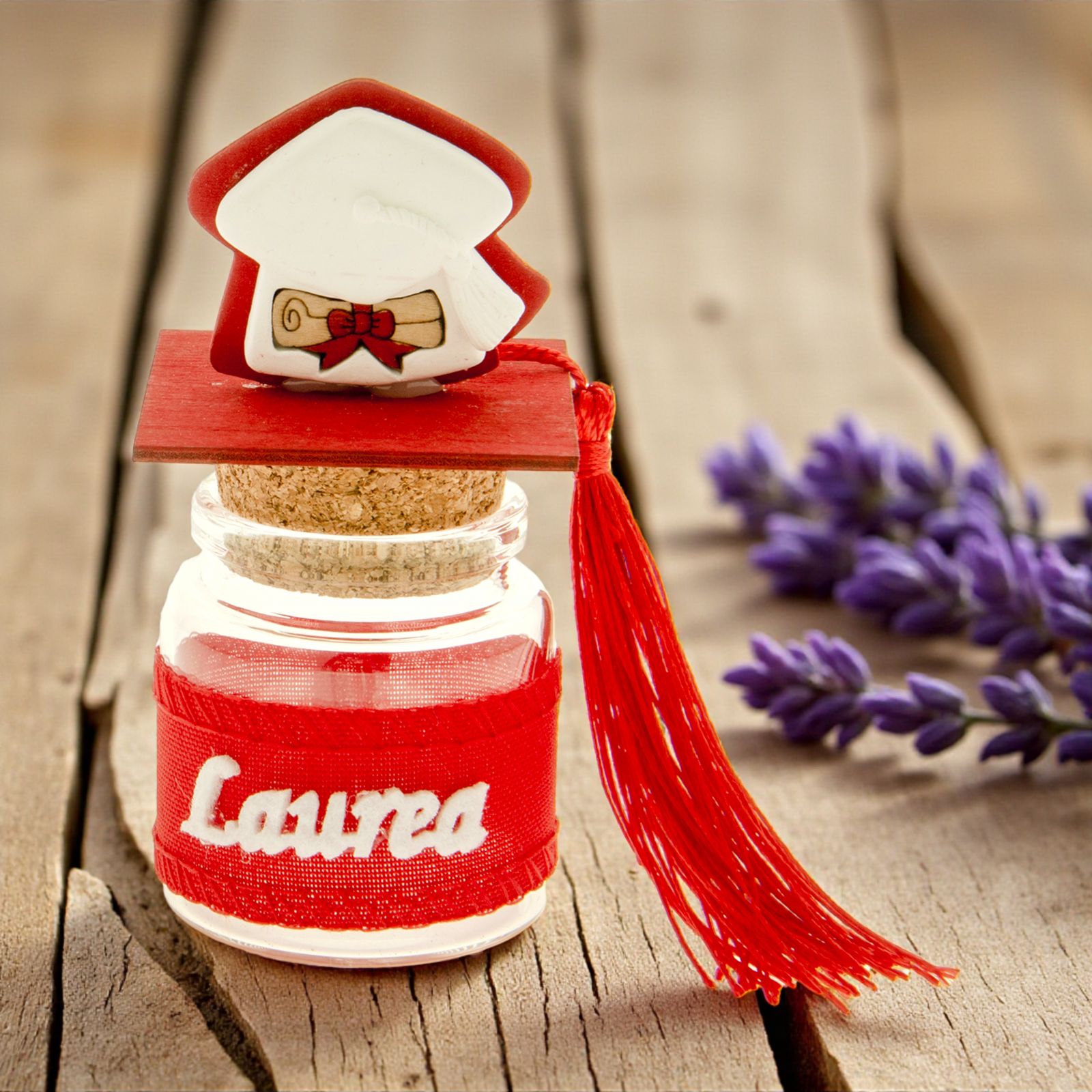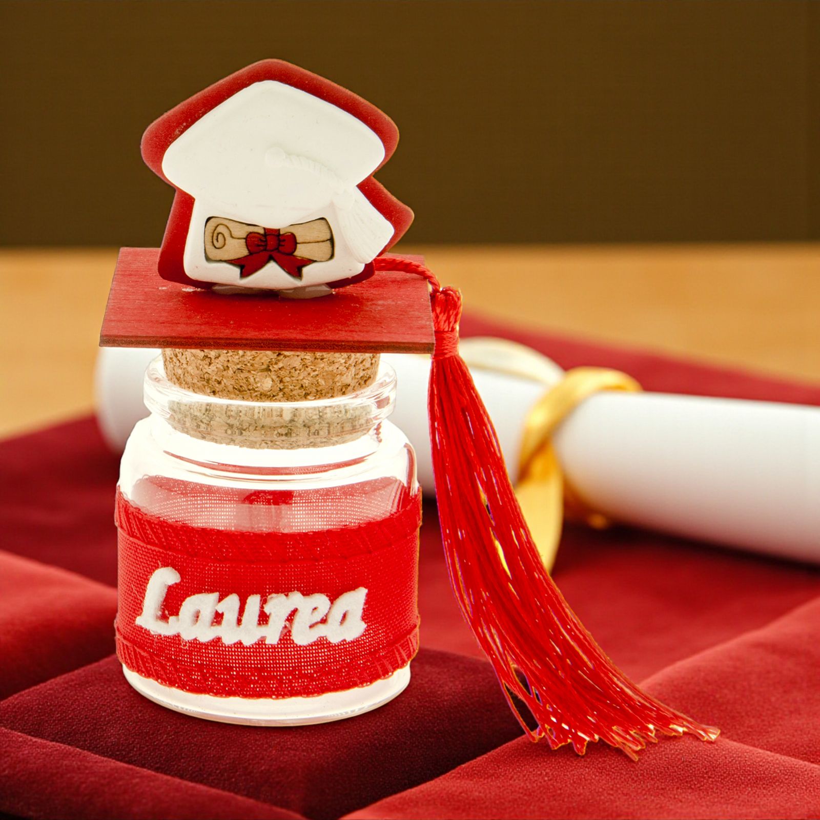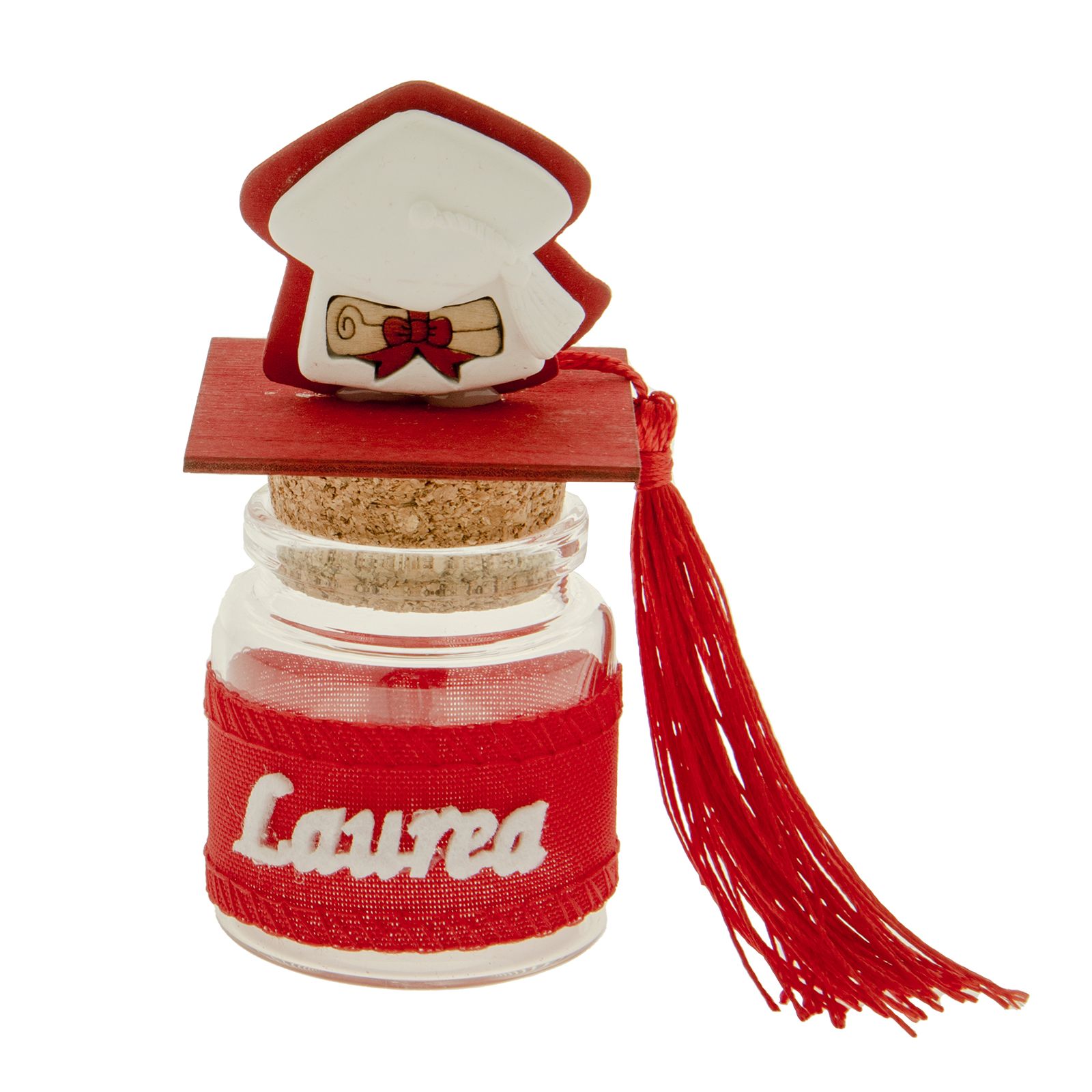 Acquista qui le tue bomboniere laurea! Scegli questi barattolini portaconfetti in vetro con tappo in sughero che si trasforma in un tocco laurea rosso con nappina in tessuto dello stesso colore e gessetto bianco a forma di pergamena con tocco. Il bordo del vasetto è parzialmente rivestito da una striscia di tessuto rosso con la scritta "Laurea".