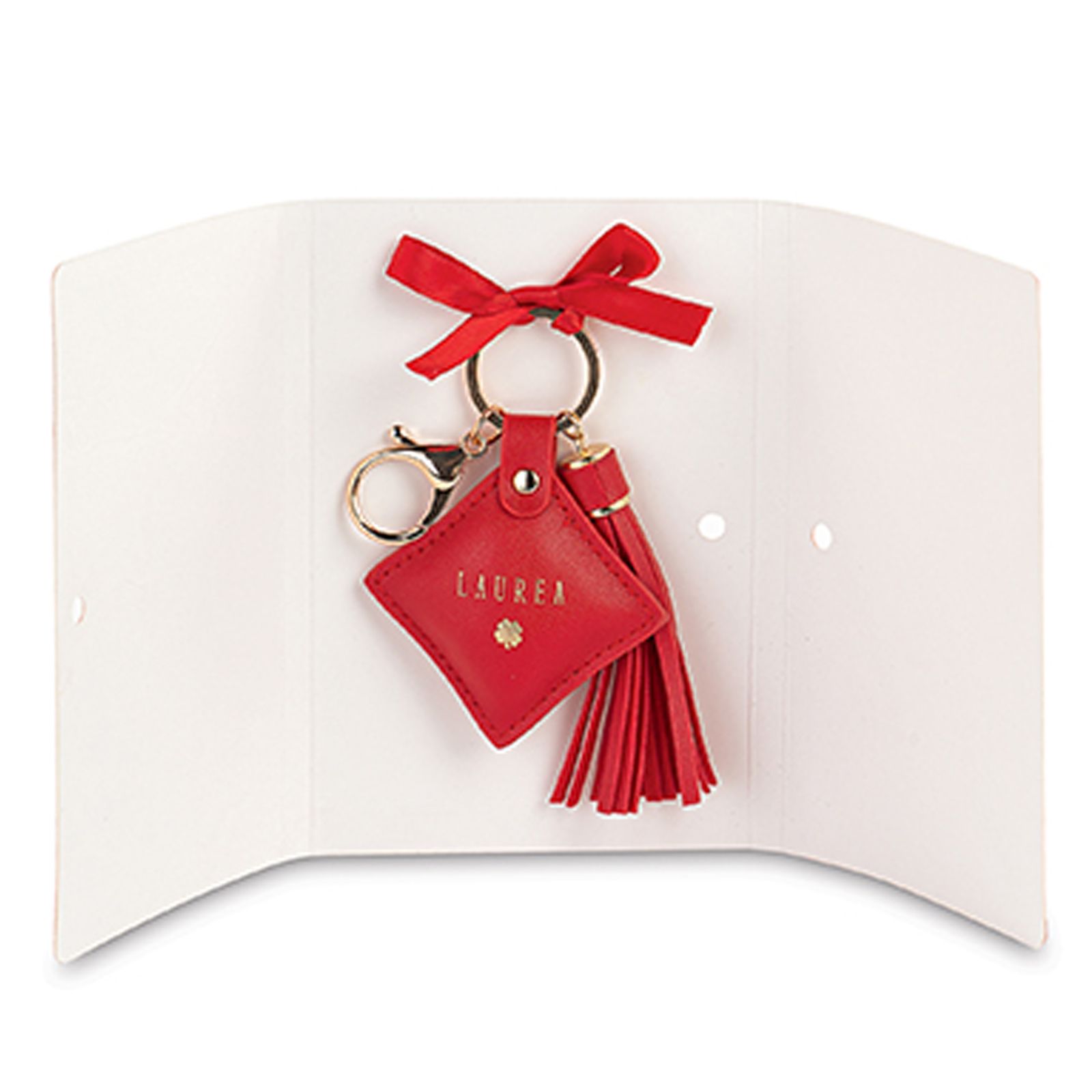 Solo per te in esclusiva, la nuova linea di portachiavi laurea in ecopelle! Bellissimo portachiavi con finitura dorata e gancio, a forma di rombo in ecopelle rossa con scritta dorata "Laurea" e quadrifoglio, provvisto di nappina rossa anch'essa in ecopelle.