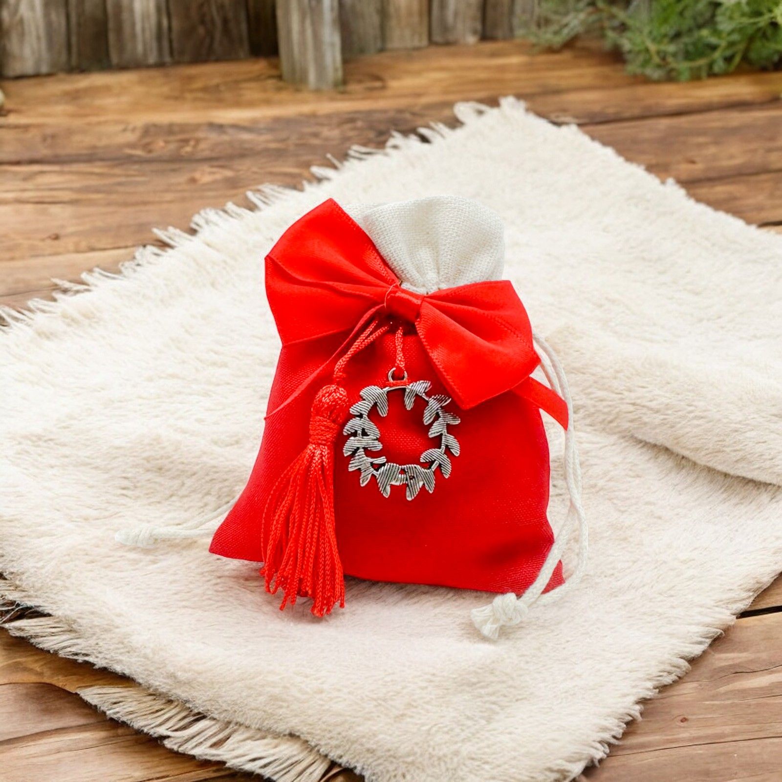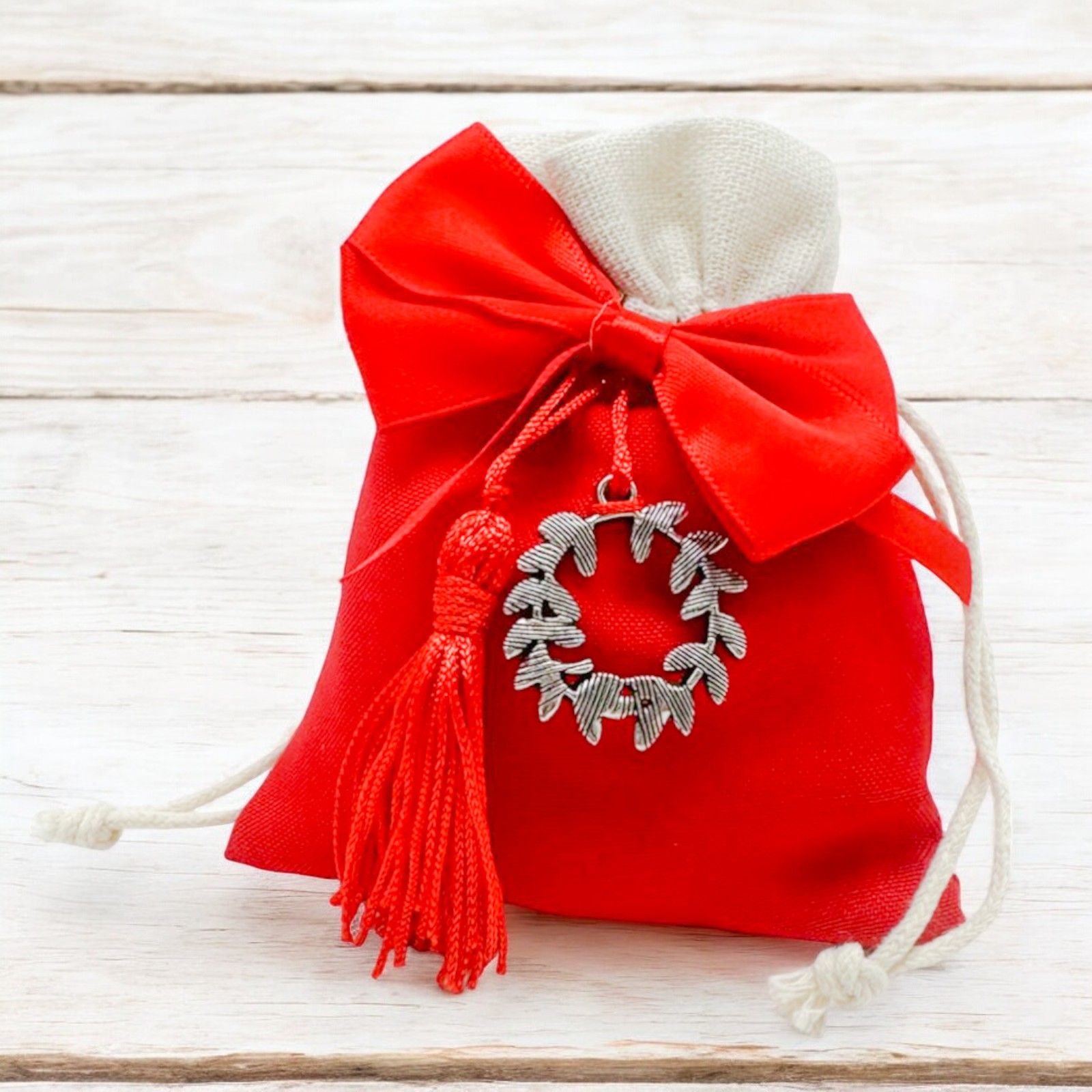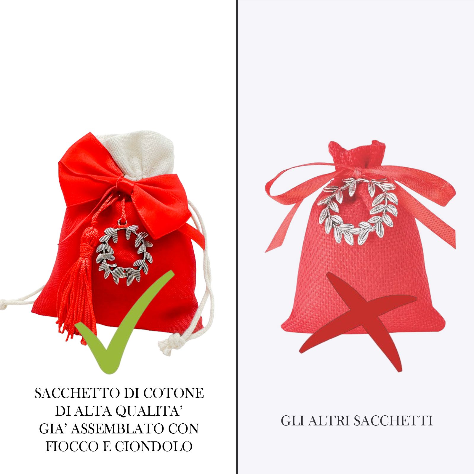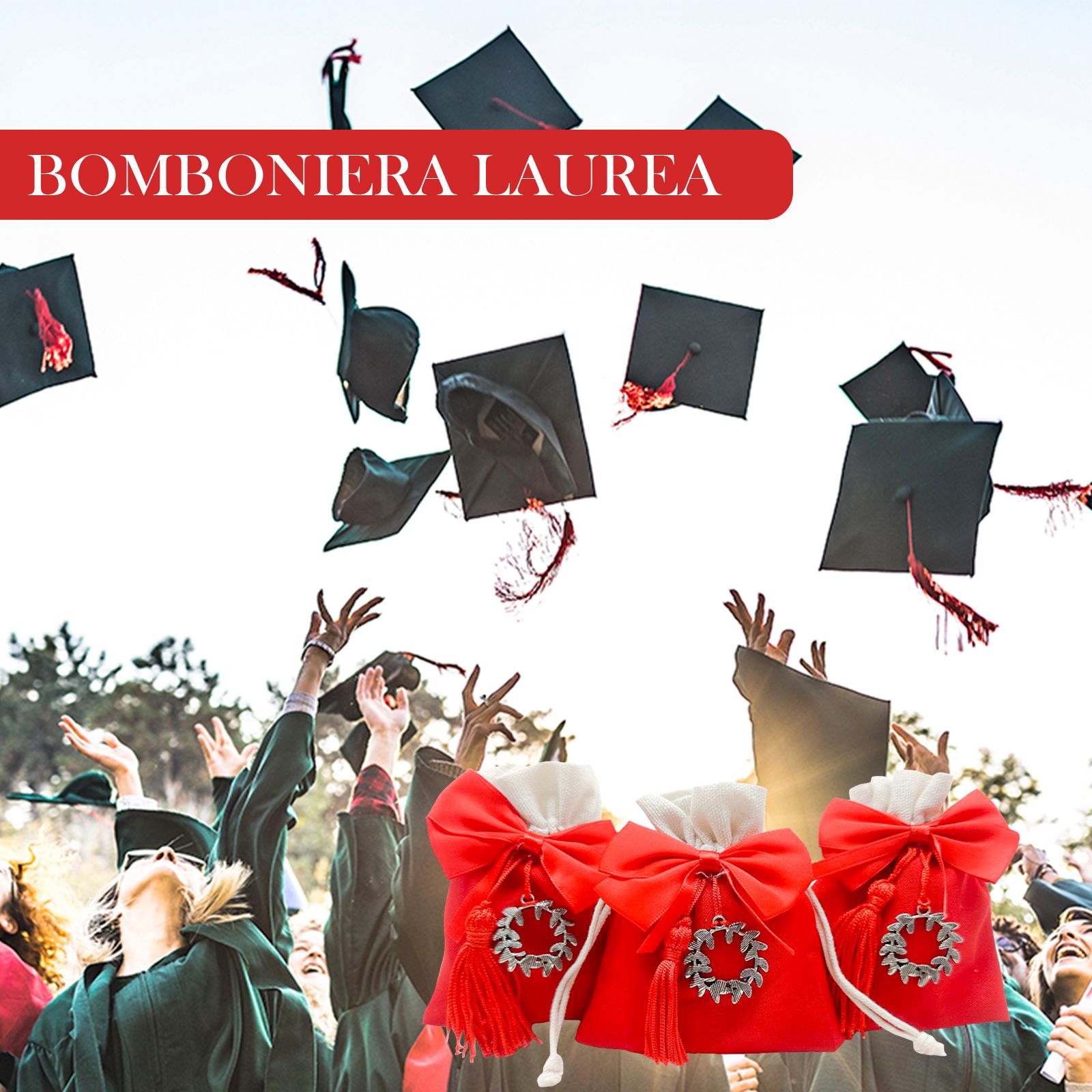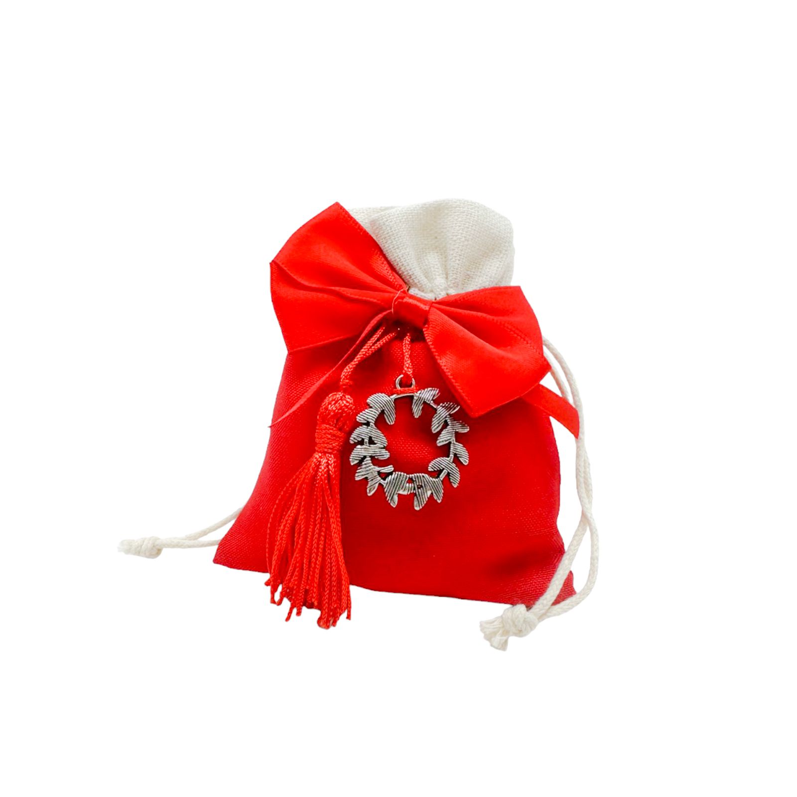 Il Sacchettino Rosso con Ciondolo Corona d'Alloro per laurea è la bomboniera perfetta per celebrare un importante traguardo accademico. Realizzato con cura e attenzione ai dettagli, questo sacchettino portaconfetti incanta con la sua combinazione di colori rosso e avorio, arricchita da un grazioso fiocco e un ciondolo in metallo zama a forma di corona d'alloro, completato da una nappina.